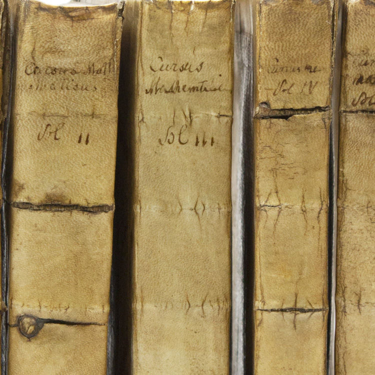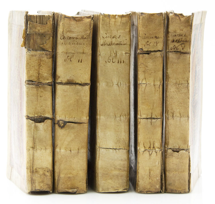 London, 1712. First edition in English. 205 engraved plates. [6], x, 288; [24], 92, 156, [284]; [16], 215, [1 (blank)], [14], 204, [8]; [30], 185, [7], 72, [8]; [16], 166, [18], 131, [11]pp., half-title in volume 1. 5 vols. 8vo. Contemporary half vellum from scraps, with marbled paper panels on boards. Bookplate of George Craster. First edition in English. 205 engraved plates. [6], x, 288; [24], 92, 156, [284]; [16], 215, [1 (blank)], [14], 204, [8]; [30], 185, [7], 72, [8]; [16], 166, [18], 131, [11]pp., half-title in volume 1. 5 vols. 8vo. Ozanam's Cours de mathematiques, first published in 1693, contains sections on algebra and Euclid's Elements, arithmetic, trigonometry, geometry, fortification, mechanics, perspective, geography and dialling.