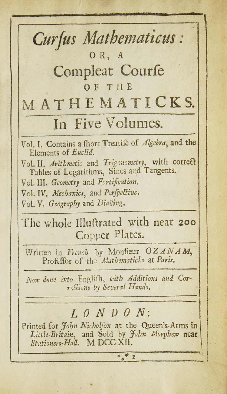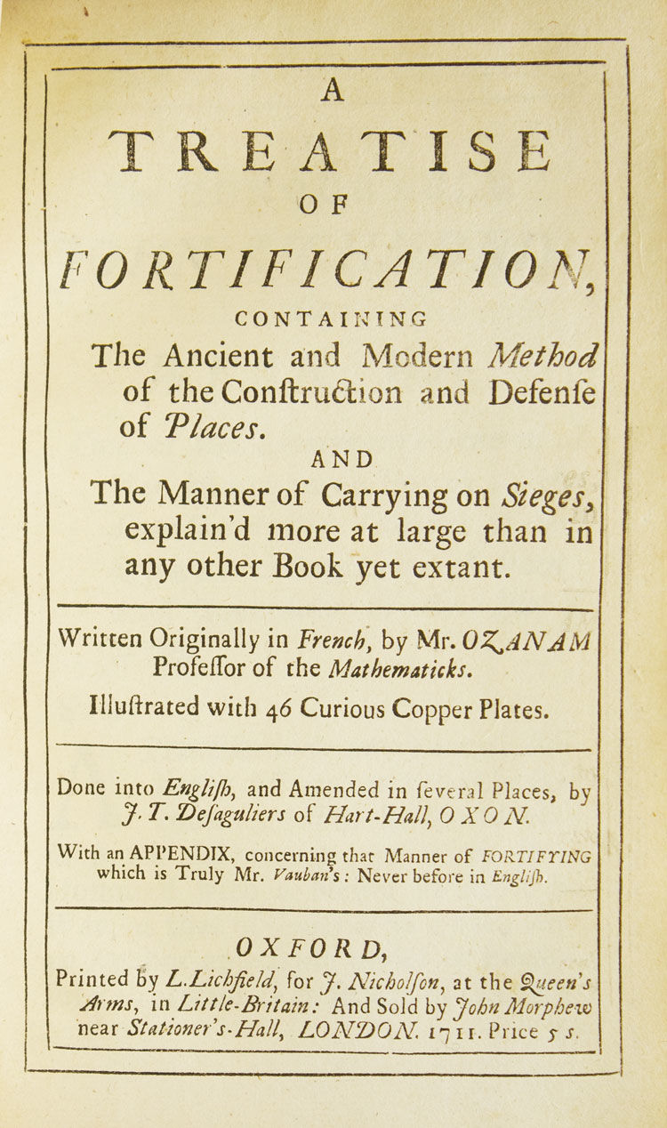 John Theophilus Desaguliers, whose name is mentioned on the title-pages of volumes 4 and 5, published his translation of Ozanam's treatise on fortification separately in 1711 (the treatise here forms the second part of volume 3, with its original title-page).