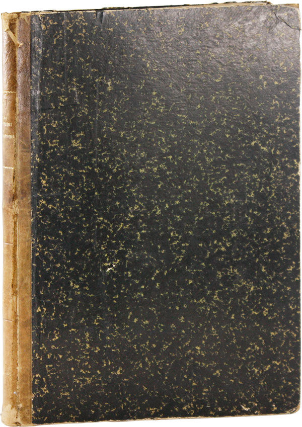 Paris: Chez J.-P. Migne, 1862. Folio (37cm). Contemporary half-calf over marbled boards; coated endpapers; [2]pp preliminary text ("Avertissement") and 77 leaves of plates, printed recto-only; two folding. Also included here (though not called for in the table) are two large albumen photographic facsimiles, one reproducing a rendering of the interior of the Hagia Sophia; the other a facsimile of a fragment of a map of the Holy Land. Scuffing to the leather spine, causing some cosmetic damage but not affecting the volume's structure; board edges rubbed; a few of the plates folded and/or mildly frayed at corners and margins, one with a tissue-paper repair in margin; still a fresh, attractive example, Very Good or better. Collated and complete.