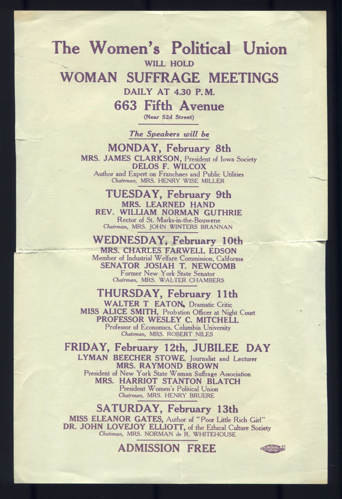 New York: Women’s Political Union, 1915. Very Good. First edition. Broadside measuring 6” x 9”. Advertising a schedule of notable speakers to appear at Woman Suffrage Meetings for one week (February 8th – 13th), including: Mrs. James Clarkson, Mrs. Learned Hand, Senator Josiah T. Newcomb, Miss Alice Smith, Lyman Beecher Stowe, and Mrs. Harriot Stanton Blatch. Lightly creased along old folds, a few short closed tears at the edges, very good. *OCLC* locates only one copy.