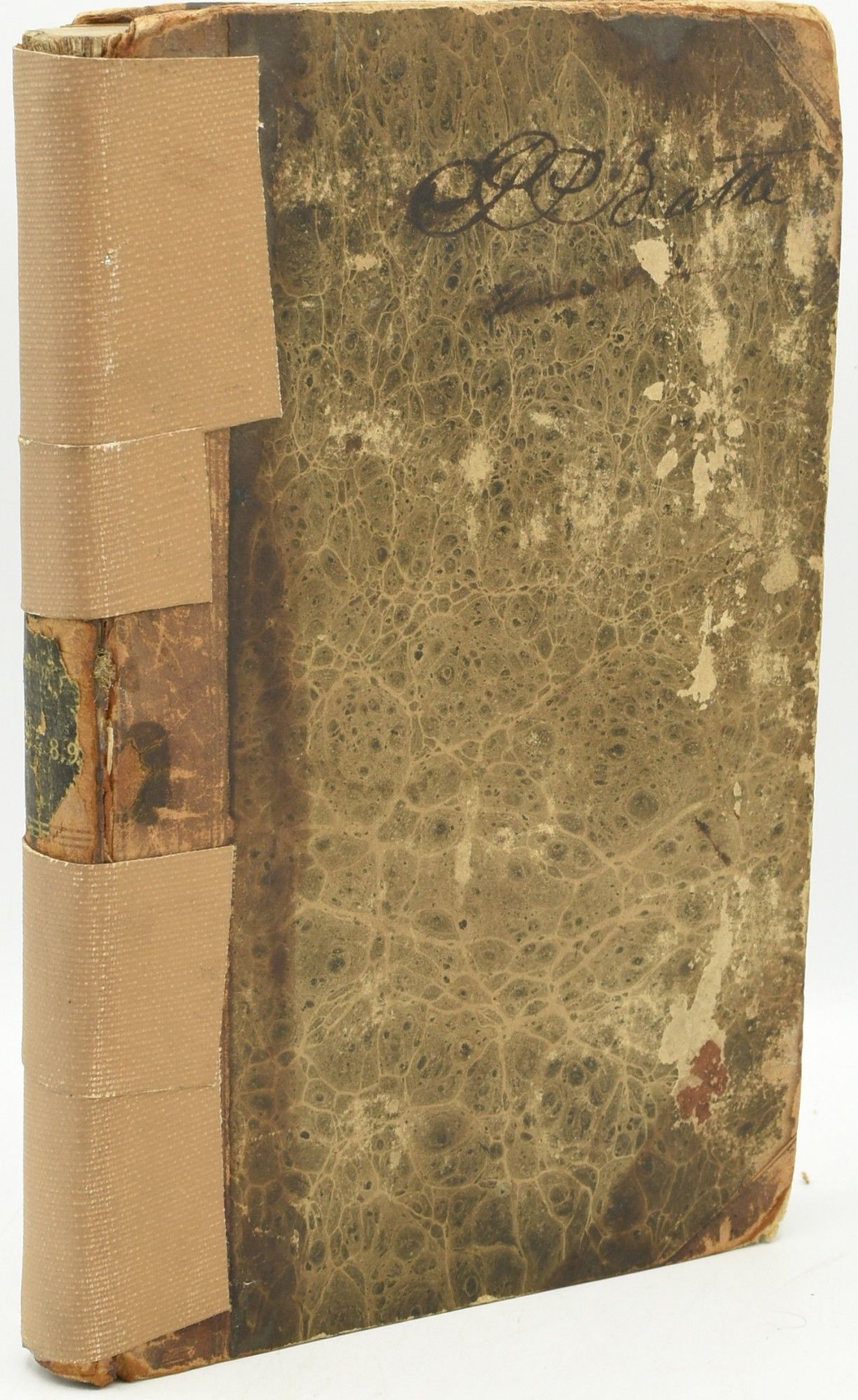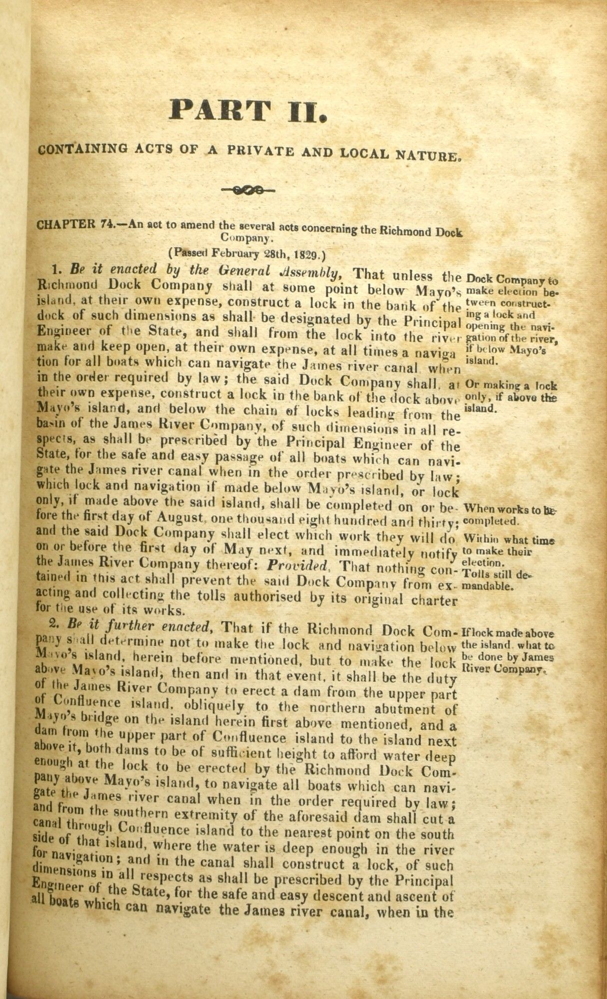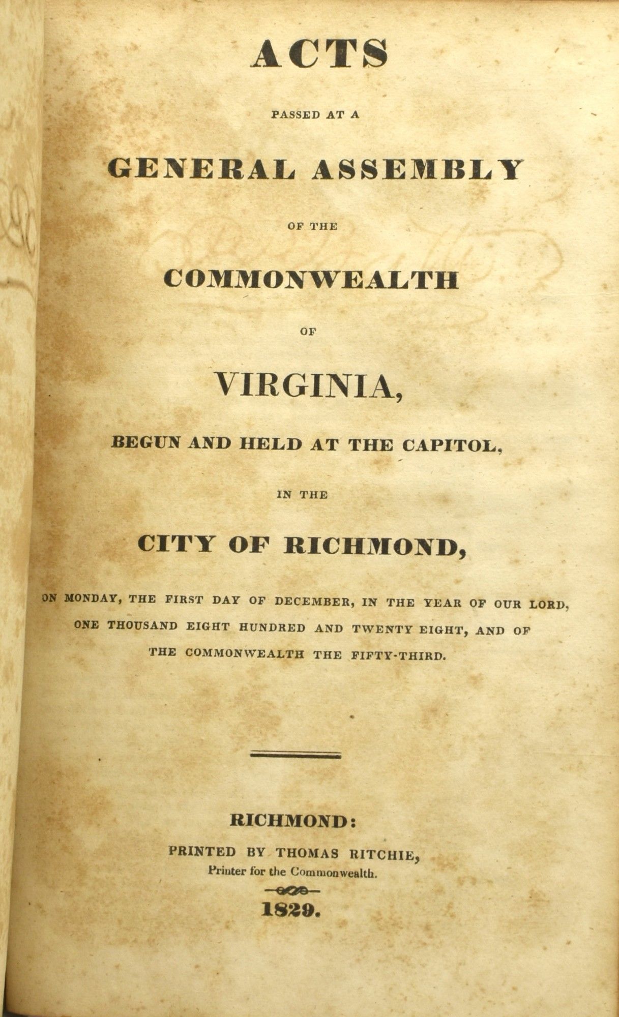 Richmond: Thomas Ritchie. 8vo.; in half-calf over marbled boards; spine has perished and binding held together with old library tape; the Acts of Assembly are from 1824; 1825; 1826; 1827; 1828; Part II of 1829; the Acts of 1824 are lacking the Index to Part II. With the signature of Peter Poythress Batte of Peterburg; contains much on Rivers; Turnpikes; the James River Company.~~Not pretty to look at, but contains a wealth of information about the laws of the Commonwealth in the early days of the Republic.