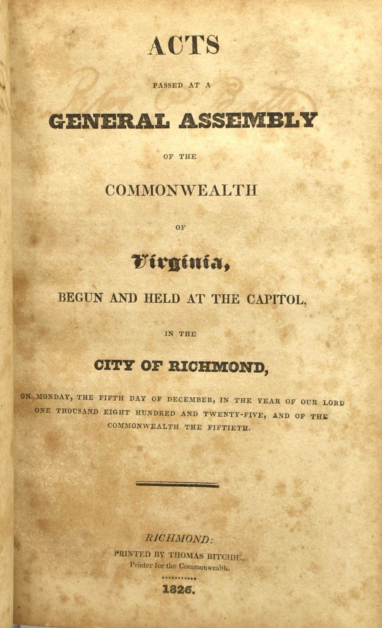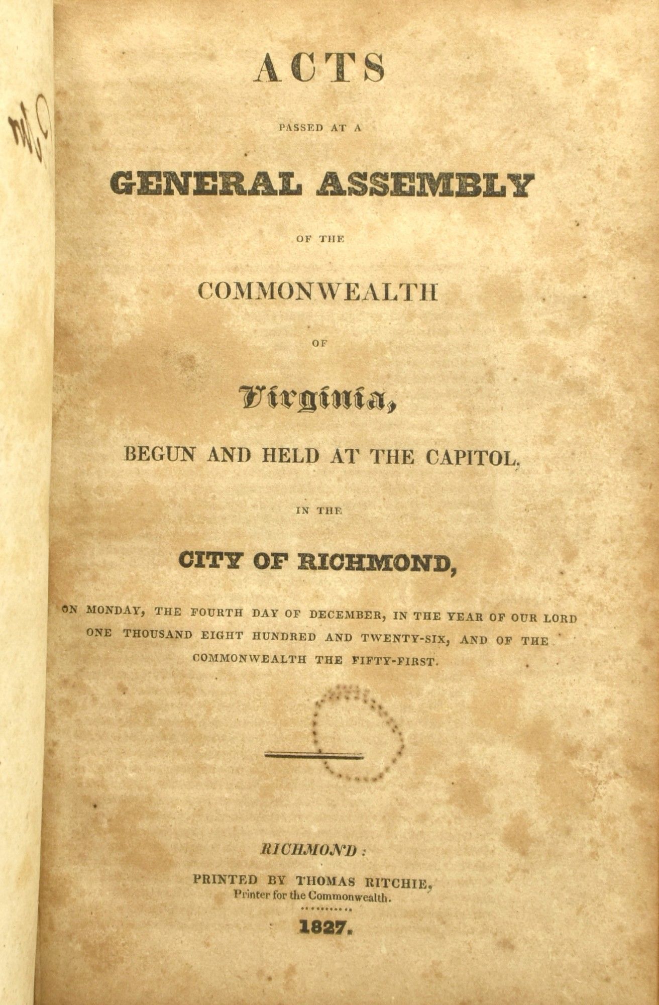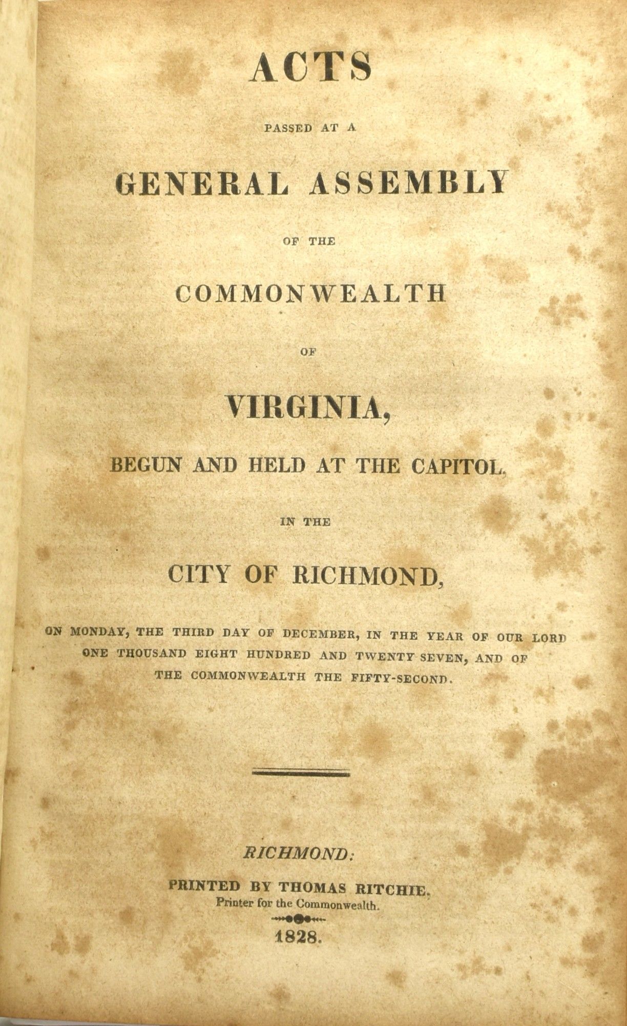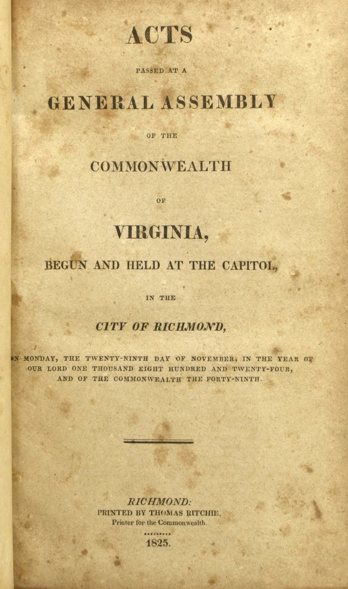 [VIRGINIA] [LAW] [FIVE ACTS BOUND TOGETHER] ACTS OF THE GENERAL ASSEMBLY OF THE COMMONWEALTH OF VIRGINIA, BEGUN AND HELD AT THE CAPITOL IN THE CITY OF RICHMOND, ON MONDAY THE TWENTY-NINTH DAY OF NOVEMBER IN THE YEAR OF OUR LORD ON THOUSAND EIGHT HUNDRED AND TWENTY-FOUR, AND OF THE COMMONWEALTH THE FORTY-NINTH; [WITH] ACTS PASSED ... ON MONDAY THE FIFTH DAY OF DECEMBER ... [1825]; [WITH] ACTS PASSED ... ON MONDAY THE FOURTH DAY OF DECEMBER ... [1826]; [WITH] ACTS PASSED ... ON MONDAY THE THIRD DAY OF DECEMBER ... [1827]; [WITH] ACTS PASSED ... ON MONDAY THE FIRST DAY OF DECEMBER ... [1828]; [WITH] PART II. CONTAINING ACTS OF A PRIVATE AND LOCAL NATURE