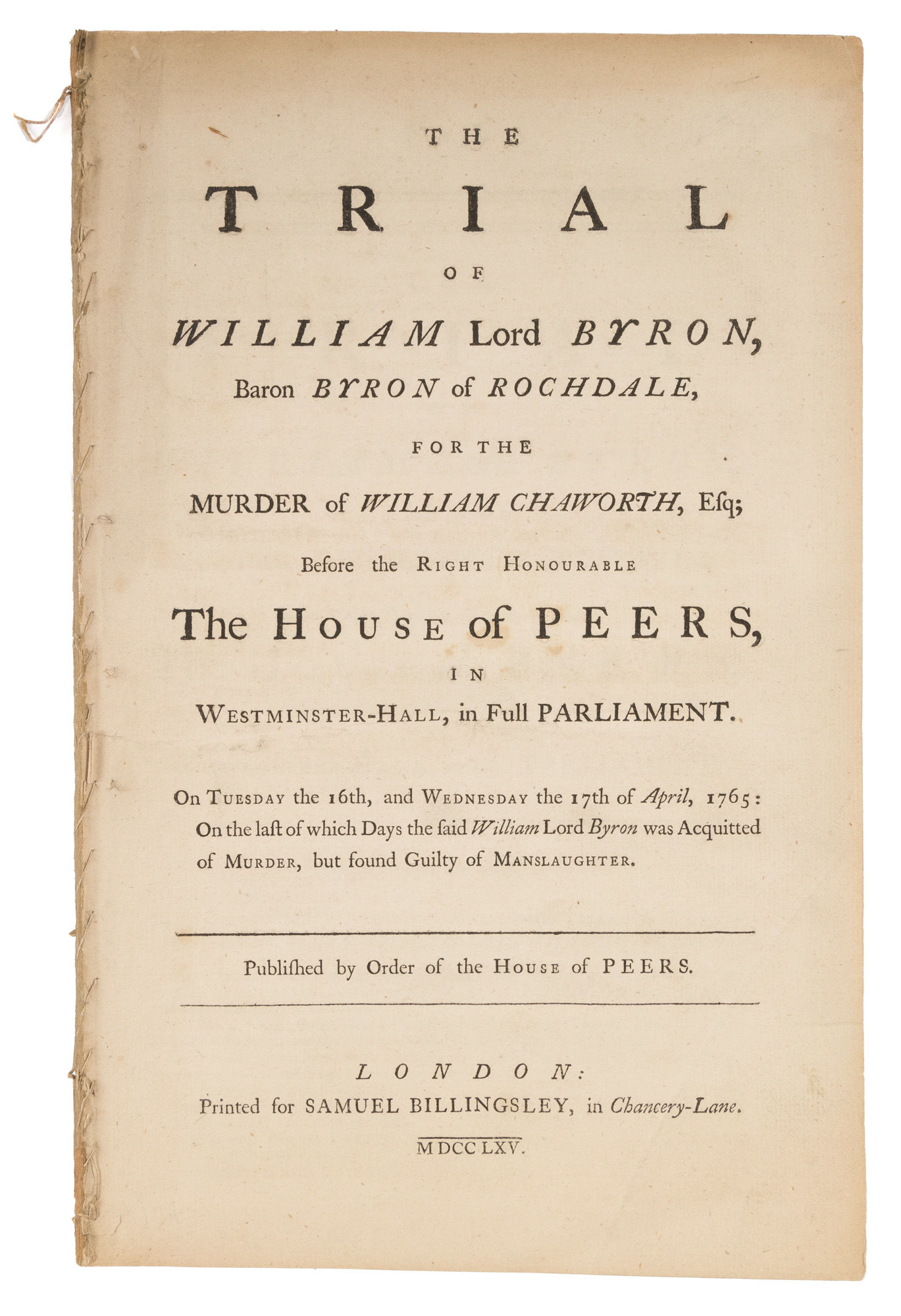 1765. That Absurd Relic of Gothic Barbarism" [Trial]. Byron, William, Lord [1722-1798], Defendant. The Trial of William Lord Byron, Baron Byron of Rochdale, For the Murder of William Chaworth, Esq; Before the Right Honourable the House of Peers, In Westminster-Hall, In Full Parliament. On Tuesday the 16th, And Wednesday the 17th of April, 1765: On the Last of Which Days the Said William Lord Byron was Acquitted of Murder, But Found Guilty of Manslaughter. Published by Order of the House of Peers. London: Printed for Samuel Billingsley, 1765. [ii], 47, [1] pp. Lacking initial imprimatur leaf. Folio (12-1/2" x 8"). Stab-stitched pamphlet, disbound and later resewn, edges speckled red. Light toning, occasional light foxing, light soiling and spotting in a few places, slightly heavier to first and final leaves. $200. * First edition. "April 16th came on before the house of peers in Westminster-hall, the trial of William Lord Byron for killing Mr. Chaworth a gentleman of Nottinghamshire, in a duel at the Star and Garter tavern in Pall Mall. After examining witnesses as to the circumstances of the encounter, the Lords next day acquitted the prisoner of murder, declaring him only guilty of manslaughter: and as by an old statute [1 Edw. VI. c. 12], in all cases wherein peers are allowed the benefit of clergy, they are dismissed without burning in the hand, loss of inheritance, or corruption of blood; Lord Byron was enlarged on paying his fees. Much might be said on the custom of duelling, that absurd relic of gothic barbarism; which still compels every man to risk his life at demand, on the most frivolous, or even the most insulting and cruel occasions. The laws of honour have so little connexion with those of honesty, that a man may support his claim to the title of a gentleman by the former, after he has forfeited all pretensions to the character by the latter. Sir John Brute is made to state the behaviour of some men of honour very justly when he says-" He comes to my house, eats my meat, lies with my wife, dishonours my family, gets a bastard to inherit my estate; and when I ask a civil account of all this,-sir, says he, I wear a sword!": Noorthouck, A New History of London: Including Westminster and Southwark (1773), Volume I:419-450. English Short-Title Catalogue T150380.