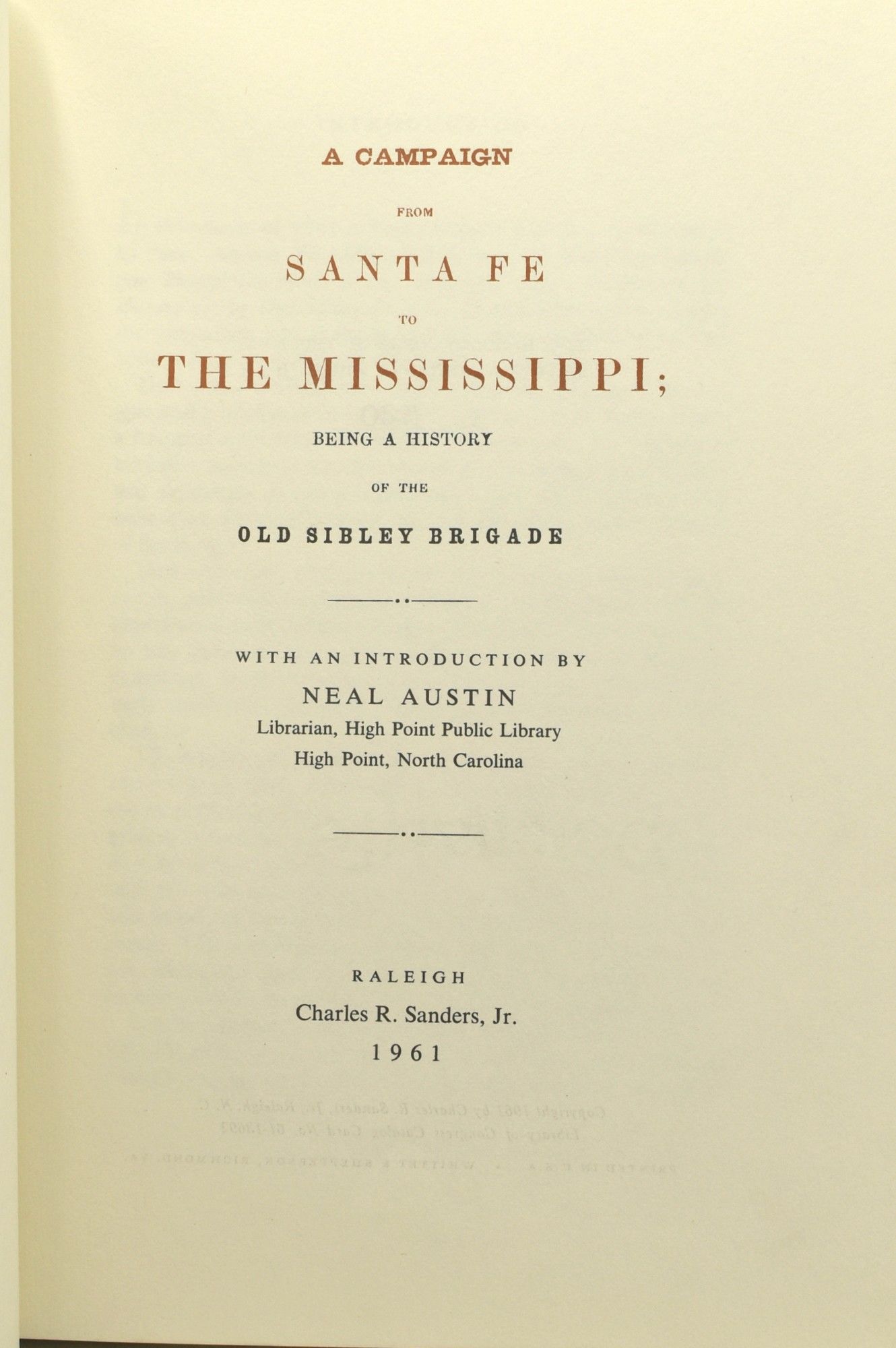 [SIGNED] [CIVIL WAR] [PRESENTATION] A CAMPAIGN FROM SANTA FE TO THE MISSISSIPPI: BEING A HISTORY OF THE OLD SIBLEY BRIGADE. CHALMAR PUBLICATION. CONFEDERATE SERIES NO. 1