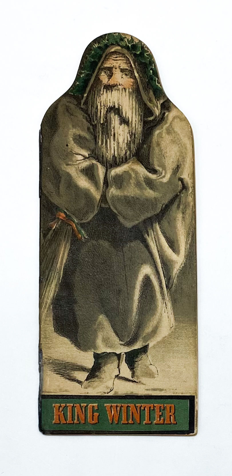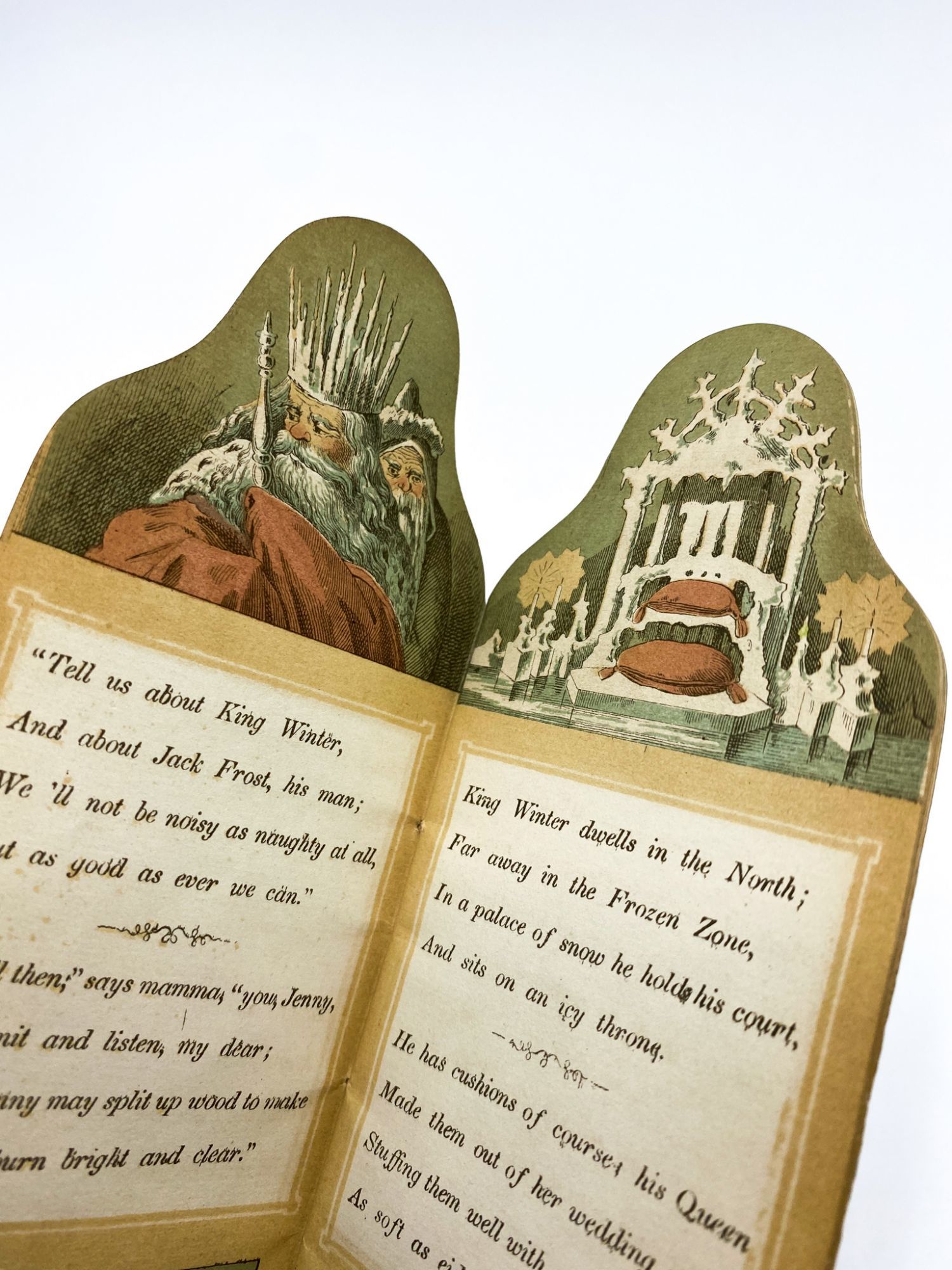 Hamburg: Gustav W. Seitz, 1859. Near fine.. First edition of this beautiful shape book, detailing the seasonal activities of the Santa Claus-like KING WINTER and his assistant Jack Frost — in notably sharp condition. KING WINTER's job is distinctly Santa Claus-like: he inquires about the behavior of children, trims Christmas trees, and delivers gifts, all while wearing a red and white ensemble. Meanwhile, his unnamed wife and his servant Jack Frost go about the actual duties of winter, dusting the world with snow and creating frozen lakes. Indeed, it is Jack frost with his "stiff as a crutch" white beard who lends his shape to this book – the author was clearly aware of who was truly bringing winter to the land.