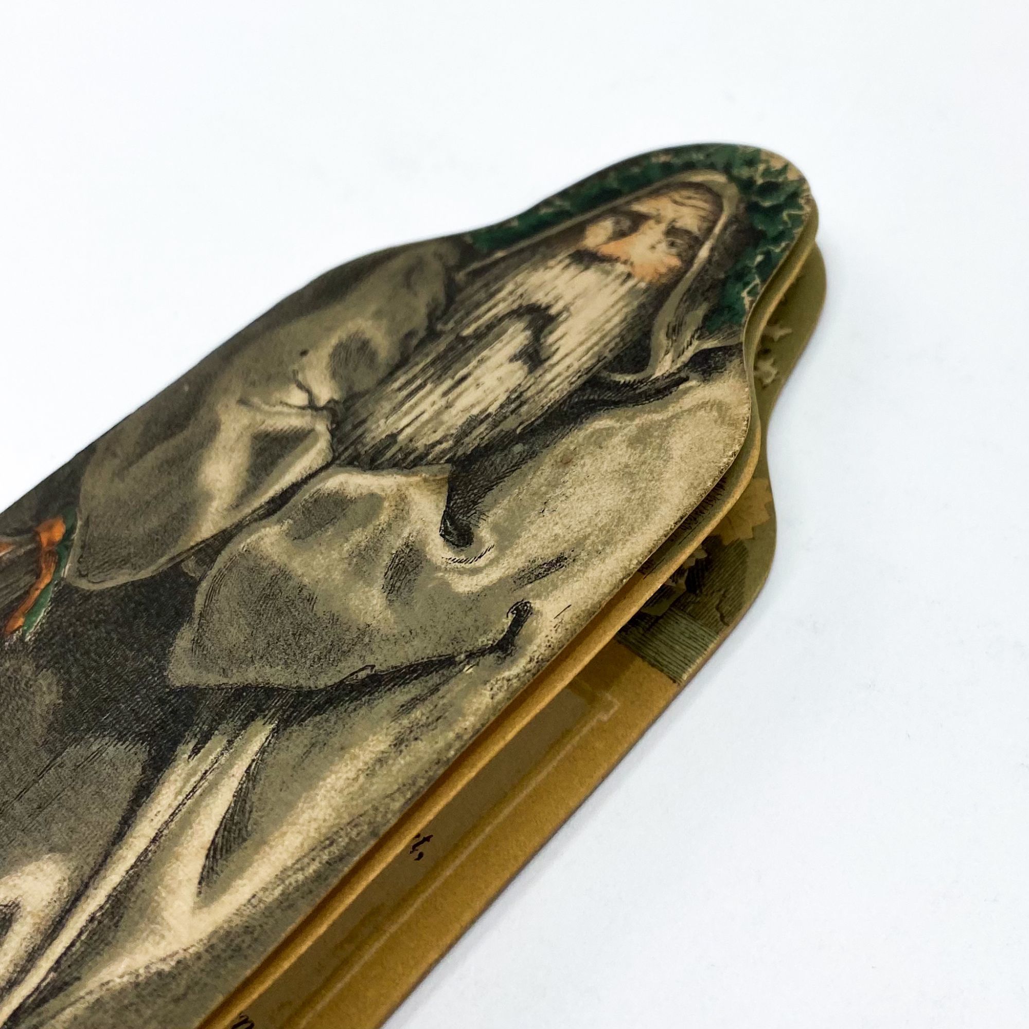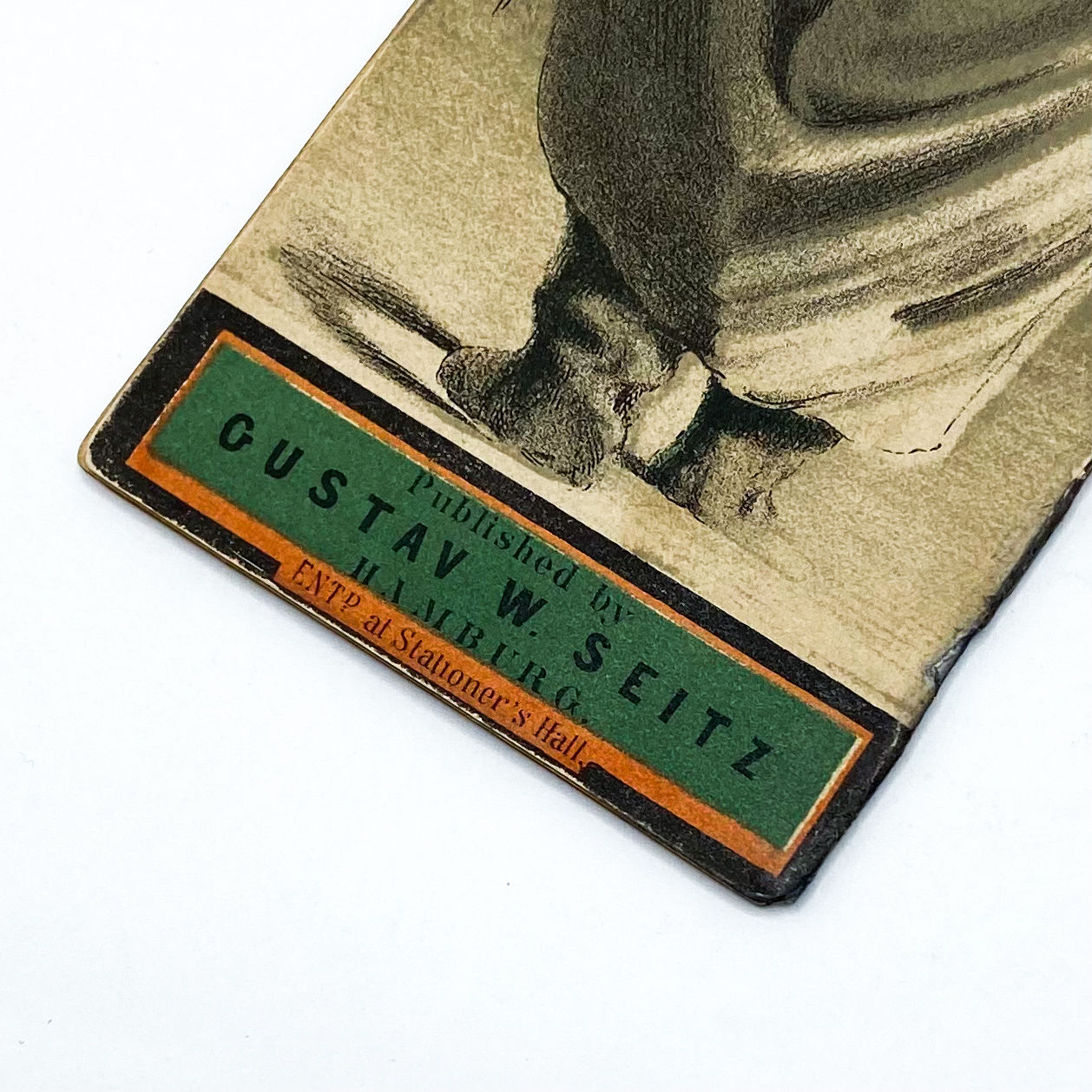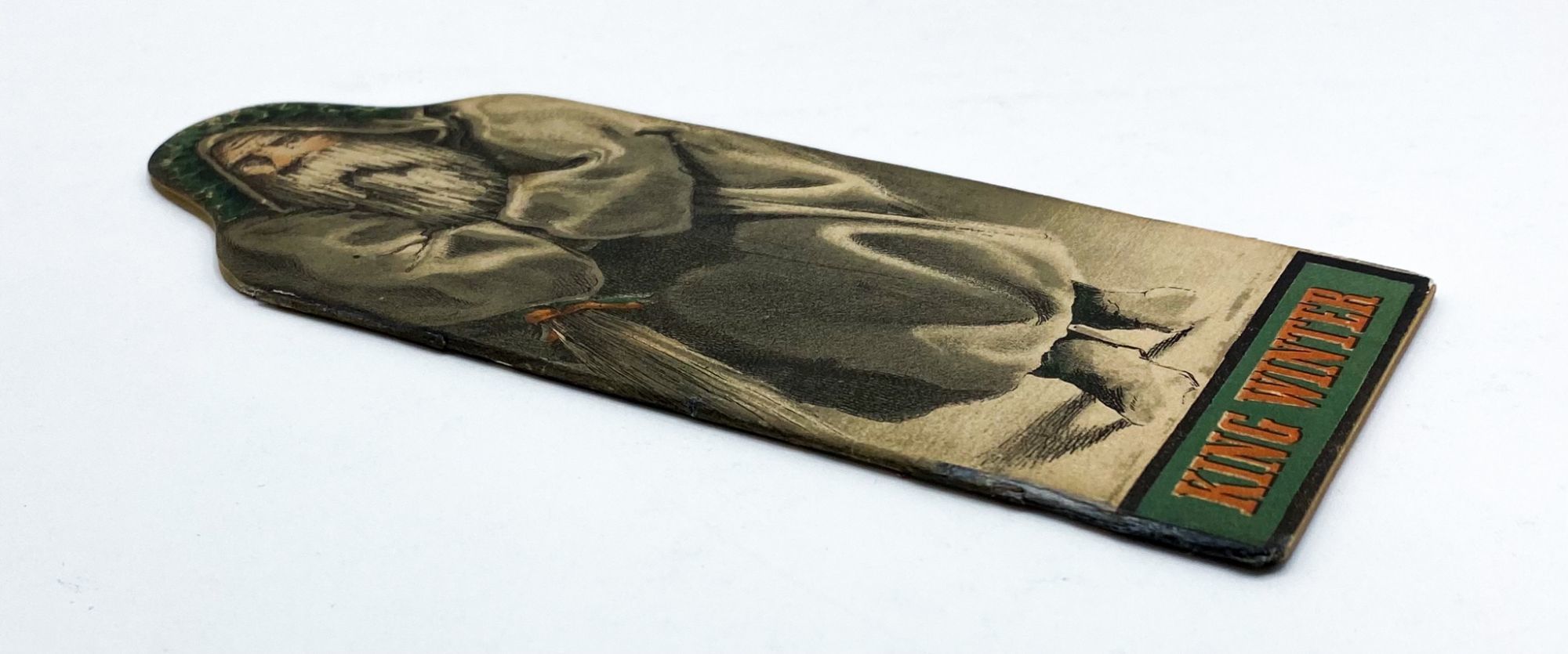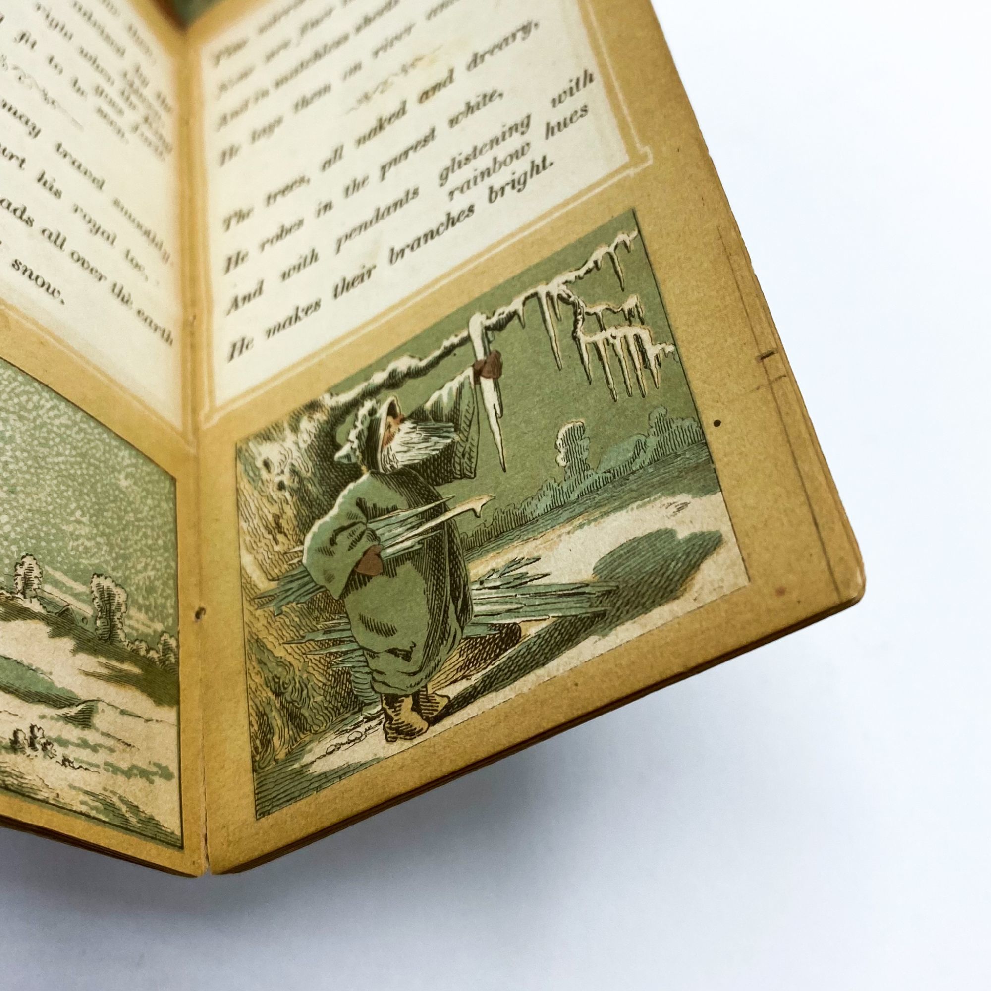 This edition is nearly identical to Louis Prang's shape book of the same name. Prang made waves in 1863 with his publication of the "first mass-produced book to deviate from a rectilinear format" in the US, but the Library of Congress holds a Seitz copy of KING WINTER that is dated 1859 (PUBLIC DOMAIN REVIEW). It is unclear which publisher was copying which; either way, Seitz editions are scarcer on the market than those by Prang. 6.75'' x 2.75''. Original shaped color pictorial wrappers. Illustrated with chromolithographs. [8] shaped leaves. Wrapper with mild edgewear; spine with thin, careful repair. Leaves with occasional scattered foxing. Sharp and bright.