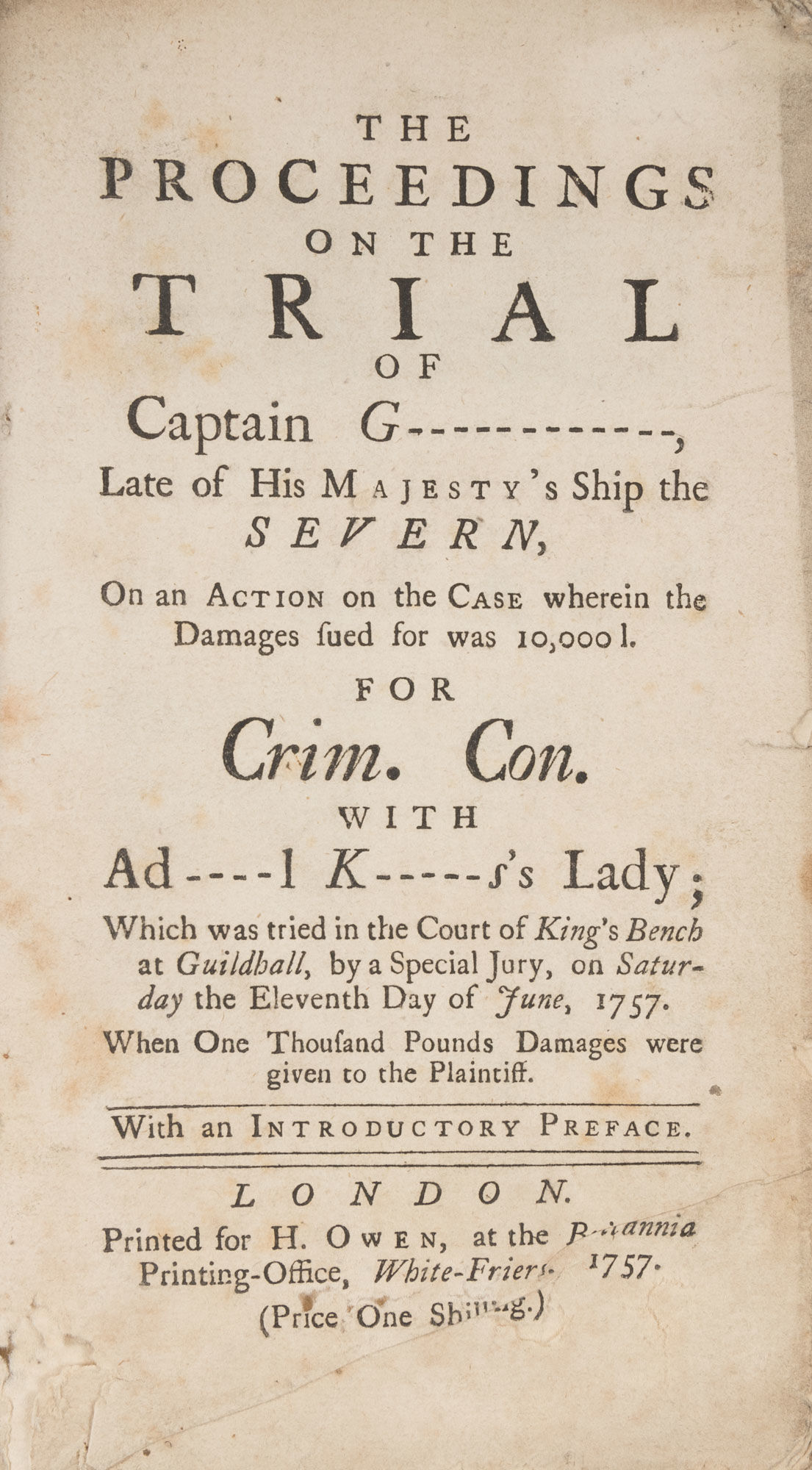 1757. A "Penurious Old Reptile" [Trial]. Gambier, James, Defendant [1723-1789]. The Proceedings on the Trial of Captain G------, Late of His Majesty's Ship the Severn, On an Action on the Case Wherein the Damages Sued for was 10,000 l. for Crim. Con. With Ad----l K-----s's Lady; Which was Tried in the Court of King's Bench at Guildhall, By a Special Jury, On Saturday the Eleventh Day of June, 1757. When One Thousand Pounds Damages were Given to the Plaintiff. With an Introductory Preface. London: Printed for H. Owen, At the Britannia Printing-Office, White-Friers, 1757. vii, 3-56 pp. Octavo (8" x 4-1/2"). Stab-stitched pamphlet in later plain wrappers, typed label with title and date to front wrapper. Light soiling and creasing to wrappers. Light toning to interior, occasional light foxing, light soiling and tiny wear holes in a few places, crease and a few small holes to foot of title page without loss to legibility, light edgewear and small tears to fore-edges of a few leaves, a few small thin spots to p. 35 and leaf E4 (pp. 33-34), which is separating at foot but secure. $450. * First edition, one of four London issues from the same year. Admiral Sir Charles Knowles, the plaintiff, accused Captain James Gambier of adultery with his second wife, Maria de Bouget [1733-1796]. Gambier, widely disliked by his men and described by one of them as a "penurious old reptile," failed to win the sympathy of the jury and was fined ?1,000 (Oxford Dictionary of National Biography). English Short-Title Catalogue N20182.