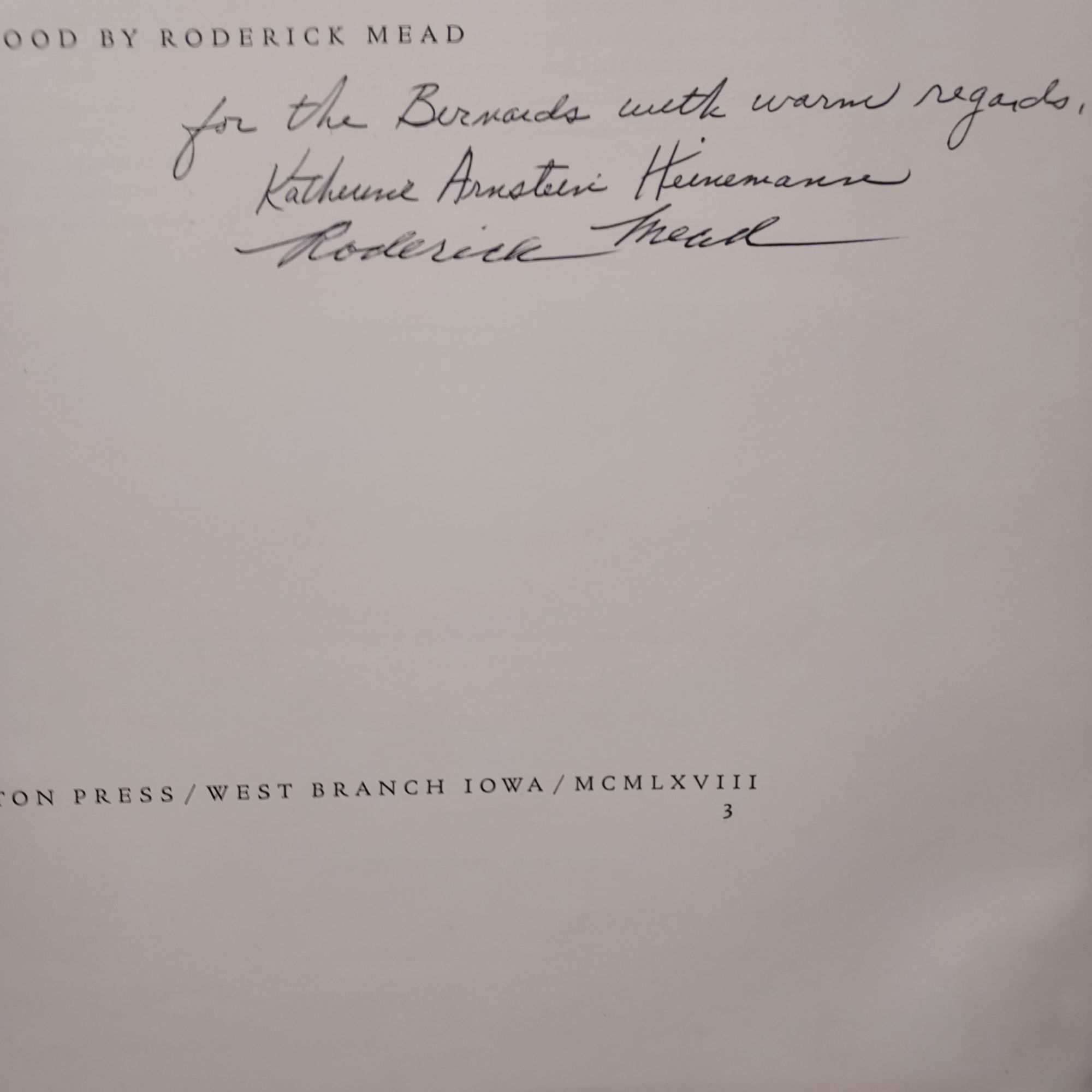 West Branch, Iowa: The Cummington Press, 1968. Limited Edition. Hardcover. Very good. Roderick Mead. SIGNED. Slim oblong quarto [22 cm] White cloth over boards. The covers have a general layer of light soiling, internally fine. Masterful, playful, provocative verse accompanied by stunning wood engravings. #20 of 236 copies. This copy is inscribed on the title page by author and illustrator.