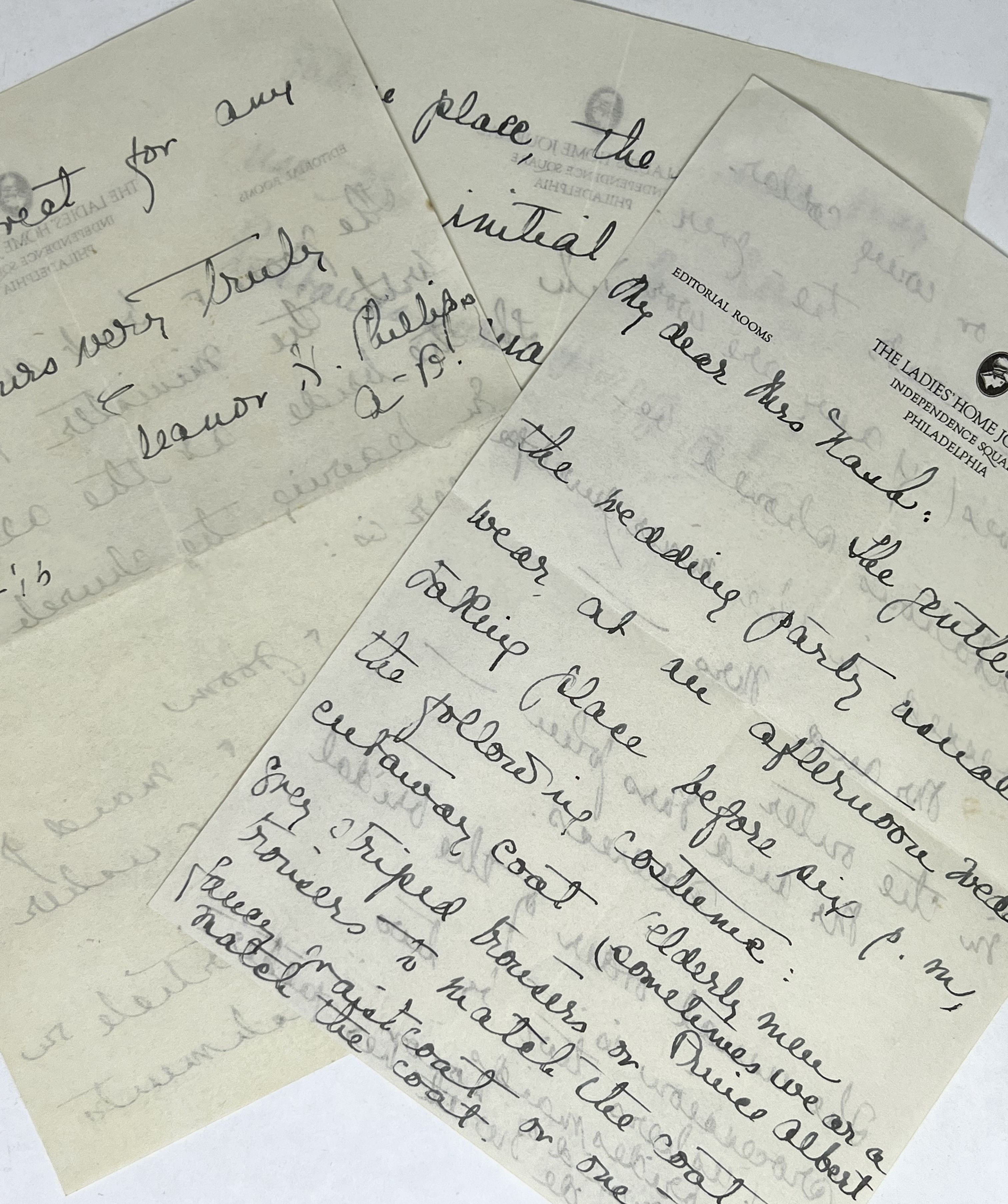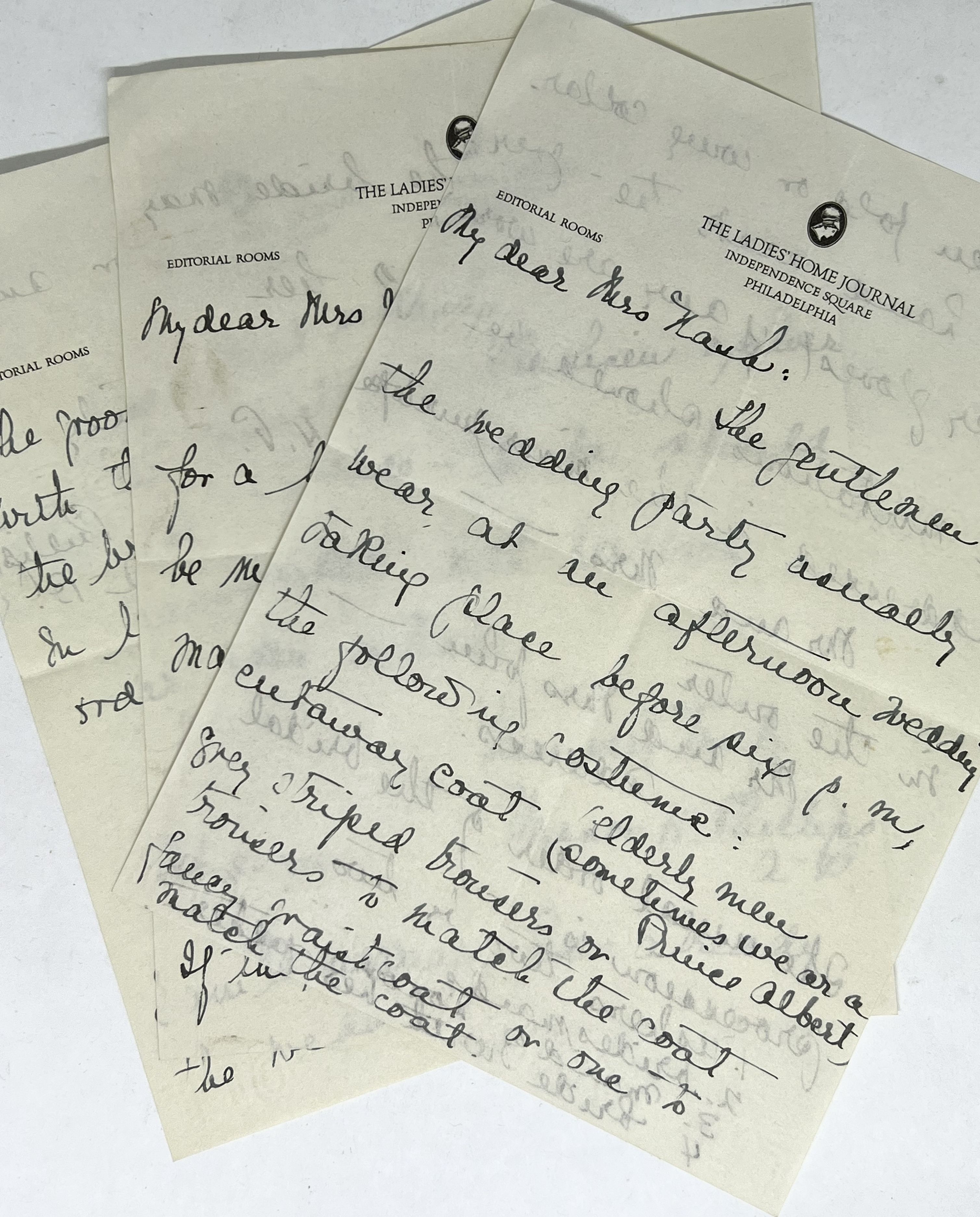 1916. Loose_leaf. Paper. Very good. Two letters (3 pages) 22 x 16 cm. Handwritten letters on stationary (The Ladies Home Journal - Independence Square - Philadelphia - Editorial Rooms) to a Mrs. Nash, offering advice on wedding etiquette including guidelines on monograms for silver and linens and what men should wear at weddings and the usual order of the bridal party. Two dates: Feb.8, 1916 & Dec. 24, 1916. Clean copy.