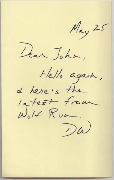 Eugene, OR: Wolf Run, 1977. First edition. Softcover. Printed in an edition of 250 copies. A single short story by Woolf. A near fine copy in stapled wrappers with some minor wear and light toning to the edges. Signed and inscribed by Woolf to John O'Brien who was the founder of the literary journal "Review of Contemporary Fiction" as well as the Dalkey Archive. Also includes a laid in handwritten note from Woolf to O'Brien presenting this book. A nice association copy and uncommon signed.
