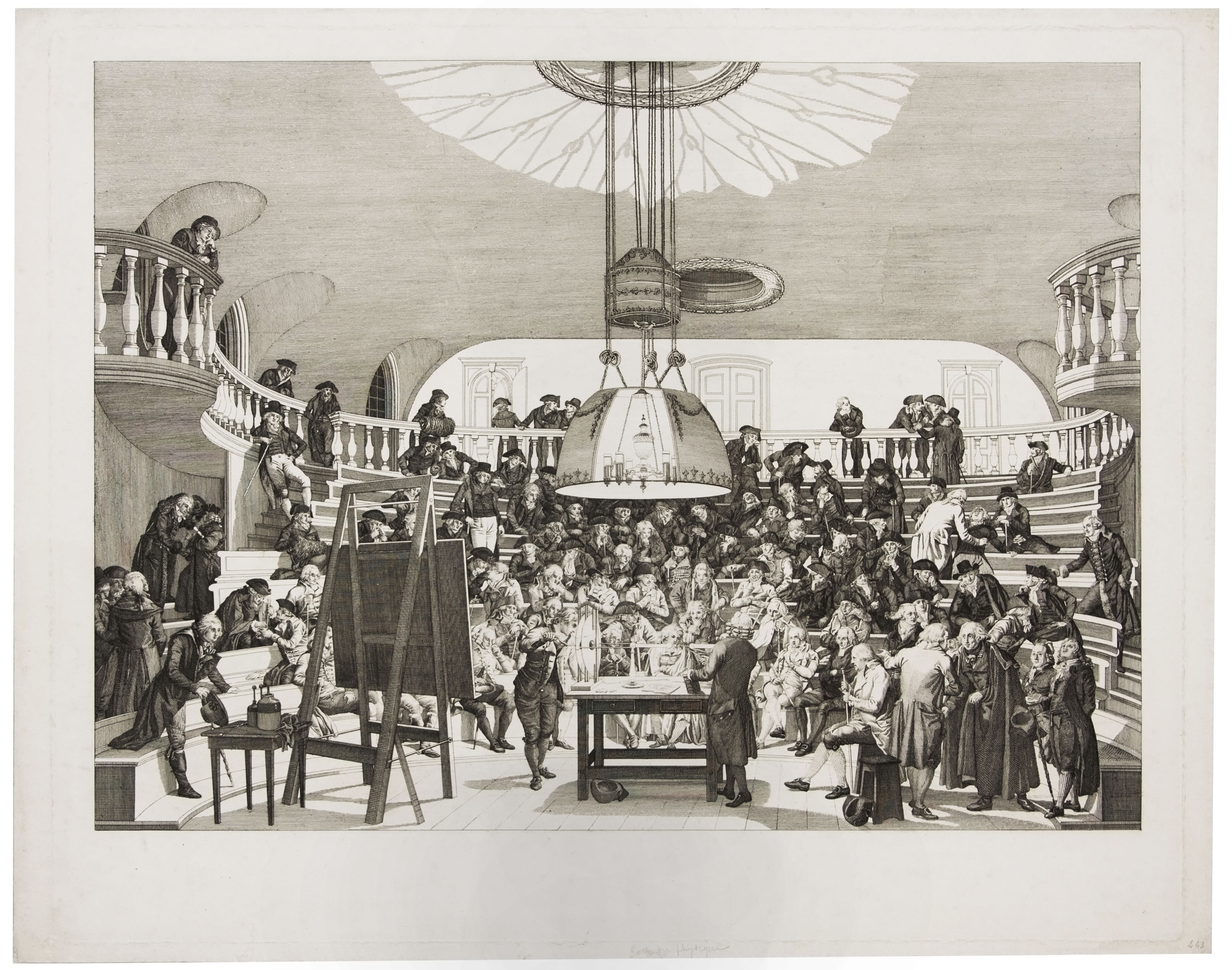 The event was originally captured by Jacques Kuyper (1761-1808) and Pieter Pietersz Barbiers I (1749-1842) in their 1794 drawing "Zaal der Natuurkunde in het gebouw der Maatschappyë Felix Meritis binnen Amsterdam = Salle de Phijsique dans l'Edifiçe de la société Felix Meritis a Amsterdam"[Hall of Physics in the Building of the Felix Meritis Society in Amsterdam]. Reinier Vinkeles (1741-1816) later reworked the drawing into this engraving. Vinkeles produced three other engravings of the Felix Meritis Society, which depicted the music hall, the drawing room, and "the audience in the building of the Felix Meritis Society." In the U.S., only two institutions appear to have the complete set of four prints: Princeton and the Museum of Fine Arts (Houston, TX).