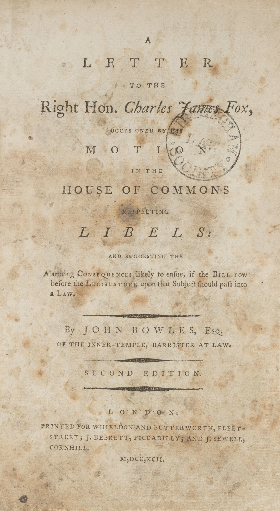 1792. Against Trial by Jury In Libel Cases Bowles, John [1751-1819]. A Letter to the Right Hon. Charles James Fox, Occasioned by His Motion in the House of Commons Respecting Libels: And Suggesting the Alarming Consequences Likely to Ensue, If the Bill Now Before the Legislature Upon that Subject Should Pass into a Law. London: Printed for Whieldon and Butterworth, J. Debrett and J. Sewell, 1792. [iv], 34 pp. Half-title lacking. Octavo (8-1/4" x 4-3/4"). Stab-stitched pamphlet bound in recent buckram, blind rules to boards, paper title label to front board. Light toning to interior, occasional light foxing, faint dampstains in several places, moderate soiling and spotting to title page, along with small ink library stamp. $350. * Second edition. Written in opposition to what would become the Libel Act of 1792, which restored the right to decide libel cases to juries. Pitt had previously stripped juries of this right, according it to judges instead in a wave of other similar reforms meant to stem the tide of the French Revolution. Our pamphlet argues that juries may not be capable of understanding libel cases and that the knowledge of a judge is needed. An earlier edition was published in 1791. OCLC locates 10 copies of this edition in North America, none in law libraries. English Short-Title Catalogue T84415.