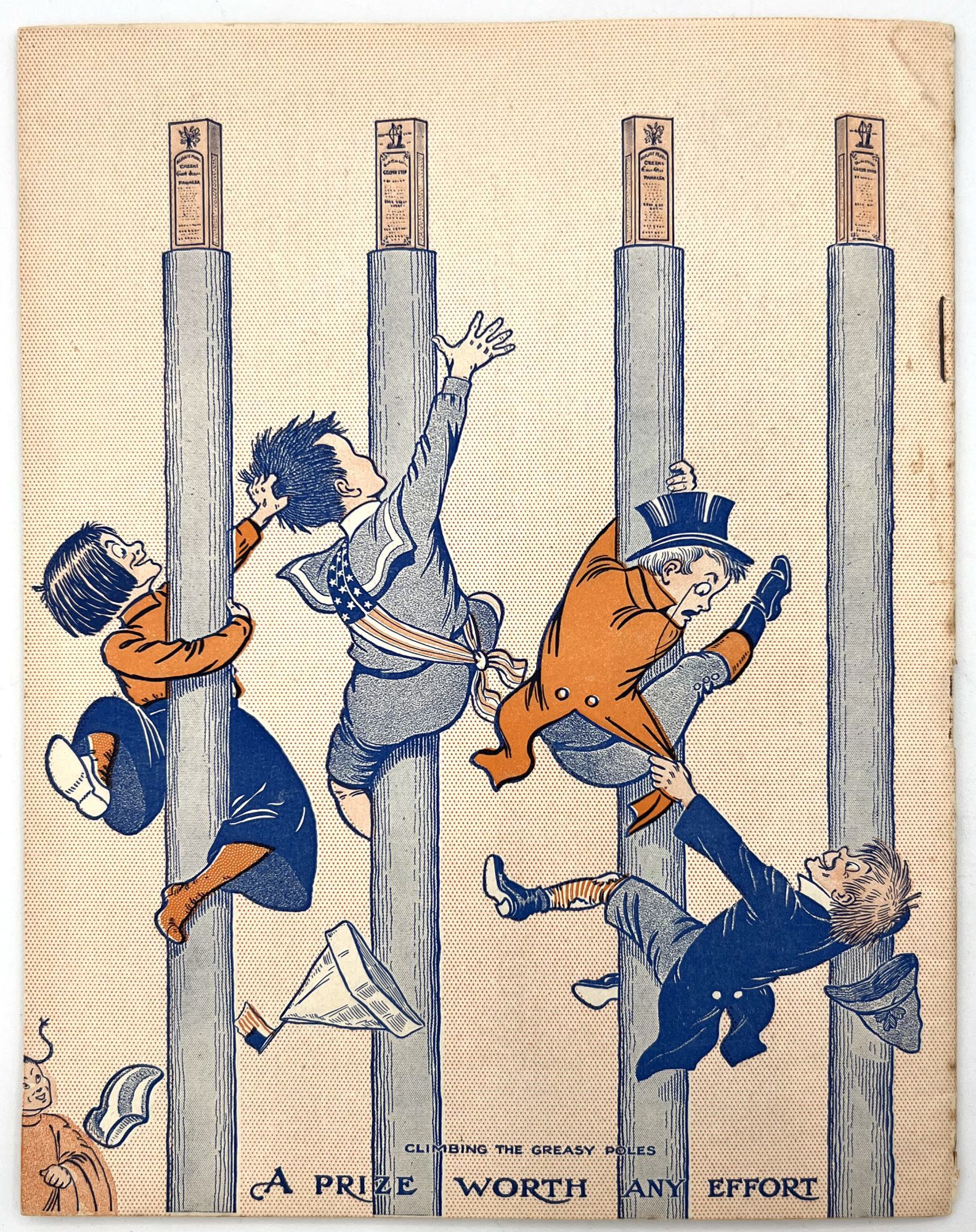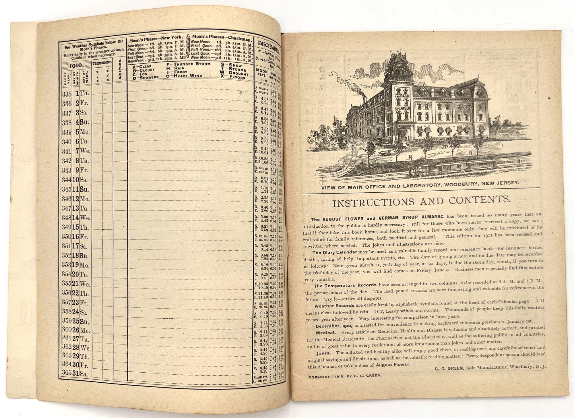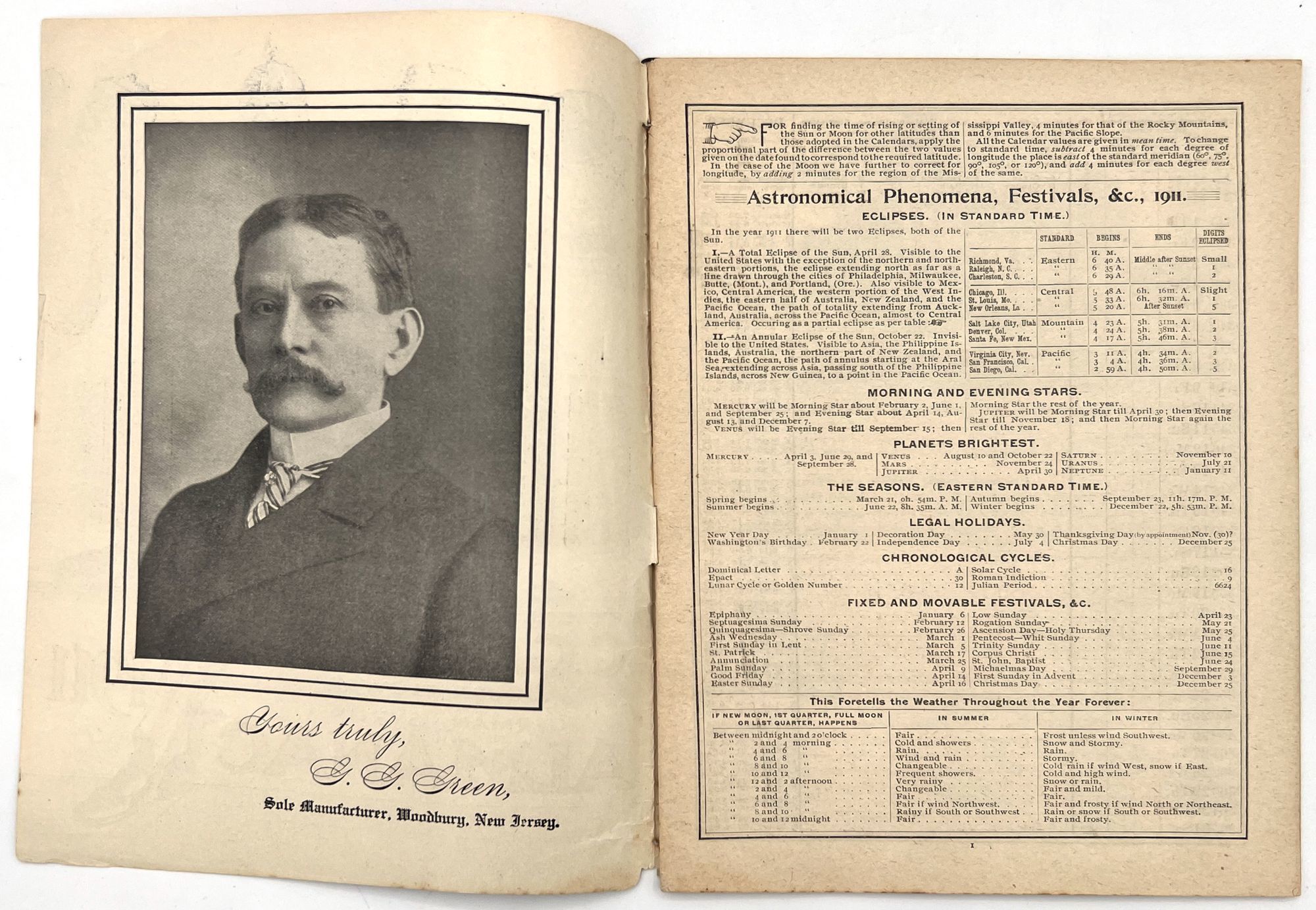 Woodbury, New Jersey: G.G. Green, 1911. Very good, light edge wear, light toning, a nick to bottom of spine.. A nicely preserved copy of G.G. Green's almanac for 1911, published to promote his line of mail-order medicines to the public. Contains weather and astronomical predictions, pitches for Green's medicines, blank monthly charts for recording information, and a veritable flight of cartoons with jokes offensive to women, African Americans, and the Irish, painting a very specific picture of Green's target audience. The cover illustration is very interesting, and depicts Uncle Sam sitting on a bench reading the almanac, with stereotyped cartoon versions of England, Germany, and China looking over his shoulder. It appears as though Russia and France are also barely in the frame. On the back are four cartoon children climbing greasy poles to get to Green's medicine at the top subtitled "Climbing the Greasy Poles: A Prize Worth Any Effort". Notice the stereotypes at play. From left to right: the Netherlands (a girl who is playing dirty), America (in the lead), England (distracted by Ireland), and Ireland (apparently drunk and impoverished). Provides really fascinating insight into how Americans viewed world powers and national identities at this time. Single vol. (9" by 6.75"), pp. 32, illus., in original illus. wrps printed in orange and blue. 1 copy in WorldCat (Feb. 2025). George Gill Green (1842-1925) served as a surgeon in the Union army during the Civil War, and went on to start his wholesale drug business in 1867. Green was one of the most successful early patent medicine entrepreneurs, and built a successful clientele based on a mail-order business model.