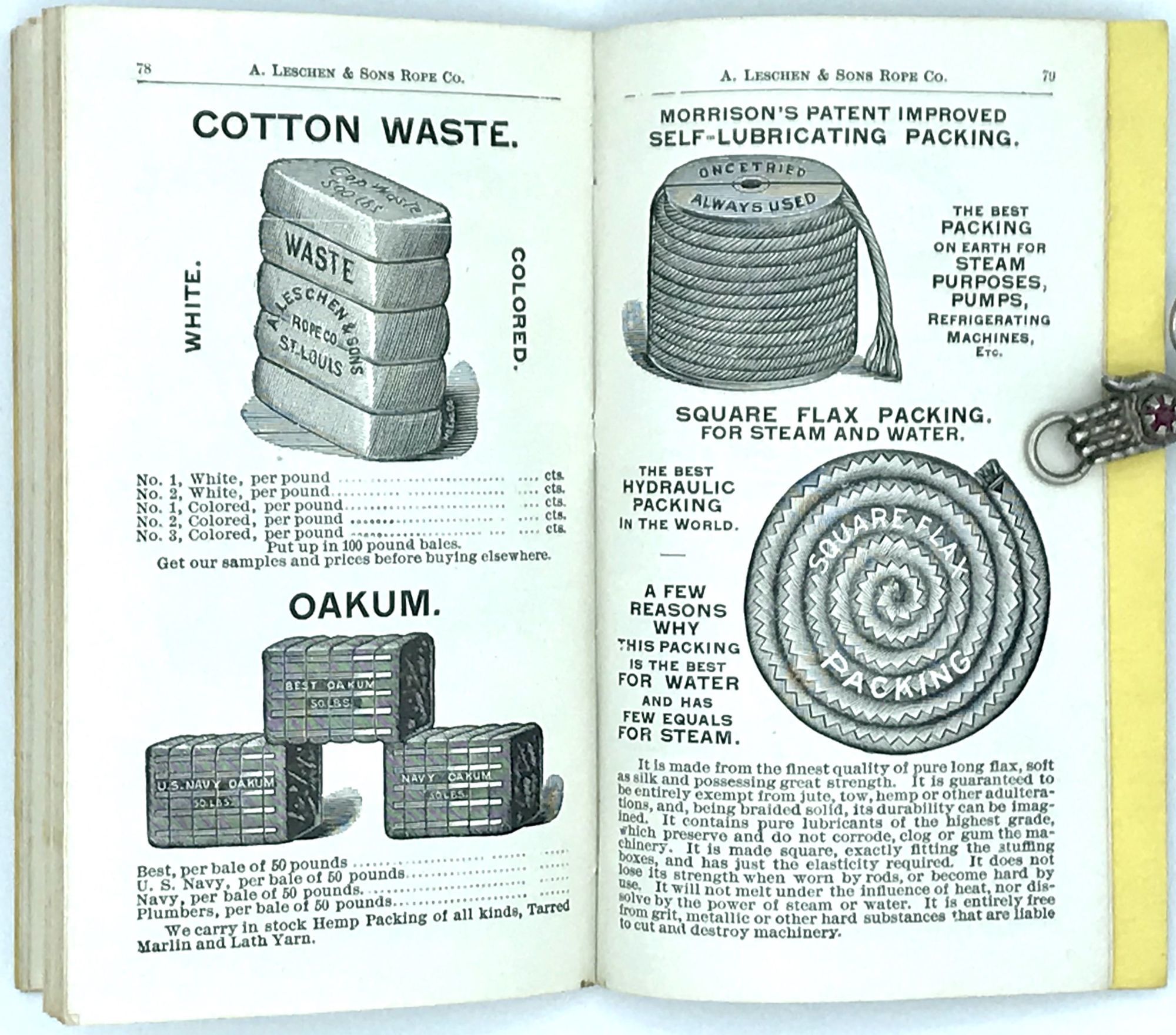 Kansas City, Missouri: Kansas City Contractors' Supply Company, 1905. Very good. Some dust soiling; hinges sometime reinforced with cloth tape.. Trade catalog for A. Leschen & Sons, a company that manufactured and supplied contractors with wire rope and cordage, advertising its offerings for 1905. Includes index as well as their proprietary telegraphic code (for example, "Acrobat" means "We can ship at once"). Each product is illustrated with dimensions, a brief description of its ideal uses, and more specific telegraph codes for ordering, where needed. Measures 6" by 3.5", 88 pp. in original embossed printed wrappers.