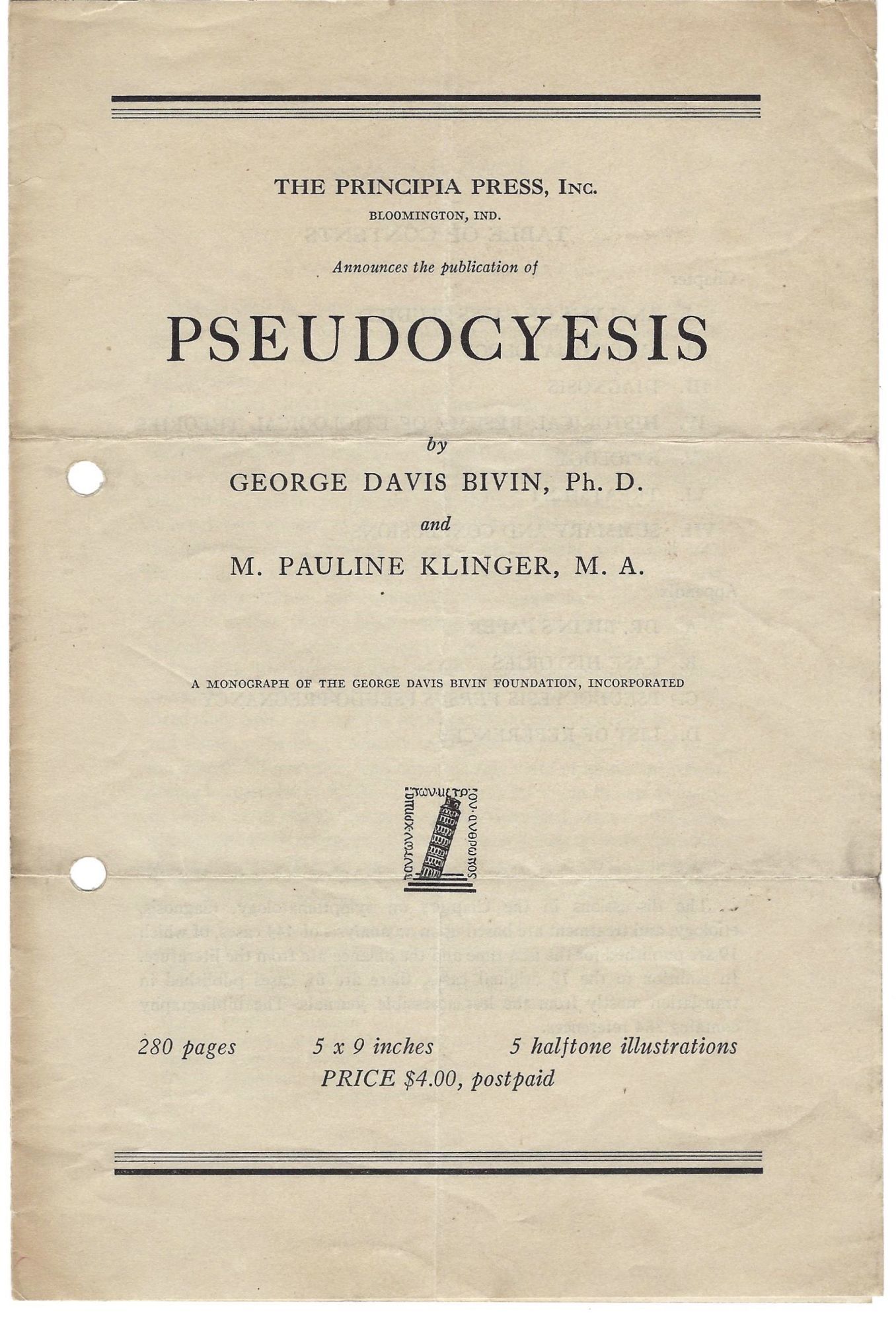 Bloomington, Indiana: The Principia Press, Inc, 1937. Fine; some light marginal browning. Two-hole punch to left-hand margin. Creased where previously folded.. A prospectus for a monograph on Pseudocyesis, or false pregnancy, published in 1937 by The Principia Press. Women who appear to be pregnant and exhibit all of the same signs and symptoms, but do not carry a fetus, are described to have Pseudocyesis. The most famous example is generally cited as Mary Tudor, though even earlier examples can be traced back to Hippocrates, who observed cases in 300 B.C. The prospectus includes a listing of other terms used for the diagnosis, as well as translations for the term in seven other languages. Printed bifolium (9" by 6").