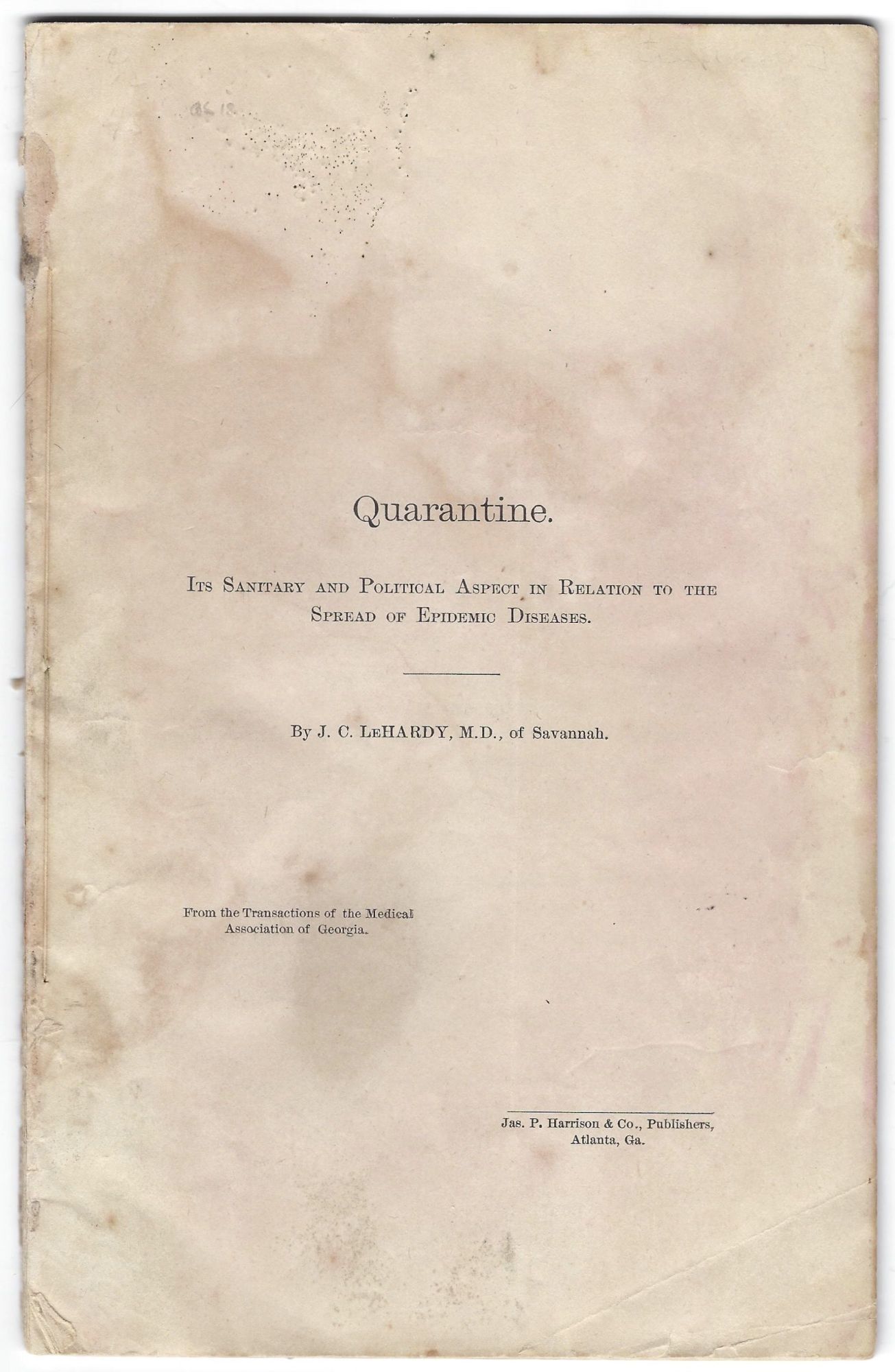 Atlanta, Georgia: Jas. P. Harrison & Co, 1879. Very good; some light dust soiling, damp staining.. A passionately penned pamphlet advocating for swift quarantine measures to be enacted during an outbreak of yellow fever, and calling for other physicians to share research with colleagues: "... it behooves every medical man South, who has had personal experience in the treatment of yellow fever ... to bring forward whatever information he may have gathered, to instruct the community and enlighten the masses on the true nature of the pestilence, and to express fearlessly his views as to the best and surest means of prevention" (p. 3). Includes lengthy discussions of the role of the government and politicians in ensuring public health, with uncomfortable parallels to the present day. 8 copies in OCLC (Jan 2022).