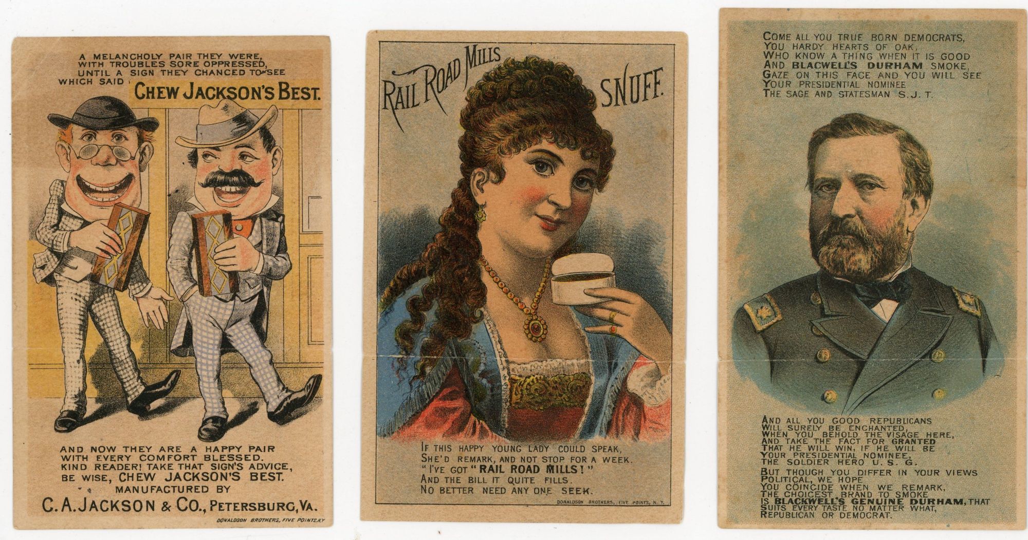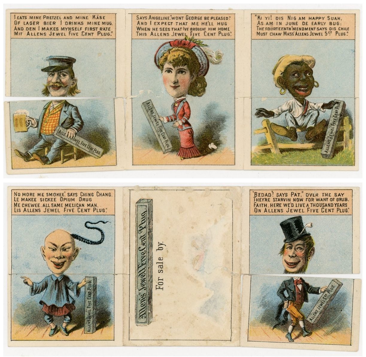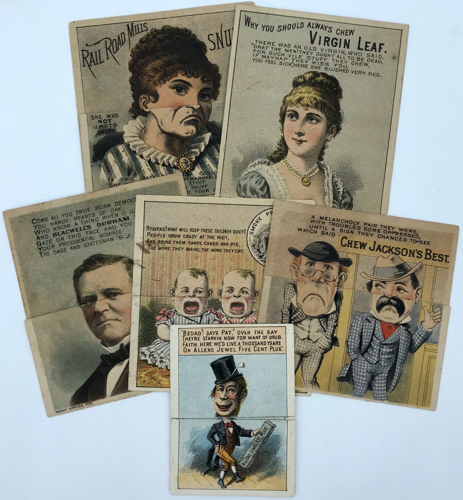 United States, 1880. Very good to fine; some light browning. One small rip to the Allen's Jewel card. Traces of adhesive or erased inscriptions to some of the cards.. A grouping of seven (7) metamorphic cards advertising tobacco produced by: Allen's; Blackwell's; D.H. McAlpin & Co.; Jackson's Best; Rail Road Mills; and A.S. Rosenbaum & Co. The advertising gimmick of metamorphic cards was an effective and common one for tobacco products in the late nineteenth century. Each is chromolithographed and measures approx. 3.75" by 3.25". The grouping includes several that reveal a beautiful young woman underneath an old maid, as well as one that reveals Ulysses S. Grant under the democratic Presidential candidate Samuel J. Tilden (who would go on to lose to Hayes in 1876). Another gradually reveals no less than five different stereotypical characters as it transforms, each of which enjoy Allens Jewel tobacco.