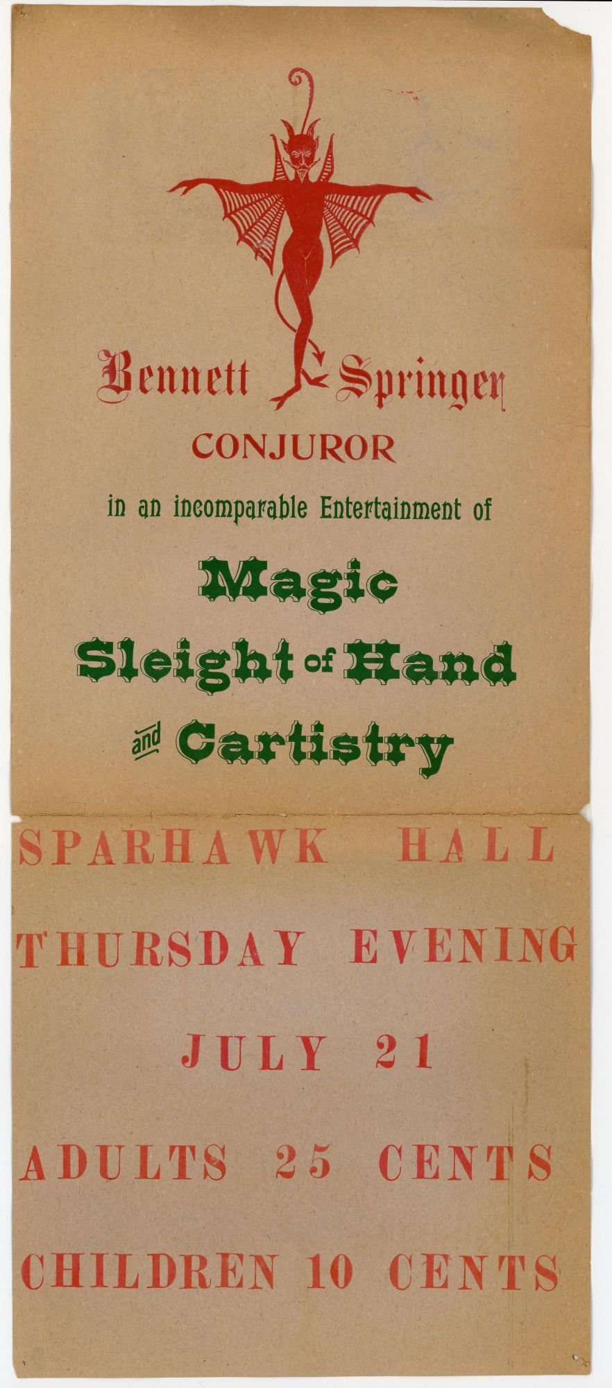 Boston, 1910. Scrapbook residue on reverse - horizontal tape repair on reverse between Cartistry and Sparhawk Hall. Corner chip upper left.. A 19.5" by 8.25" broadside depicting a red winged devil and promoting Bennett Springer, Conjuror in an incomparable Entertainment of Magic, Sleight of Hand and Cartistry. Located at Sparhawk Hall (Oqunquit ME) on July 21. Printed in red and green in various type faces.