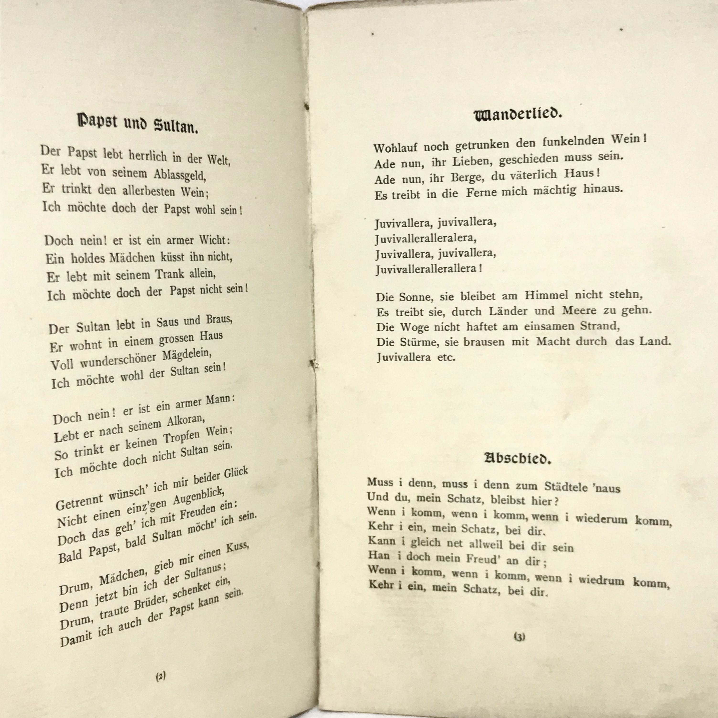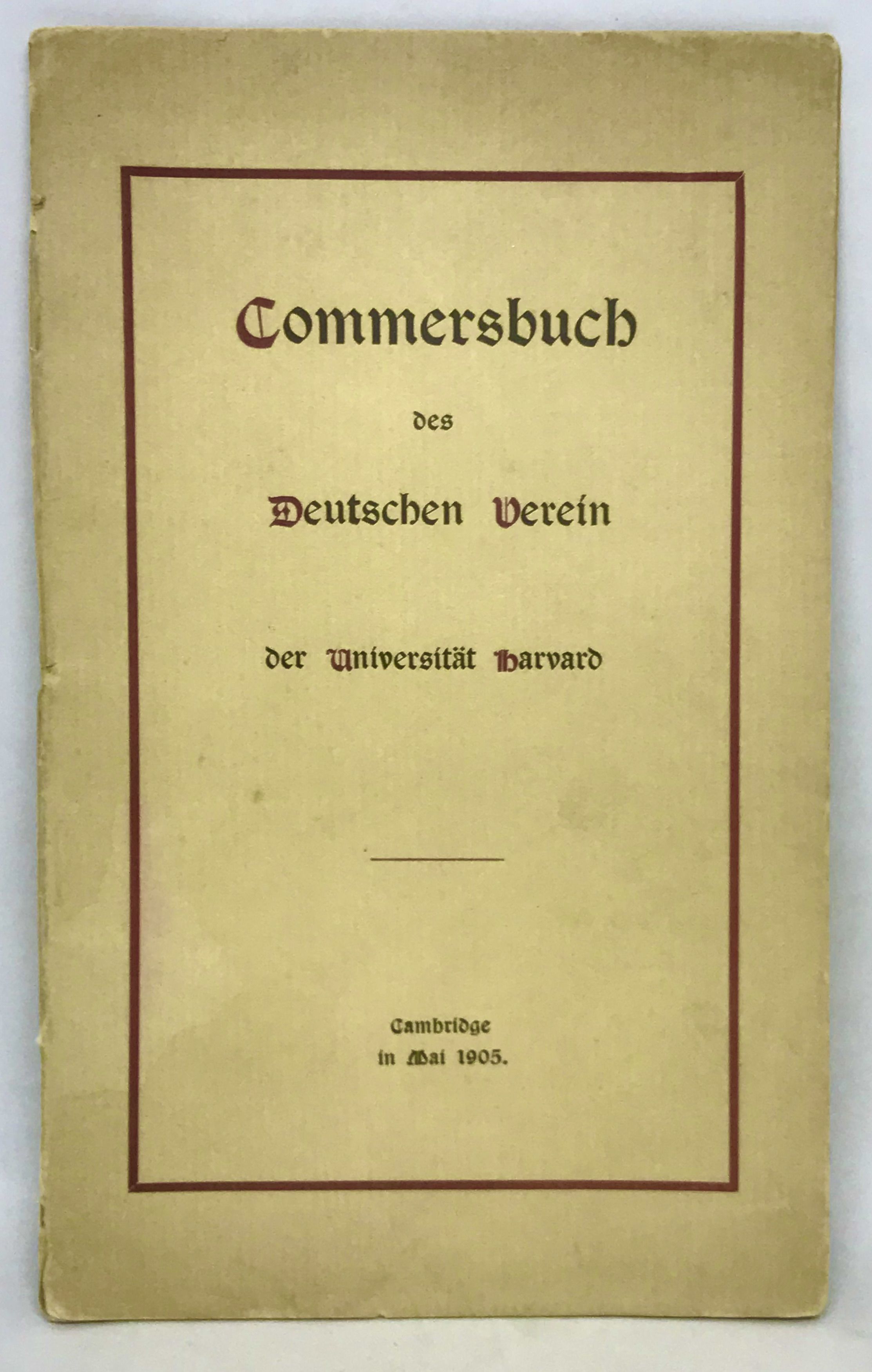 1 - Commersbuch des Deutschen Vereins der Universität Harvard, May 1905. Small 8-page songbook (20 x 12.5 cm) featuring traditional toasts and drinking songs. Sewn binding; closed tears at the head and tail of the spine.