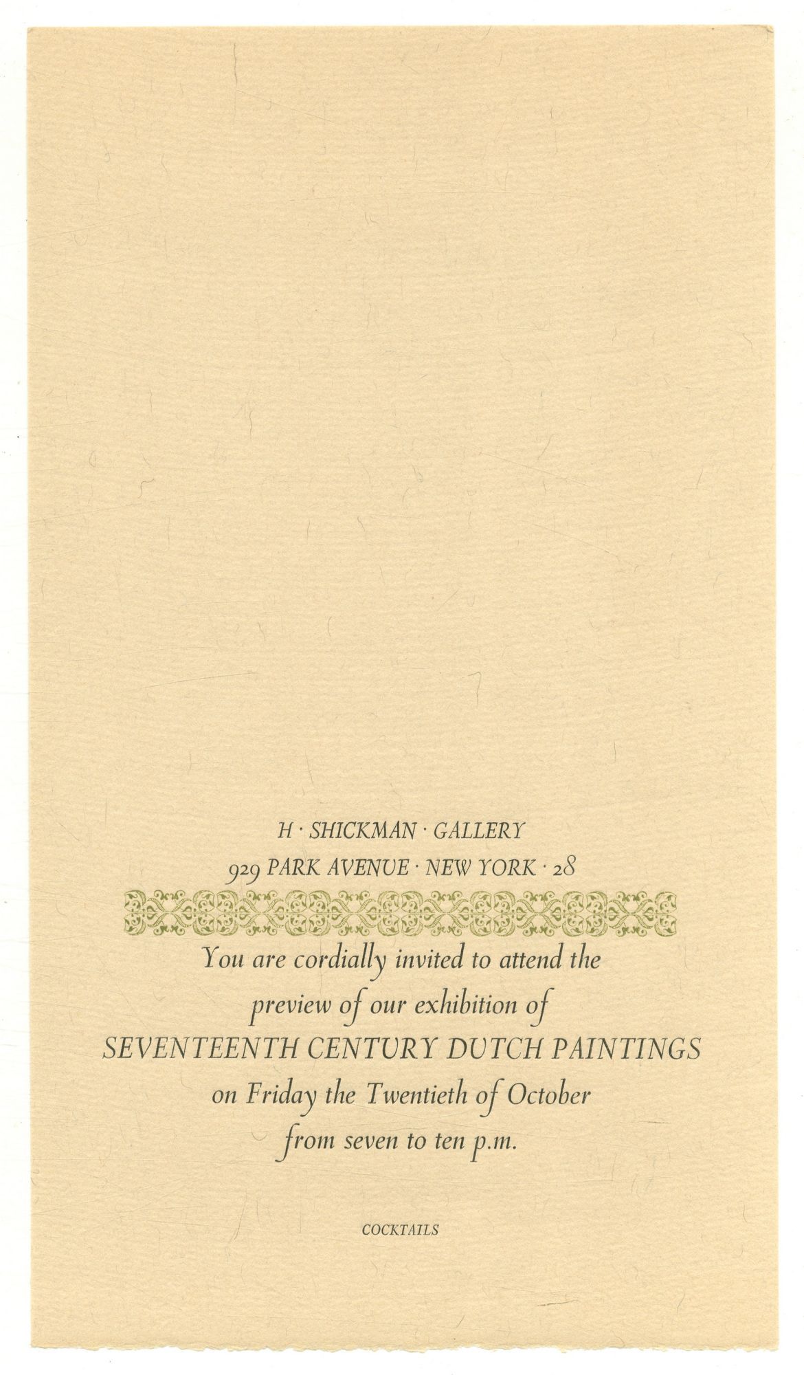 [Printed Invitation]: H. Shickman Gallery. You are cordially invited to attend the preview of our exhibition of Seventeenth Century Dutch Paintings..