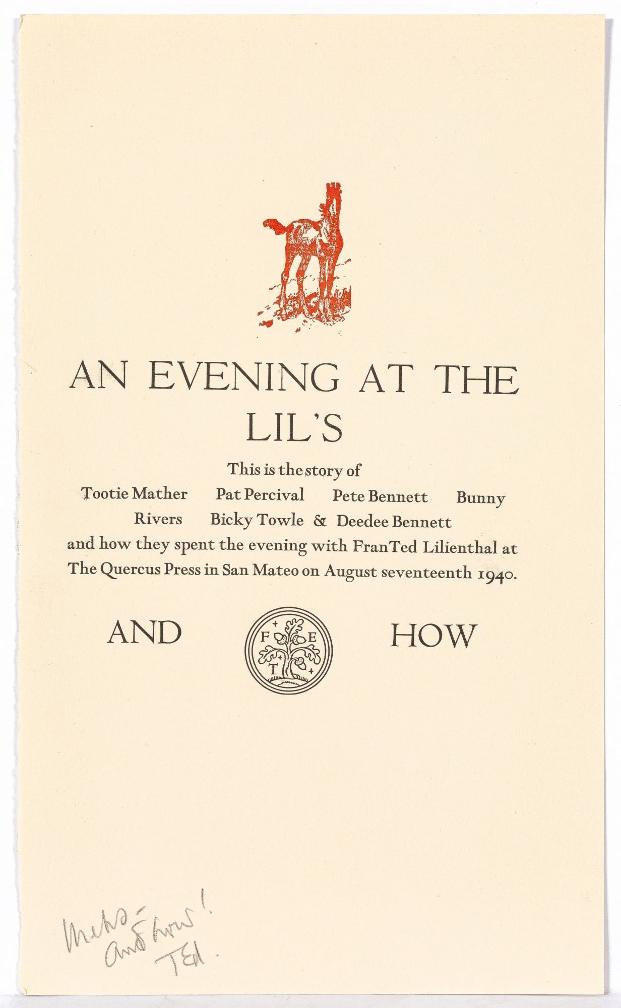 [Broadside]: An Evening at Lil's and How. This is the story of Tootie Mather Pat Percival Pete Bennett Bunny Rivers Bicky Towle & Deedee Bennett and how they spent the evening with Fran Ted Lilienthal at The Quercus Press in San Mateo on August seventeenth 1940