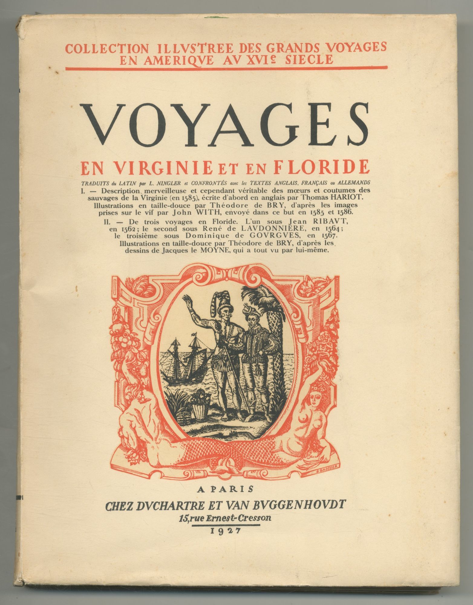 Paris: Chez Duchartre et Van Buggenhovdt, 1927. Softcover. Very Good. First edition thus. Quarto. xvi, 311 [7] pp. Illustrated. French-folded pictorial wrappers, textblock untrimmed with topedges unopened. Wrappers with modest wear, soil, and a bit of light foxing, a couple of small chips and slits at the spine ends, upper flap fold with a vertical crease, very good or better; the interior is fine. A handsome facsimile of the 16th Century publication, including Hariot's 1588 "Report" as printed by De Bry in 1590, with the same illustrations and map, and those to Florida by Ribaut (1562), Laudonniere (1564), and Gourgues (1564), with the Le Moyne illustrations. Thornton 14287.