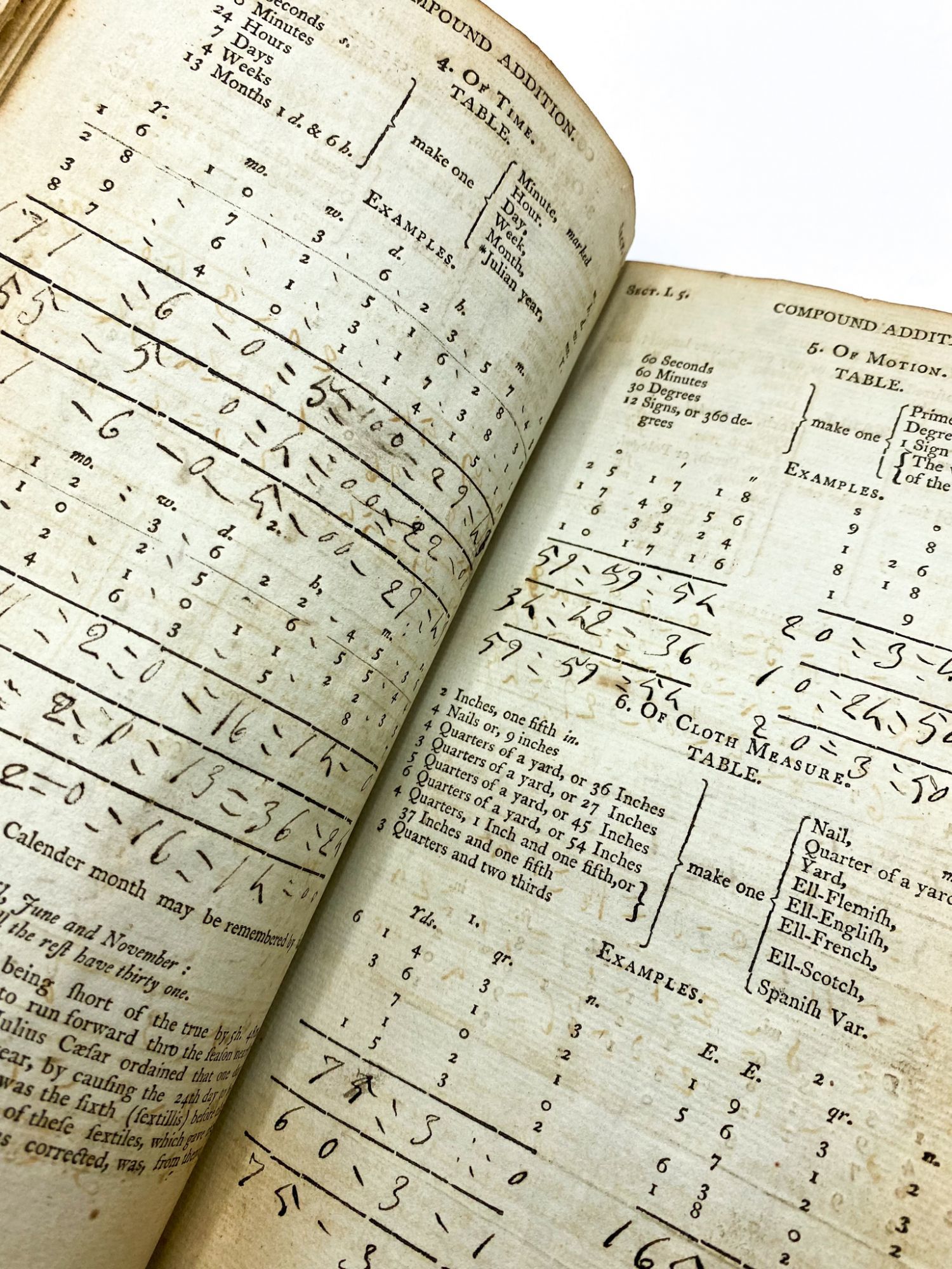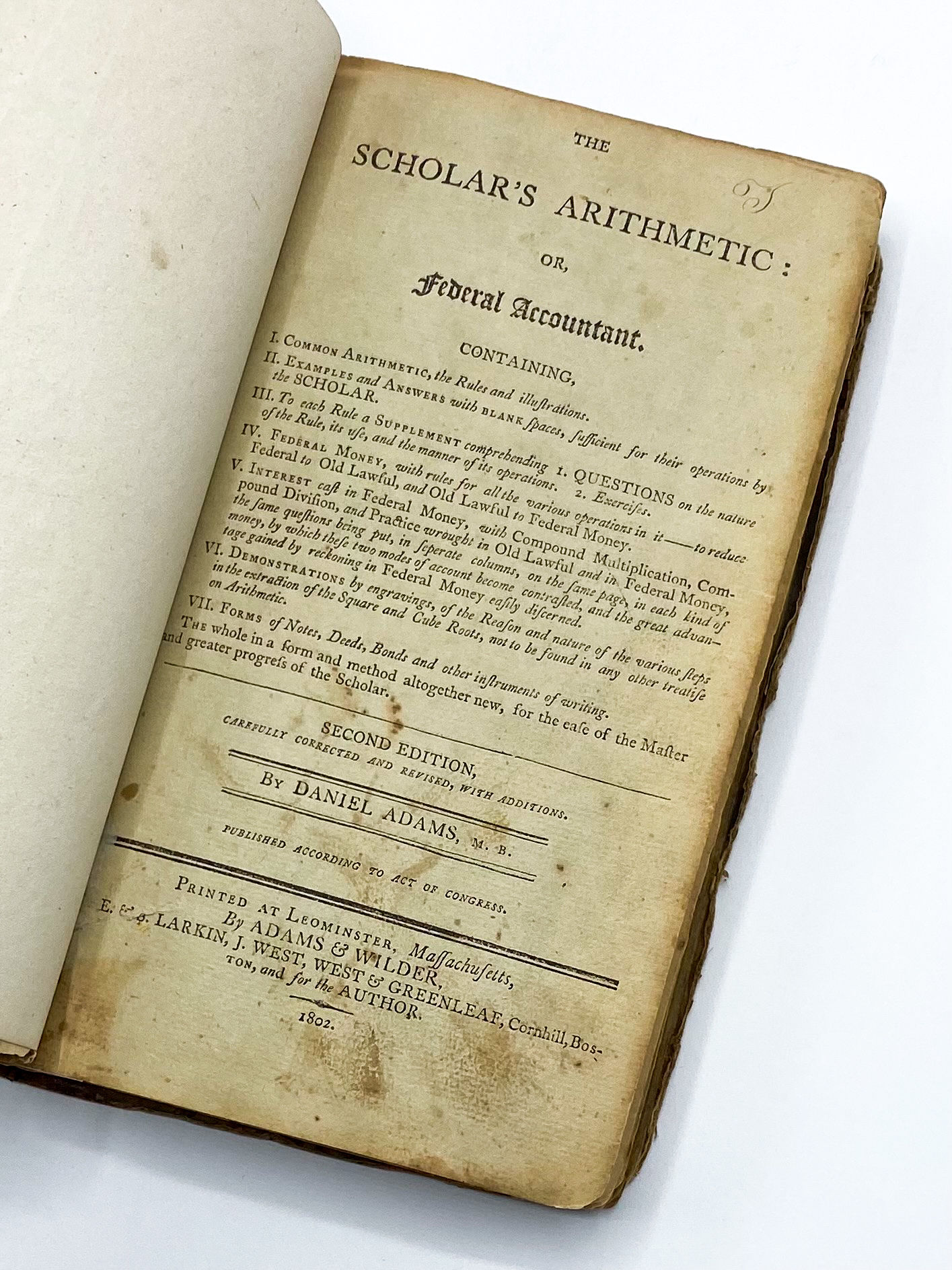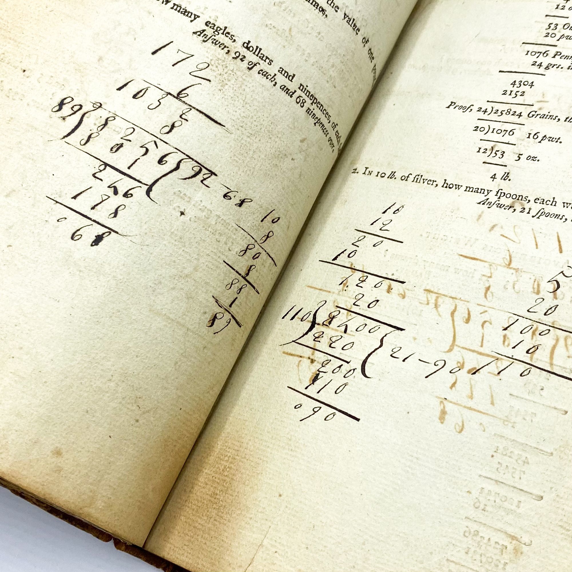 Leominster, Massachusetts: Adams & Wilder, 1802. Good plus.. Second revised edition of one of the most popular mathematical textbooks in the early United States, with extensive contemporary figuring. "Judged by the number of editions produced, [THE SCHOLAR'S ARITHMETIC] attained second place in popularity among the arithmetics published in America in the period from 1800 to 1825," says historian Louis C. Karpinski (133). He further notes that, though Daniel Adams included blanks under the problems for readers to do their own sums, "thrifty New Englanders continued to use" the text, even after past pupils filled them with figuring (Karpinski, 134). This copy is a prime example of a student using all the space afforded to them to work out the solutions to copious math problems. One can only hope they were rewarded with a good grade for their stylish handwriting, as the very least; this cataloguer cannot speak to the accuracy of their sums. Quarto. 8.75'' x 5''. Original sheepskin-backed marbled boards. Various charts throughout. 216 pages, collated complete. Contemporary ownership inscription to front flyleaf, "Isaac Farley his / property bought January 12 / 1804 of Leonard Whiting price 5/3 / the twentieth year of his age." Contemporary owner name to verso of title page, "Thomas J Dons / Book." Extensive contemporary mathematical notation. Binding variously scuffed, with edgewear and loss of marbled paper to rear. Front hinge carefully reinforced, a couple subtle repairs to verso of front flyleaf; two fly leaves renewed, one to front and one to rear. Leaves with some soiling and scattered foxing. Sound overall.