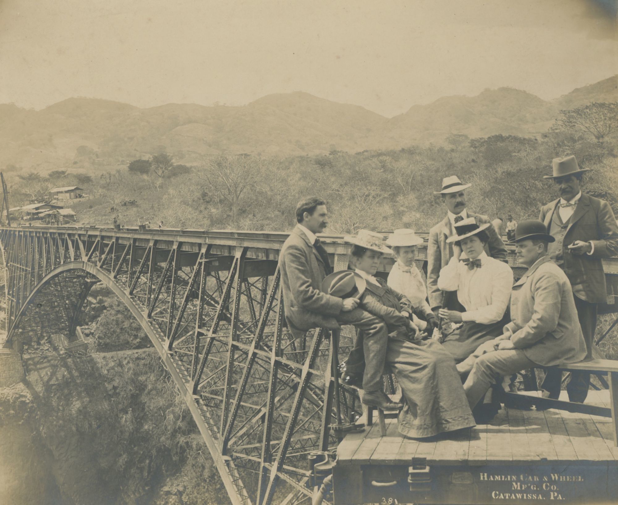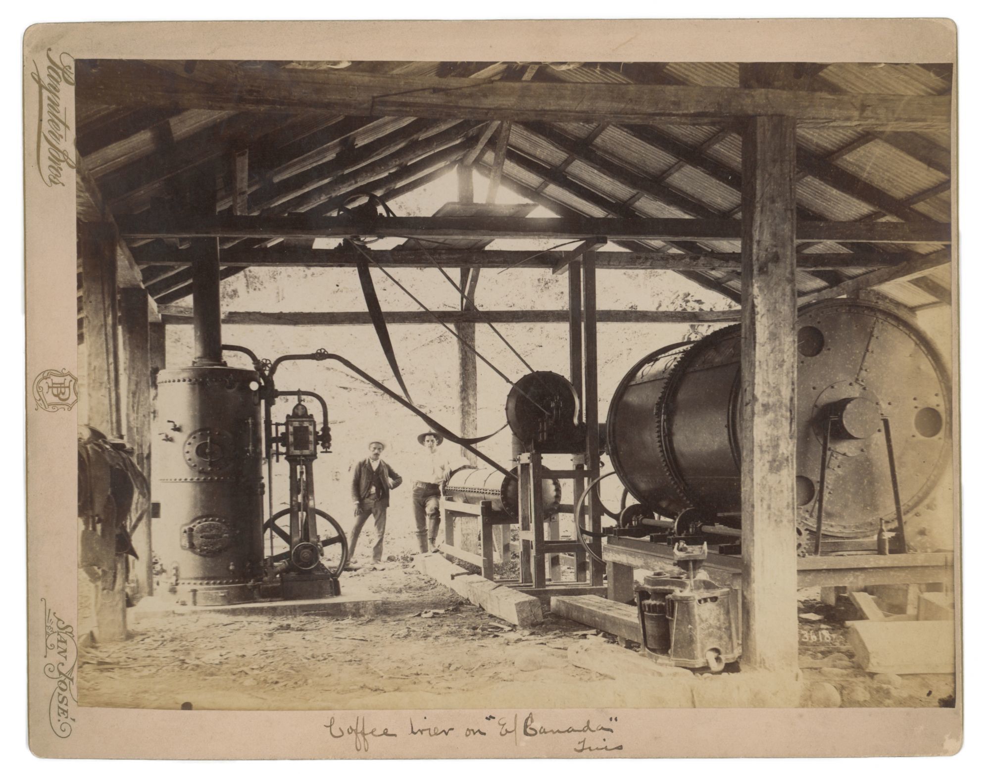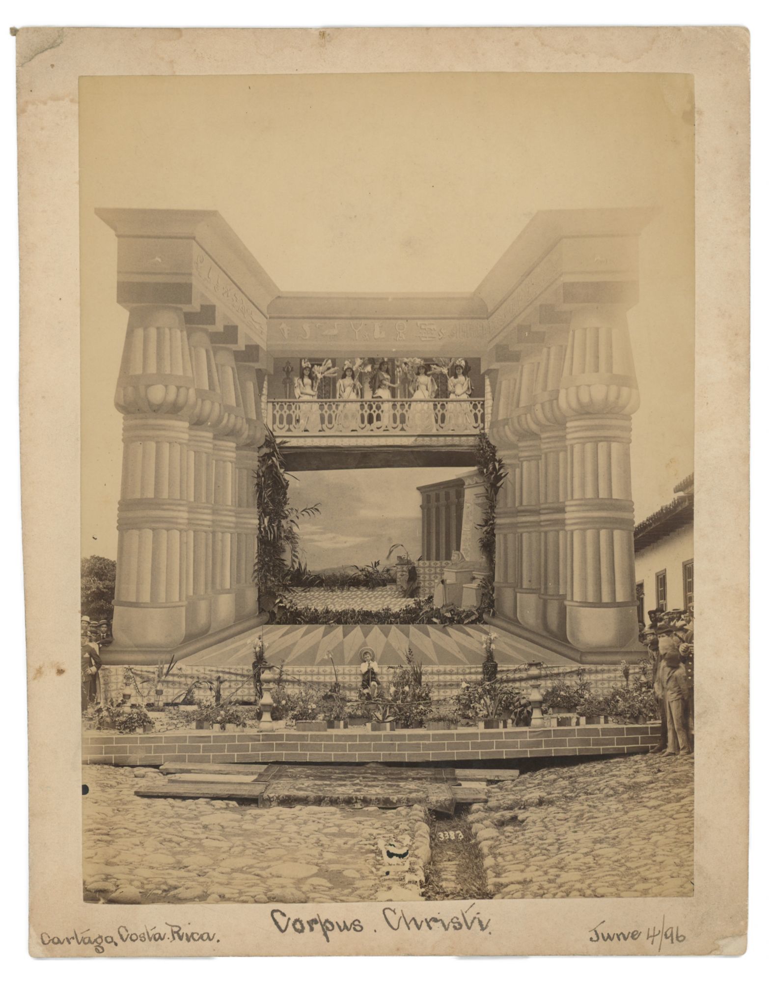 Collected here are nine scarce albumen views of Costa Rica from the 1890s. Five of them document a trip up Mt. Turrialba (these bear the Rudd y Paynter mark). Of the other other four, one image shows a building likely in San Jose with a gathered crowd; one shows a very striking mural and is captured “Corpus Christi / Cartaga, Costa Rica, June 4 / 96 (this shows no photographers mars though the size and format are identical to the others and we presume the photographers to be the Paynter brothers); One shows industrial coffee machinery on “El Canada,” the last shows a group of people in front of the bridge over the Rio Grande, with a platform showing the markings of the Hamlin Car and Wheel Company of Catwissa, PA. The group, with the exception of the Corpus Christi image, are mounted on uniform heavy cardstock mounts with gilt edges, and remain in particularly fine condition with excellent contrast and some light wear to mounts. Overall a scarce group documenting Costa Rica at a time when few photographers operated.