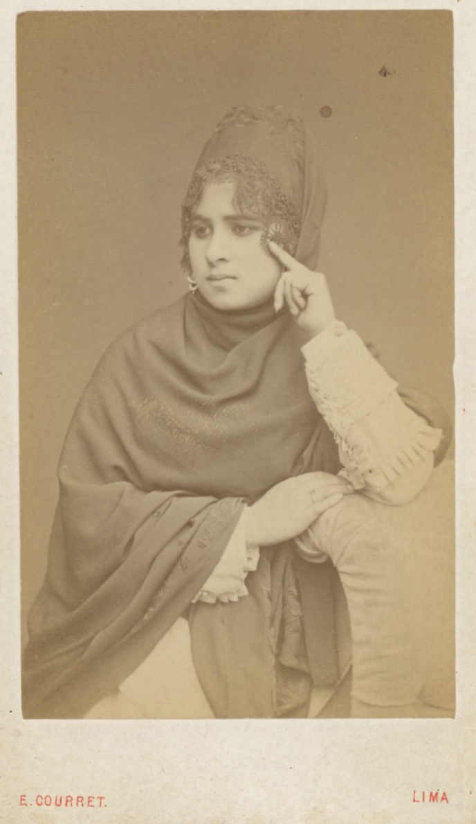 Lima, 1870. Albumen photographs measuring 2 x 3 ½ inches on larger mounts. Some slight fading, a few spots to one image including one with loss, about very good overall. A striking pair of early carte-de-visite portraits of Peruvian women from the Courret studios at 197 Calle de la Union, one bearing the Courret Hermanos imprint and the other with just Eugenio Courret’s credit, from the same studio. Eugenio formed the Courret Hermanos firm in 1863 with his brother Aquiles. The portrait of the woman and child is particularly uncommon for the Courret catalog, as most of the photographs they took were of single wealth patrons.