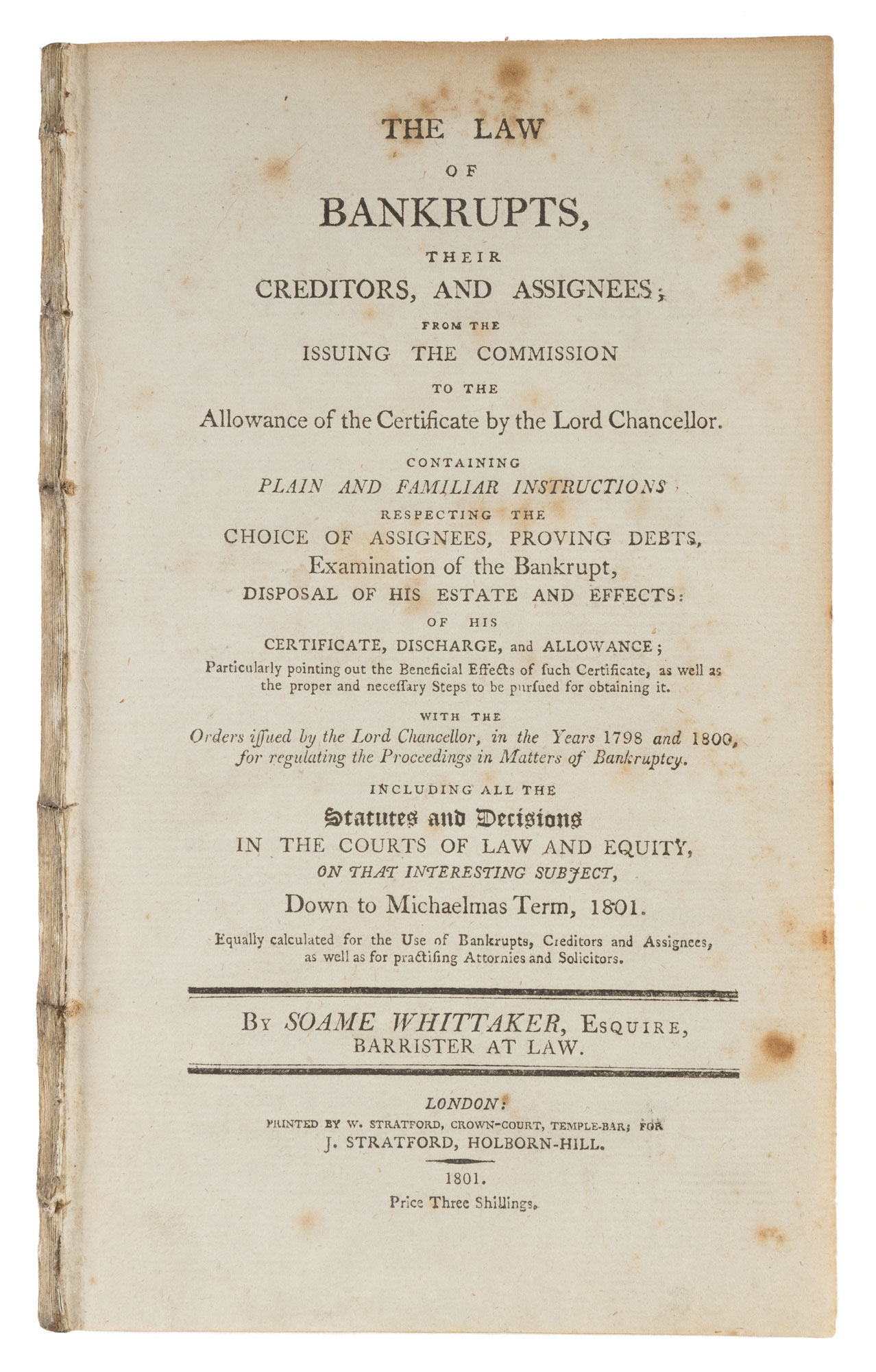 1801. London: W. Stratford; For J. Stratford, 1801. London: W. Stratford; For J. Stratford, 1801. A Rare Nineteenth-Century Guide to Bankruptcy Law and Procedure Whittaker, Soame. The Law of Bankrupts, Their Creditors, And Assignees; From the Issuing the Commission to the Allowance of the Certificate by the Lord Chancellor. Containing Plain and Familiar Instructions Respecting the Choice of Assignees, Proving Debts, Examination of the Bankrupt, Disposal of His Estate and Effects; Of His Certificate, Discharge, And Allowance; Particularly Pointing Out the Beneficial Effects of Such Certificate, As Well as the Proper and Necessary Steps to be Pursued for Obtaining It. With the Orders Issued by the Lord Chancellor, In the Years 1798 and 1800, For Regulating the Proceedings in Matters of Bankruptcy. Including All the Statutes and Decisions in the Courts of Law and Equity, On that Interesting Subject, Down to Michaelmas Term, 1801. Equally Calculated for the Use of Bankrupts, Creditors, And Assignees, As Well as for Practising Attornies and Solicitors. London: Printed by W. Stratford; For J. Stratford, 1801. iv, 100, [8] pp. Octavo (8-1/4" x 5"). Disbound. Light toning, somewhat heavier to last half of text block, occasional light foxing, small holes to text blocks of several leaves, impacting legibility slightly on leaf O2 (pp. 99-100), light soiling and small marginal pencil marks to a few pages. $650. * First edition. A practical guide to bankruptcy law and procedure written for professional and lay readers. A second edition, published in 1807, was reissued in 1808; a fourth (and presumably final) edition was published in 1817. All editions of this work are rare. OCLC locates copies of the first edition in 4 libraries (Harvard Law School, UC Berkeley Law School, University of Georgia Law School, British Library). Sweet & Maxwell, A Legal Bibliography of the British Commonwealth 2:379.