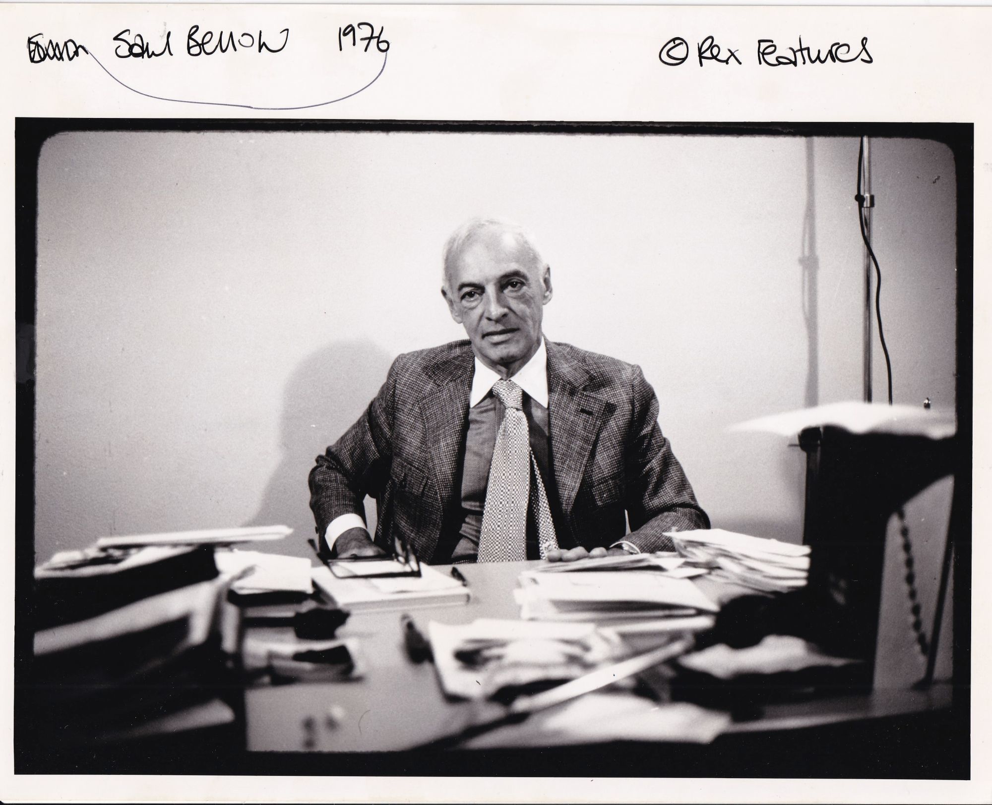10 x 8 inches. Manuscript ink annotations on the top margin, noting Bellow's name, the year, and the name of photograph agency Rex Features, else Near Fine.