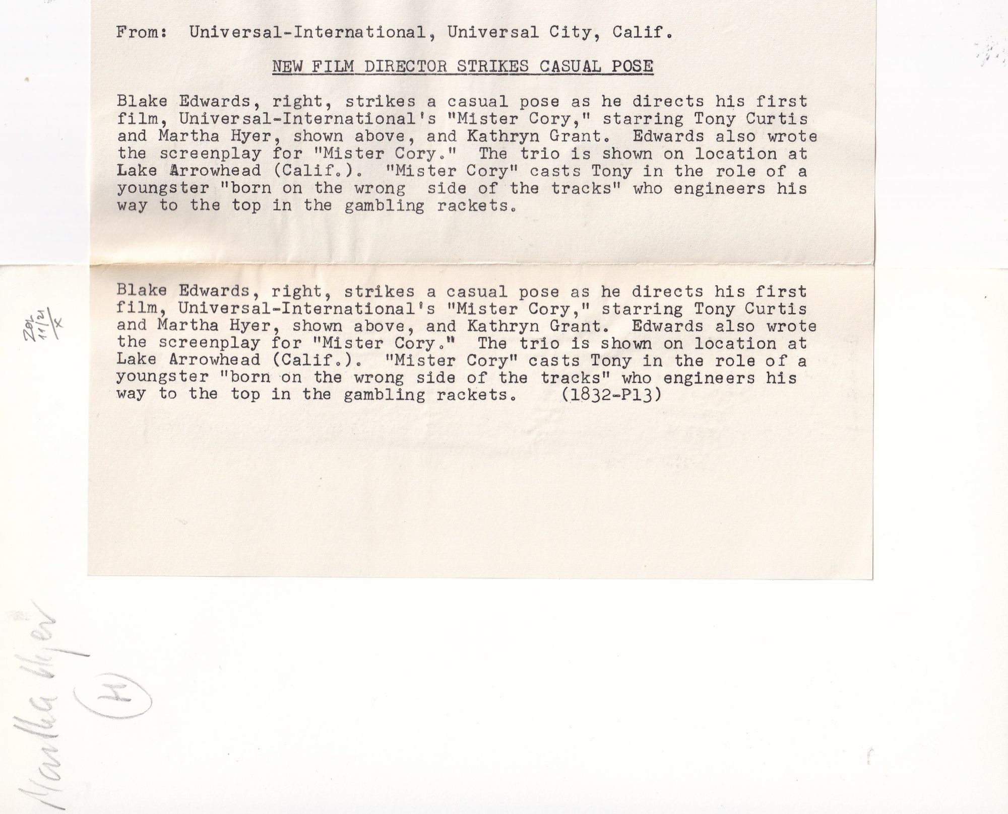 Universal City: Universal-International, 1957. Vintage reference photograph from the 1957 film, showing Blake Edwards directing actors Tony Curtis and Martha Hyer on the set. Printed mimeo snipe affixed to the verso.