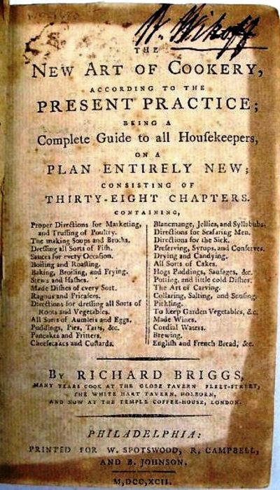 Philadelphia: W. Spotswood, R. Campbell, and B. Johnson, 1792. First American Edition. Hardcover. Front free endpaper lacking; early owner name to top of title and the first page of text; light to moderate foxing; one gathering bound upside down; about five leaves trimmed closely, occasionally affecting a word or letter. Binding quite nice with partial splits on both covers which are holding firm. Very Good and quite scarce, especially in this complete, unmutilated condition. Duodecimo (4-1/8" x 6-3/4") bound in contemporary calf leather with gilt rules on the spine and a gilt-lettered red morocco spine label; xiii, xii-xvi, 557, [1-advertisement for Spotswood's books] pages, as issued. Originally issued in London in 1788, this is ONE OF THE EARLIEST COOKBOOKS PRINTED IN AMERICA. The chapters include material on wine and wine making, cordials, brewing, "proper rules to be observed in marketing," "rules for trussing," sauces, baking, broiling, and everything else. Briggs's prefatory remarks are dated 1788 and addressed to his readers "in hopes that they will find the Directions and Receipts more intelligible than in most Books of the Kind." BITTING, p.60, citing this Philadelphia edition as the main edition, and noting the other editions (including the two later Boston and Philadelphia editions of 1798); EVANS 24145; LOWENSTEIN 14. Bookplate of the noted Americanist Michael Zinman on the front pastedown.