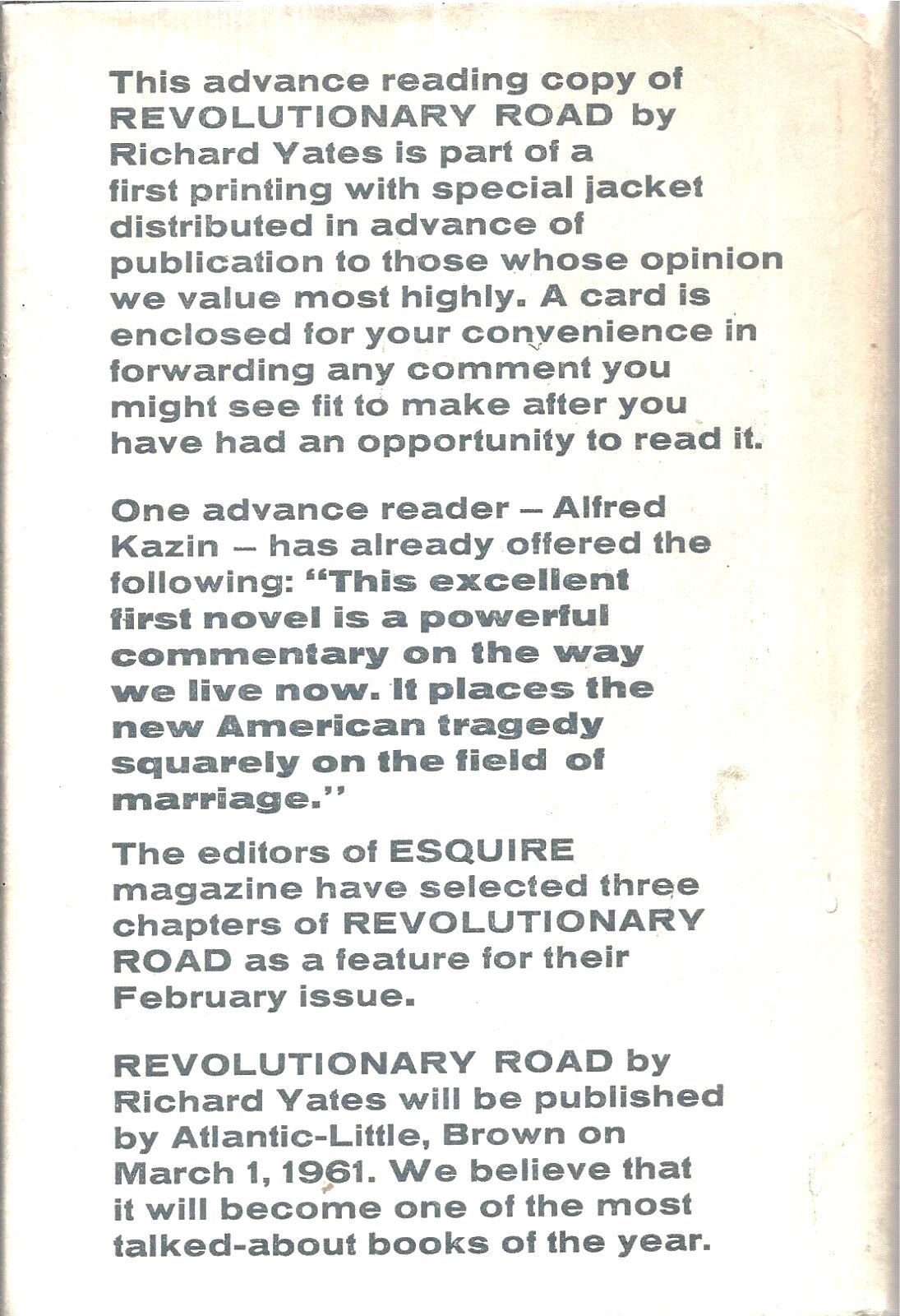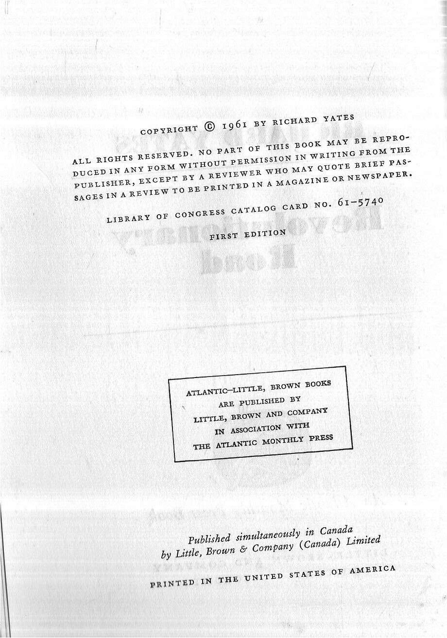 Boston: Little, Brown & Company, (1961). First Edition. Hardcover. Just about Fine in a close to Fine dustwrapper with the spine tanned but in this case much less severely than typically found. Advance Copy in plain printed white dustwrapper with praise from the publisher on the front and rear panels, including a blurb by Alfred Kazin. Yates's powerful first book which Kurt Vonnegut called "the Great Gatsby of our time." Tennessee Williams said of this book: "Here is more than fine writing; here is what, added to fine writing, makes a book come immediately, intensely, and brilliantly alive. If more is needed to make a masterpiece in modern American fiction, I am sure I don't know what it is." An Academy-Award nominated film was made from this book reuniting Leonardo DiCaprio and Kate Winslet from TITANIC.