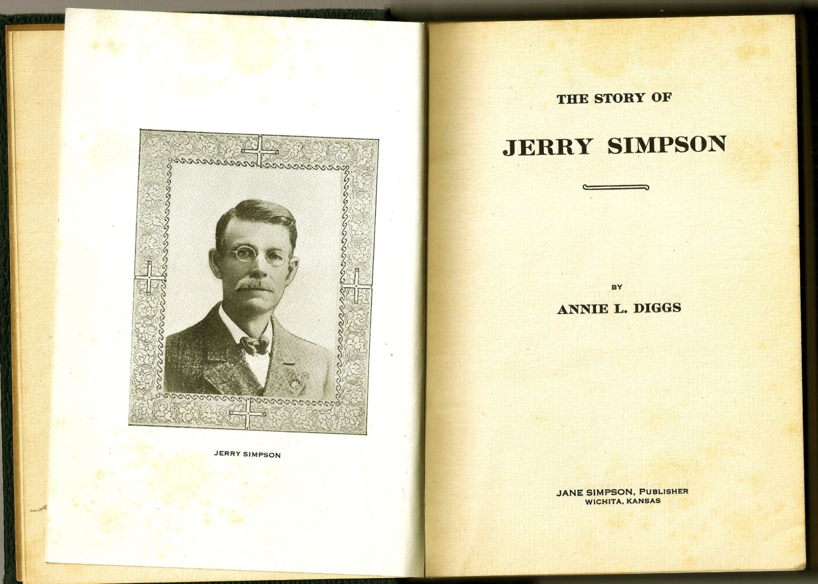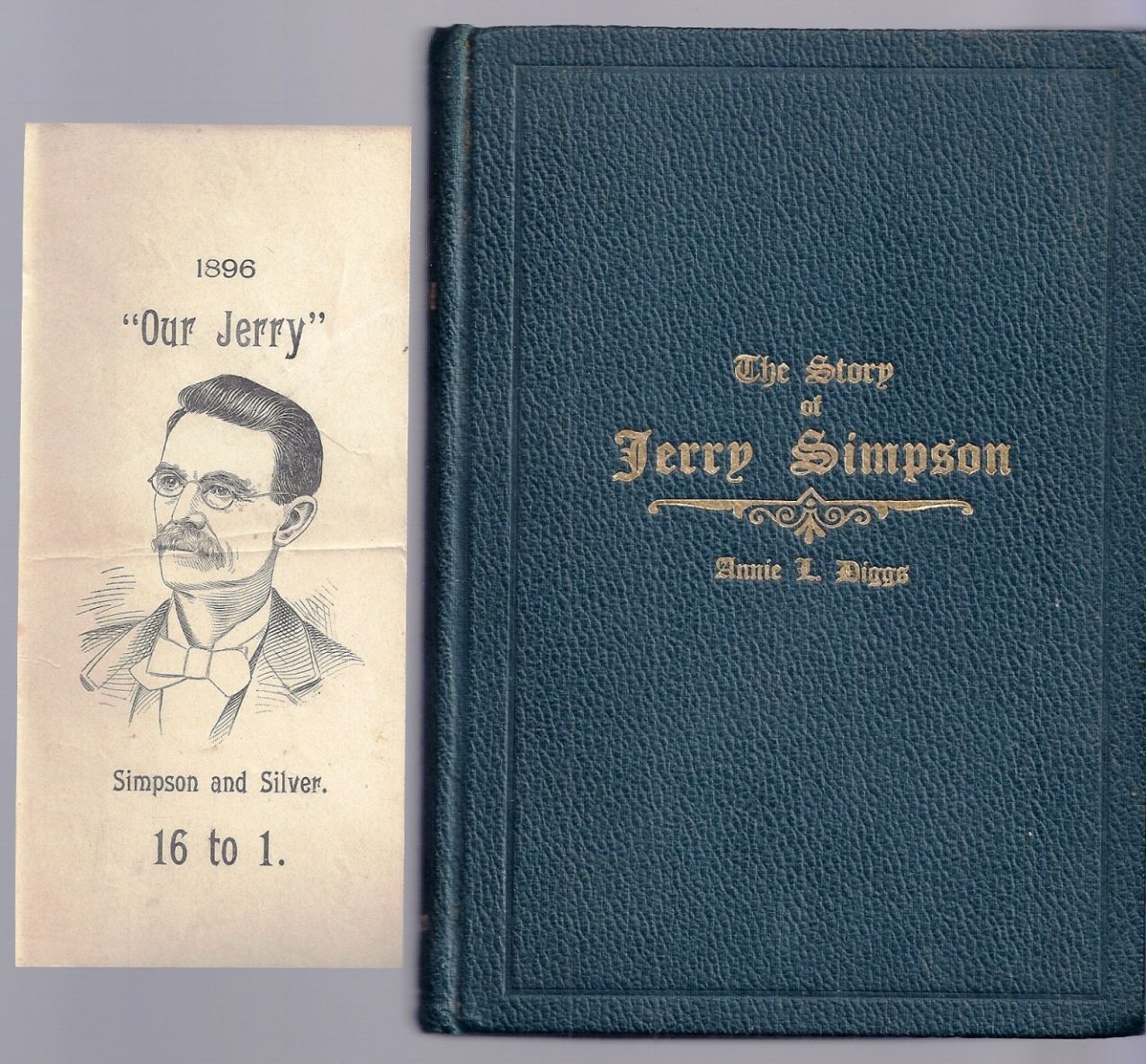 Wichita, Kansas: Jane Simpson, (1908). First Edition. Hardcover. A 1912 owner inscription on the front blank. Fine, bright copy. Gilt-lettered dark green cloth. The story of flamboyant "Sockless" Jerry Simpson, three-term member of Congress from Kansas, and his political career in Kansas and in Congress, the Farmers Alliance and the Peoples Party, and more. Laid in a small piece of campaign ephemera from 1896 depicting "Our Jerry."