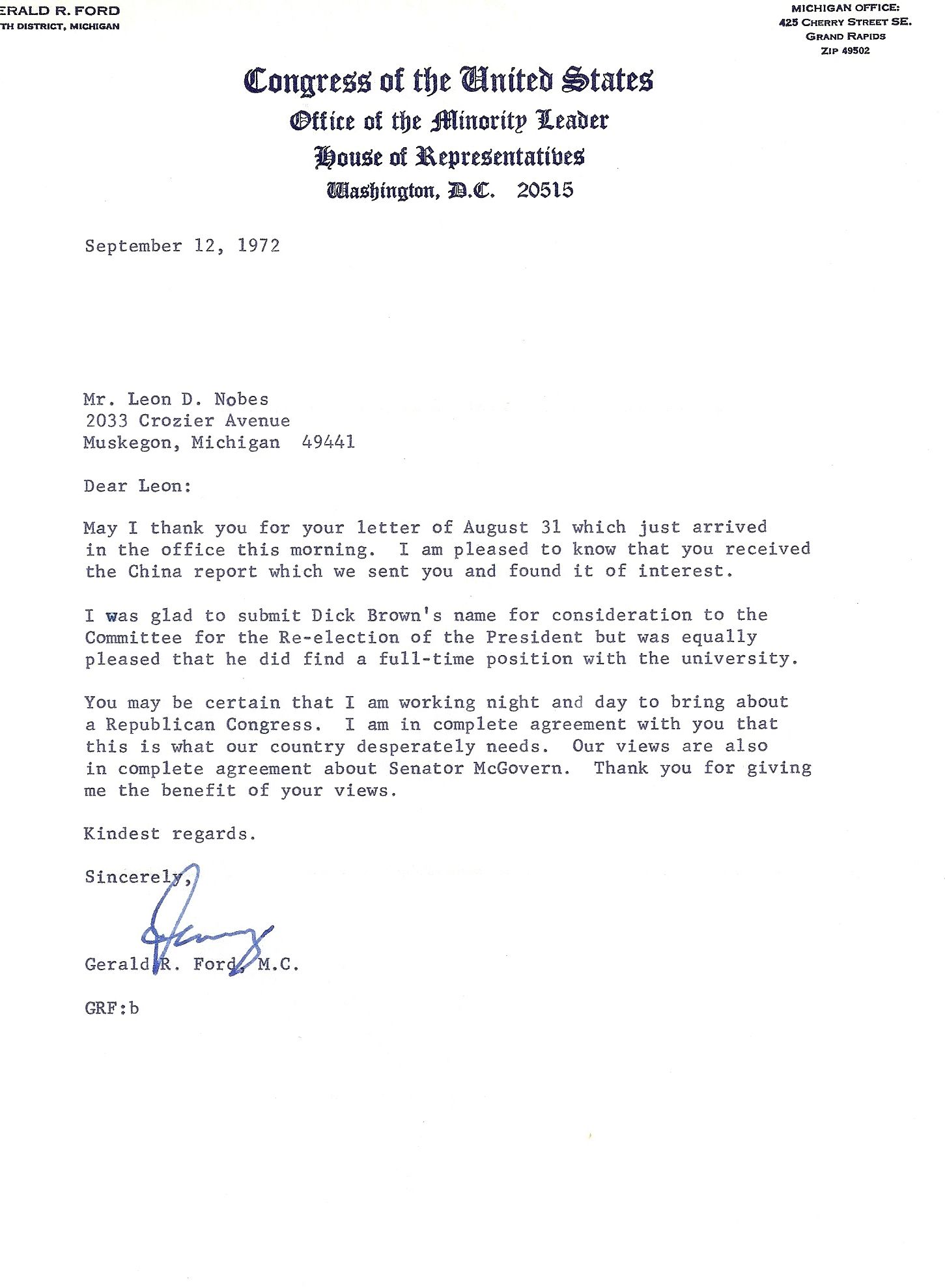 Washington, 12 September 1972. Letter. Light creases from mailing. Fine. TYPED LETTER SIGNED "Jerry" on Office of the Minority Leader stationery thanking the recipient, Leon Nobes, for his letter. Ford mentions sending "the China Report" to him and says, "You may be certain that I am working night and day to bring about a Republican Congress." Nobes unsuccessfully ran to be the Republican candidate for the Michigan state House of Representatives 96th District in 1974, 1976, and 1978.