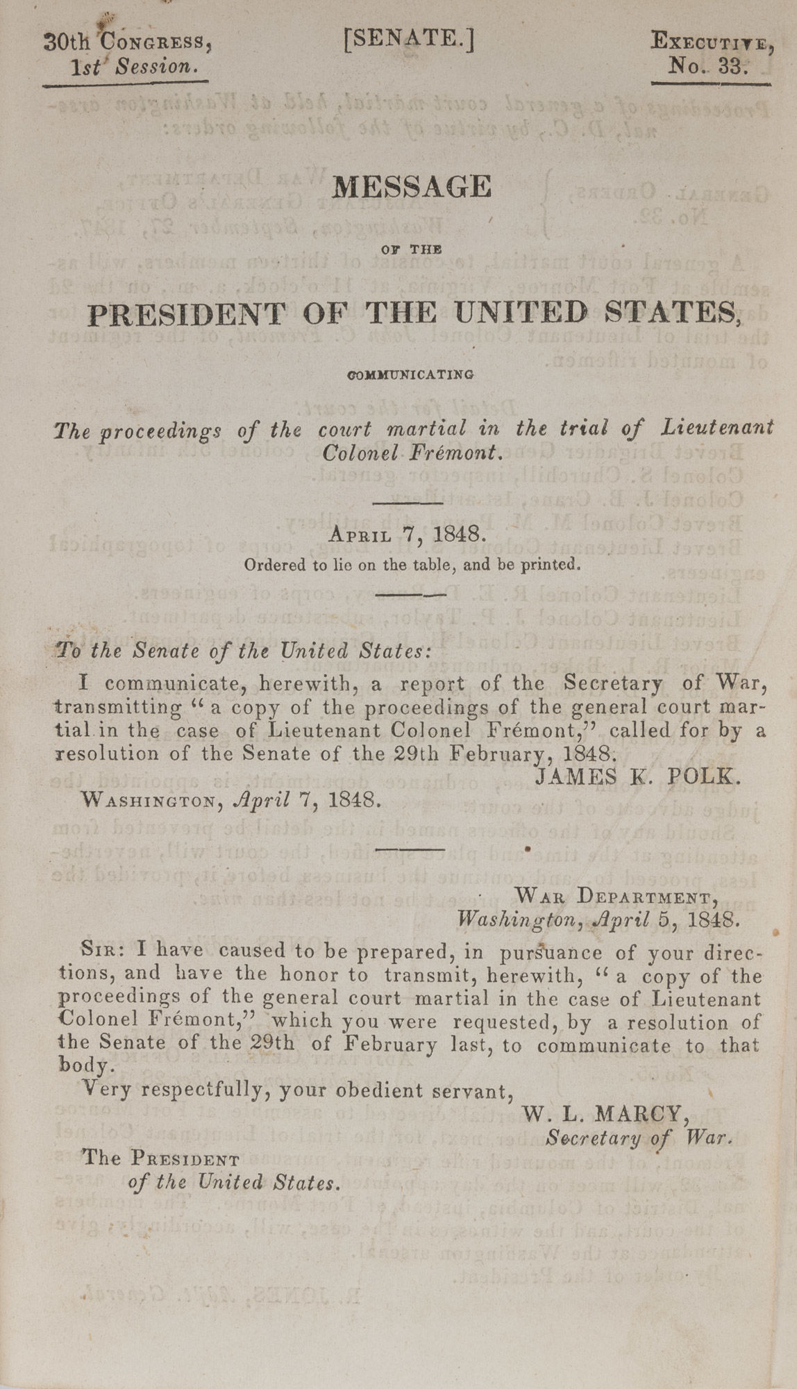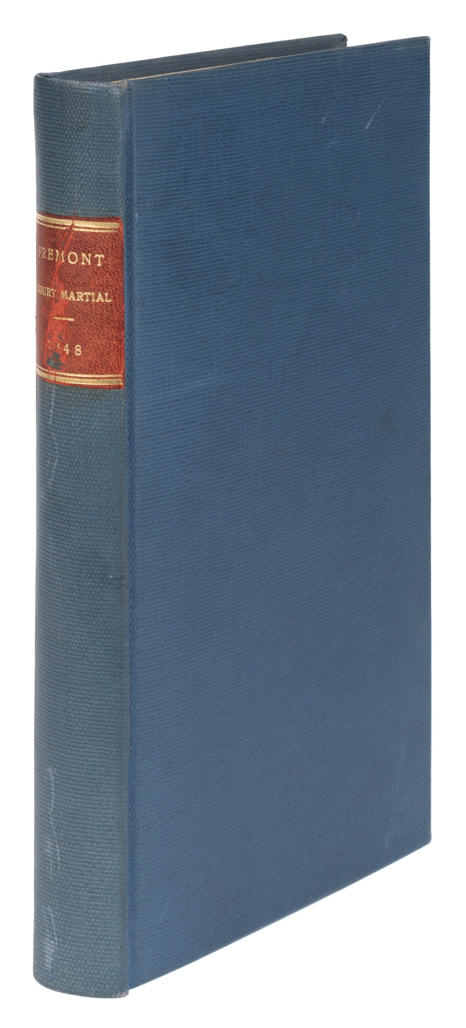 1848. [Washington?: 1848].. [Washington?: 1848]. Mutiny and Insubordination in California [Trial]. Fremont, John Charles [1813-1890], Defendant. Message of the President of the United States, Communicating the Proceedings of the Court Martial in the Trial of Lieutenant Colonel Fremont. [Washington?: 1848]. 447 pp. Octavo (8-3/4" x 5"). Recent library buckram, lettering piece to spine. A few negligible scratches to boards, nick to lettering piece. Moderate toning to interior, light foxing and soiling in a few places. $100. * Only edition. Fremont was an American explorer and politician with a long and somewhat controversial career. He had been appointed military governor of California by Commander Stockton near the end of the Mexican-American War, but was unable to discharge his duties fully. Stockton and General Stephen W. Kearney argued over who should succeed Fremont as governor. Fremont sided with Stockton, but Washington sided with Kearney. As revenge, Kearney arrested and court-martialed Fremont on charges of mutiny and insubordination. He was found guilty of disobedience and conduct prejudicial to order and resigned his commission. The sentence of dishonorable discharge was commuted by President Polk. Fremont went on to become a US Senator for California and was a Republican presidential candidate in 1856. Cohen, Bibliography of Early American Law 13498.