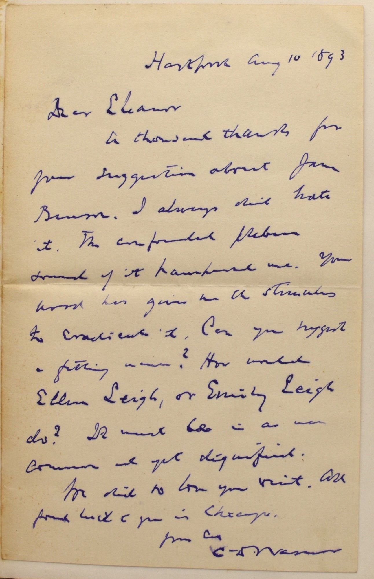New York: Harper & Brother, Printers & Publishers, 1895. First Edition. Three Quarters Leather. Good binding. Signed. 8vo; (7 1/2" x 5 1/8") rebound in 3/4 tan calf over marbled boards, with gilt rule to the edges; 346 pages, with frontispiece and other illustrations throughout; the front hinge has been very discreetly reinforced.~~Tipped in is an ALS from Charles Dudley Warner with interesting content, regarding the naming of a character in the book.. The letter is addressed to Eleanor Kilham, a person of interest in her own right. A medical doctor engaged in private practice in New York, at the outbreak of World War I she sailed for France on the first ship out after the sinking of the Lusitania. For her work in France, she received the Medaille d'Honneur and the Medaille de Reconaissance d'Honneur. After the war she devoted herself to welfare work in New York [see New York Times, April 6, 1937].~~The letter is dated Hartford, Aug. 10, 1893. It reads: "Dear Elenaor | A thousand thanks for | your suggestion about Jane | Brown. I always did hate | it. The confounded plebeian "| sound of it hampered me. Your | word has given me the stimulus " to eradicate it. Can you suggest | a fitting name? How would | Ellen Leigh or Emiliy Leigh | do? It must be [as un- | common] and yet dignified."~~The protagonist is in fact named Ruth Leigh, and one supposes that Eleanor Kilham had something to do with that.~~~~. Good binding.