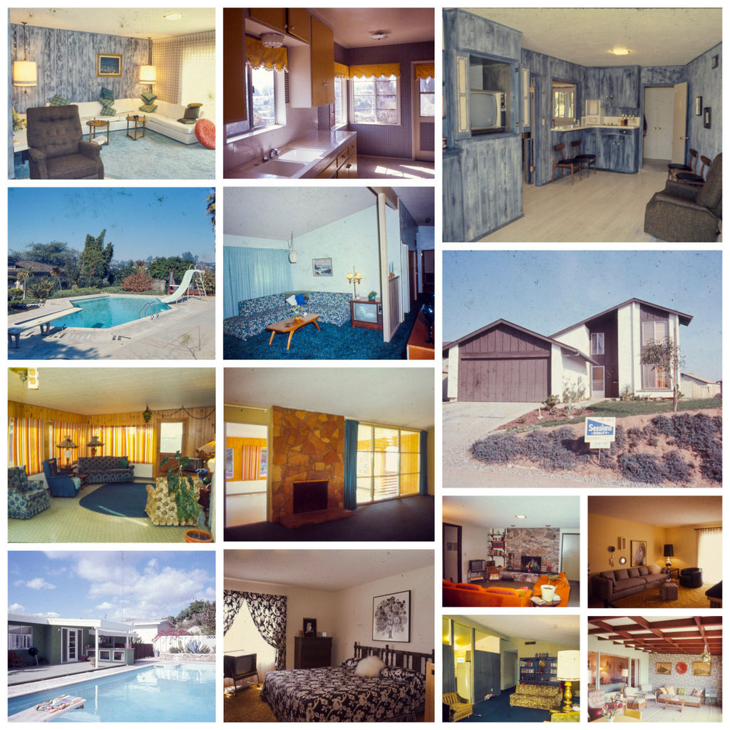 [San Diego, California]: n.p., 1972. Very good.. Before Zillow, Trulia, and Redfin: a swank archive of images from the Sessions Realty firm of La Mesa, California in the early 1970s. Consisting of hundreds of sales display slides (and negatives) of exteriors and interiors from San Diego-area homes (accompanied by more than 3 dozen descriptive forms listing home amenities, prices, descriptions, etc.), these images were undoubtedly used for marketing to prospective buyers. Shag carpet, macrame, orange and brown color palettes, rec rooms, bold wallpapers, Formica, wood paneling, and other Better Homes and Gardens details much in evidence — all exhibiting a strong Southern California flair. A dense, thorough, and vibrant assembly of period design and architecture offering a rich record of residential real estate in a significantly active market. And while the unknown photographer(s?) certainly wanted to simply document the houses, what emerges is a rather hauntingly mundane narrative where no real action takes place but yet something nevertheless lingers — like crime scene photographs, but without the crime. Vernacular Ruscha. 3 dust-proof binders measuring 12'' x 10.5''. Approximately 1300 color slides in new archival pages, with roughly 250 additional color film negatives, and 37 individual manuscript real estate listing forms. Slides approximately 2" square; negatives approximately 1 1/4" square. Slides with mild to moderate dusting, some with residue from previous rubber band wrappings, most with relevant ink notations to margins. Negatives fine, in glassine storage wrappers.