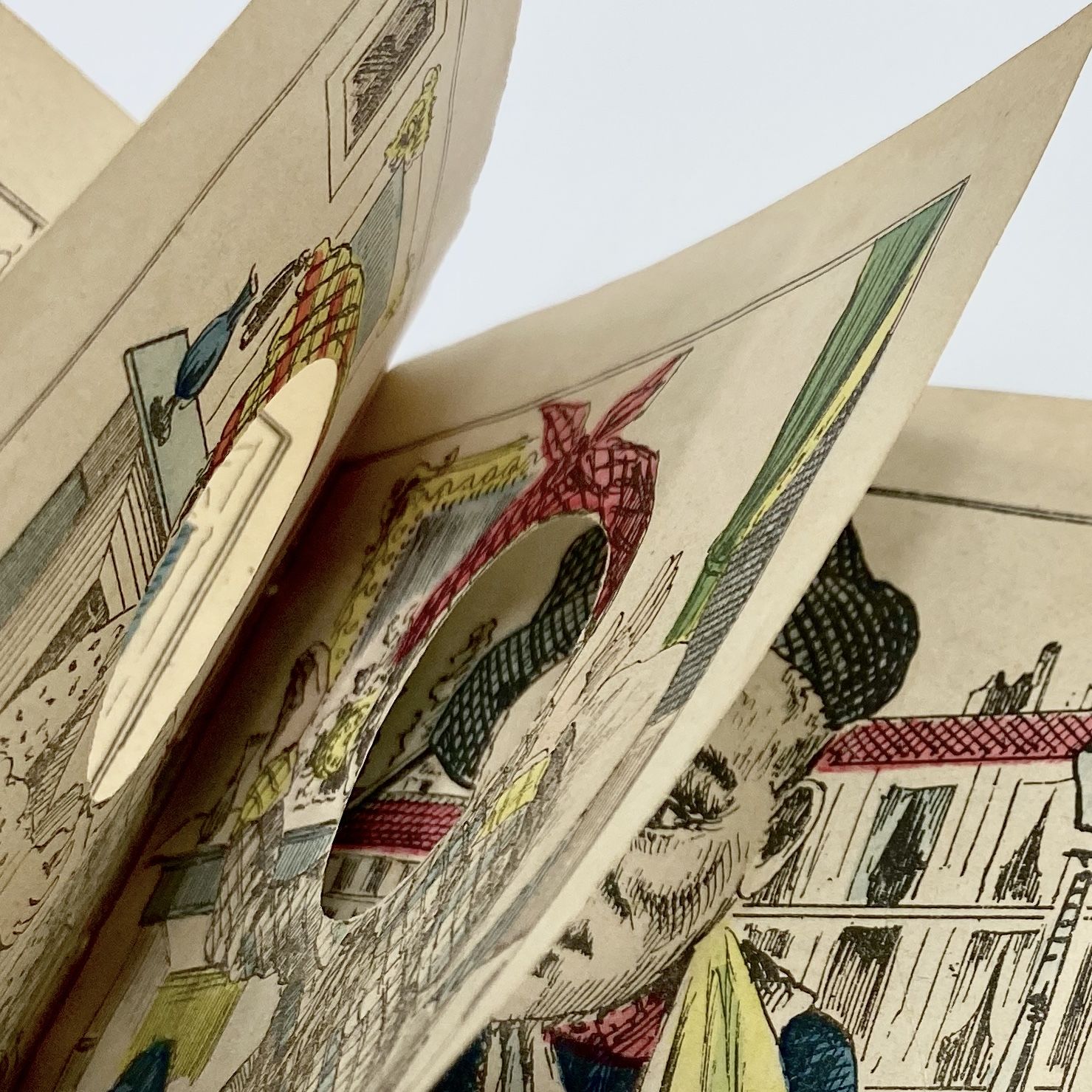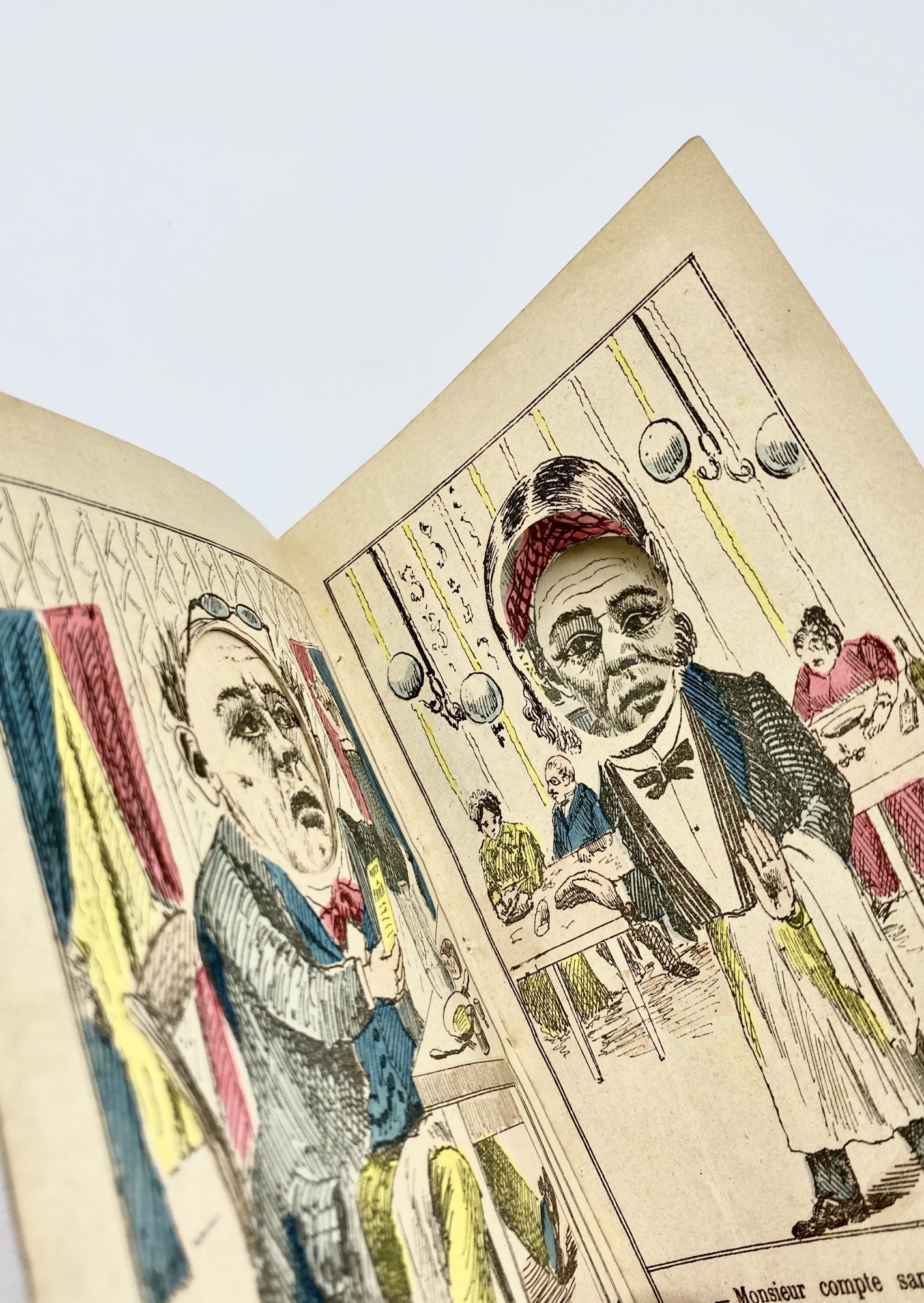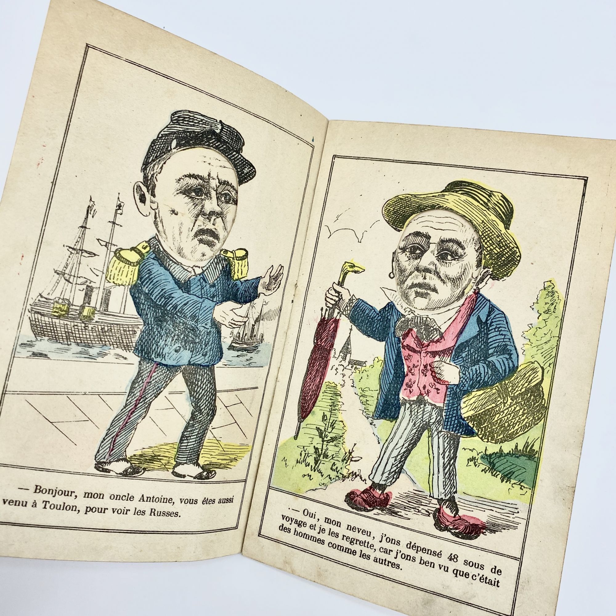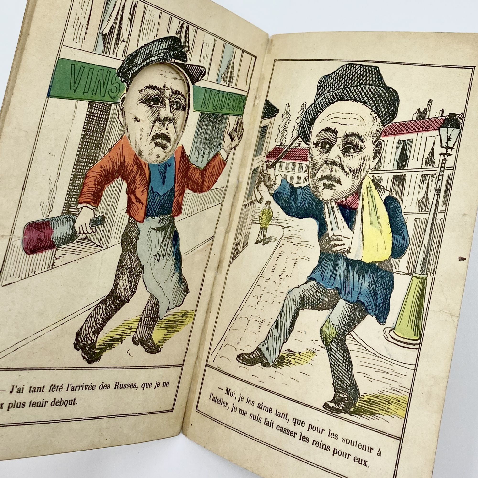 This book depicts a series of conversations between people commenting on the Russians' arrival at Toulon: a Frenchman and a Russian meeting again after sharing a drink in Kronstadt; a Frenchman swaying with a bottle of wine captioned [in translation], "I celebrated the arrival of the Russians so much that I can no longer stand"; a German bragging to an Italian (with stereotypical names) that "I would eat them in two mouthfuls, the French and the Russians," while the Italian replies, "I'm not that greedy, me, I'd be happy with a plate of macaroni." The face printed on the interior of each wrapper is visible throughout – each leaf has a head-shaped whole cut out so that all the figures are connected with the same face.