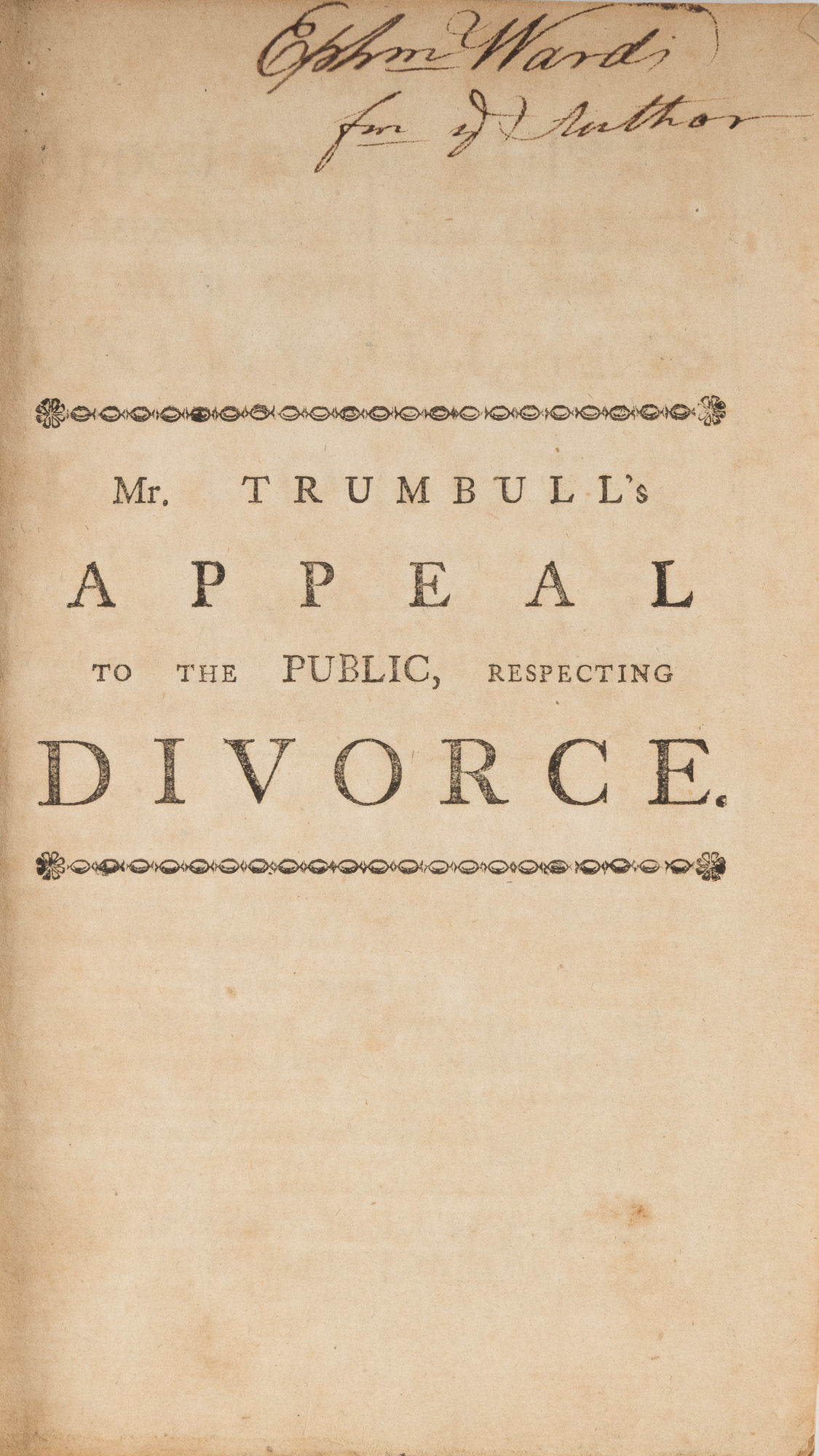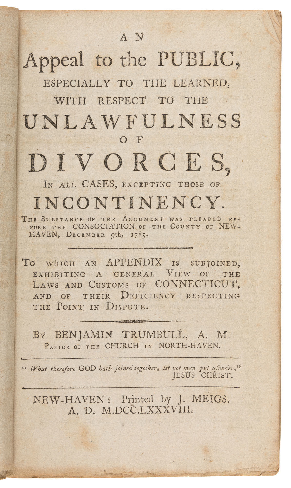 1788. Trumbull's 1788 Attack on Connecticut Divorce Law, An Author Presentation Copy Trumbull, Benjamin [1735-1820]. An Appeal to the Public, Especially to the Learned, With Respect to the Unlawfulness of Divorces, In All Cases, Excepting Those of Incontinency. The Substance of the Argument Was Pleaded Before the Consociation of the County of New-Haven, December 9th, 1785. To Which an Appendix is Subjoined, Exhibiting a General View of the Laws and Customs of Connecticut, And of Their Deficiency Respecting the Point in Dispute. New-Haven: Printed by J. Meigs, 1788. 53, [1] pp. Octavo (7-1/4" x 5"; 18.41 x 12.7 cm). Stab-stitched pamphlet in contemporary marbled wrappers. Light rubbing to wrappers and chipping to spine. Light toning to interior, light foxing in a few places. Inscription to head of half-title reading "Eph[rai]m Ward's / f[ro]m ye Author." An appealing copy. $500. * First edition. Trumbull, a Congregational minister, attacks the leniency of Connecticut's divorce laws and argues for their reform. With an argument based in scripture, Trumbull shows that divorces are "opposed to the authority of Jesus Christ." The text of his sermon is followed by an appendix which reviews contemporary Connecticut divorce laws and compares them to those of the other New England states, ancient Rome, the early Christian church and the Jews of the Old Testament. A second edition was published in 1819 with additional material by Timothy Dwight as What Therefore God Hath Joined Together, Let Not Man Put Asunder: An Appeal to the Public with Respect to the Unlawfulness of Divorces. The former owner of this copy was probably Ephraim Ward [1741-1818], a fellow minister from Brookfield, Massachusetts. Cohen, Bibliography of Early American Law 4788.