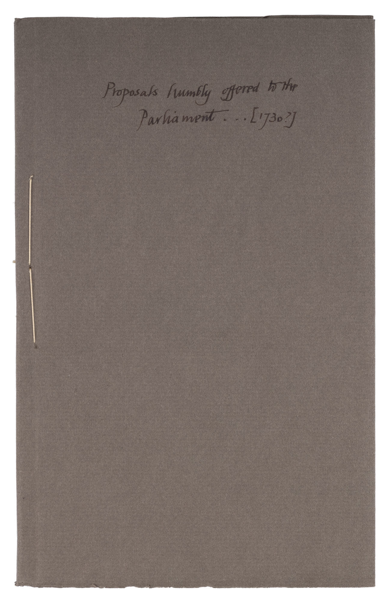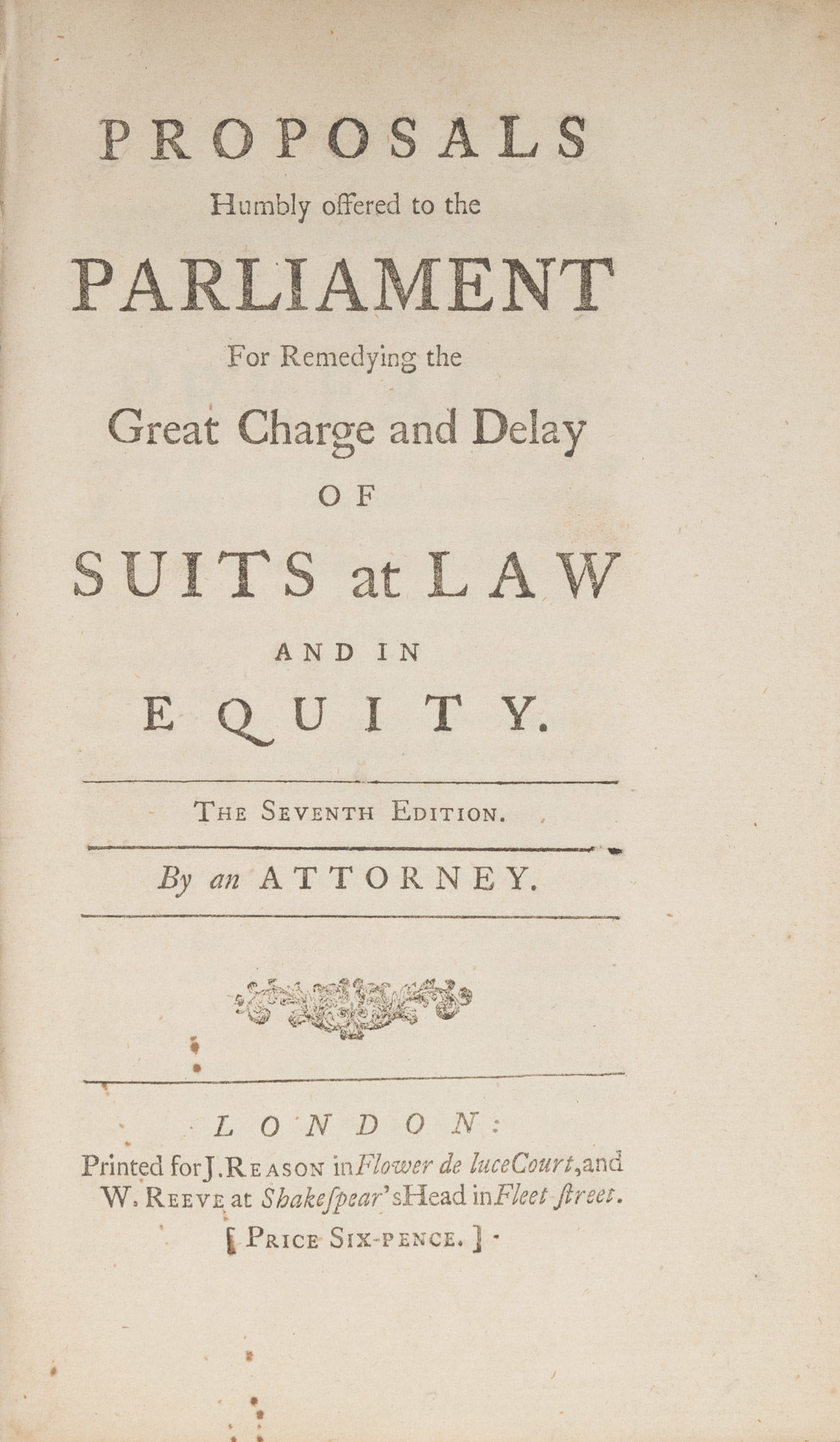 1730. Proposals for Chancery Reform An Attorney. Proposals Humbly Offered to the Parliament for Remedying the Great Charge and Delay of Suits at Law and in Equity. London: Printed for J. Reason and W. Reeve, [1730?]. [ii], iv, 42 pp. Octavo (8" x 4-3/4"). Stab-stitched pamphlet in recent plain wrappers, ink title and date to front wrapper. Light toning to interior, negligible light foxing to a few leaves, later annotations in pencil to pp. 31 and 39 with light offsetting to facing pages. $450. * Seventh edition. Chancery reform was a perennial topic in Great Britain, from the early seventeenth century until the court's dissolution as an independent body in 1875. The length of the debate is reflected in our pamphlet's numerous editions, the first of which appeared in 1707. The reforms suggested here primarily encompass the elimination of waste, such as reducing the number of offices and carrying out an audit of staff salaries. The preface gives a brief overview of the issue of judicial reform, with a notably antisemitic digression discussing the role of the "Infidel Jews" in the problems plaguing the English system. English Short-Title Catalogue T42985.