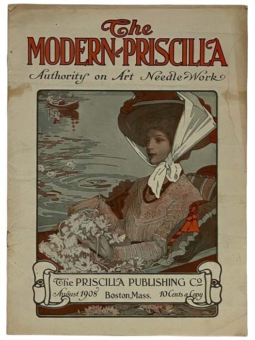Boston, Massachusetts: The Priscilla Publishing Company, 1908. Stapled Binding. Good. Button, A.P. (cover). Stained, some creases. 1908 Stapled Binding. 23 pp. Cover art by A.P. Button. Contents include articles on building and remodeling small houses, woman's part in the feather goods industry, neck garniture, stencil designs for costume decoration, Swiss crochet, embroidered frock, summer embroideries for little people, embroidered bags, needlework for hat and waists, two hammock pillows, picnic spread, dress accessories, practical lingerie for the tourist, and more. Ads and illustrations throughout. Modern Priscilla (1887-1930) began at Lynn, Massachusetts, as a 16-page quarto devoted to fancy work, dress patterns, china painting, and needlework in general, at fifty cents a year. In 1894 it was moved to Boston, and eventually it was enlarged in scope to cover many other aspects of women's home life. It absorbed Everyday Housekeeping in March 1912, and Home Needlework Magazine in May 1917. The last issue was July 1930, after which it apparently merged into Needlecraft.