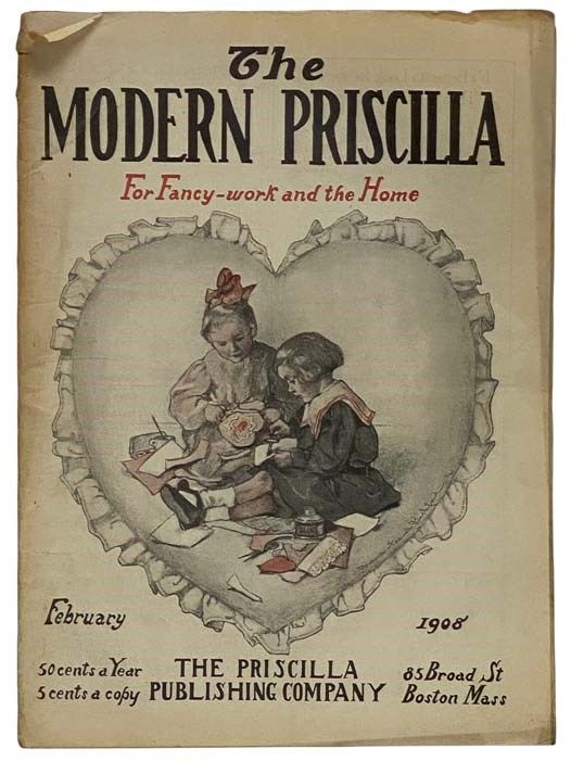 Boston, Massachusetts: The Priscilla Publishing Company, 1908. Stapled Binding. Good. Bickford, Nana French (cover). Wrapper edges rubbed, front wrapper lightly toned, one inch tear on page 19/20. 1908 Stapled Binding. 34 pp. Cover art by Nana French Bickford. Contents include articles on Russian lace and drawn work, seasonable articles in knitting and crochet, cetrepiece in Mexican drawn work, stenciled curtains designs, handkerchiefs in point and honiton braids, Wallachian embroidery, child's hat and dress, hot puddings, embroidery designs for spring suits, waists, hat, and parasols, fancy stocks, embroidered tray cloth and centrepiece, embroideries for little folks, sofa pillows, Priscilla paper patterns, crochet doily, and more. Ads and illustrations throughout. Modern Priscilla (1887-1930) began at Lynn, Massachusetts, as a 16-page quarto devoted to fancy work, dress patterns, china painting, and needlework in general, at fifty cents a year. In 1894 it was moved to Boston, and eventually it was enlarged in scope to cover many other aspects of women's home life. It absorbed Everyday Housekeeping in March 1912, and Home Needlework Magazine in May 1917. The last issue was July 1930, after which it apparently merged into Needlecraft.
