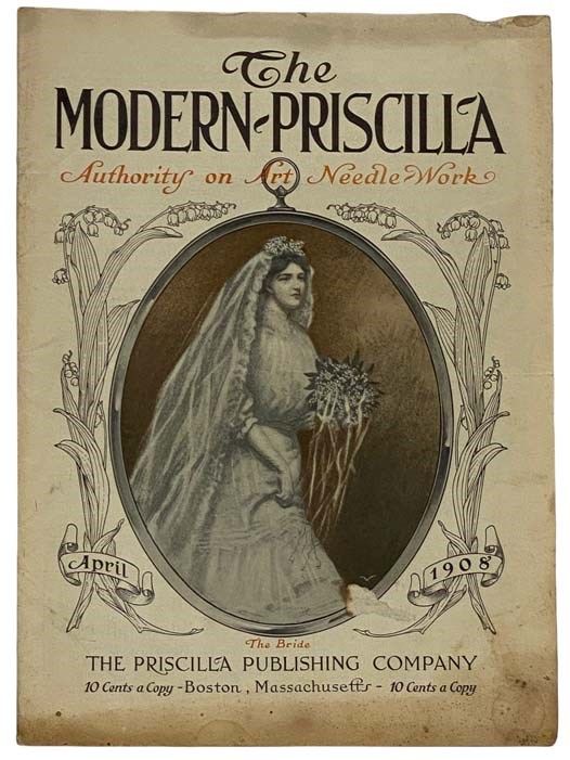 Boston, Massachusetts: The Priscilla Publishing Company, 1908. Stapled Binding. Good. Surface tear on front wrapper, stained, top edge chewed. 1908 Stapled Binding. 38 pp. Contents include articles on bridal luncheon, embroideries for the bedroom, letters and monograms for marking linen, lace and embroidery for bridal gowns, lace garnitures, embroidered hat and apron, artistic stichery for the bridal trousseau, Priscilla paper patterns, lace curtains, hand-made blouses, bridal hints, embroidered domestic linens, place cards, wedding spreads, helps for housekeepers, dainty neckwear, pillows in coronation cord, and more. Ads and illustrations throughout. Modern Priscilla (1887-1930) began at Lynn, Massachusetts, as a 16-page quarto devoted to fancy work, dress patterns, china painting, and needlework in general, at fifty cents a year. In 1894 it was moved to Boston, and eventually it was enlarged in scope to cover many other aspects of women's home life. It absorbed Everyday Housekeeping in March 1912, and Home Needlework Magazine in May 1917. The last issue was July 1930, after which it apparently merged into Needlecraft.