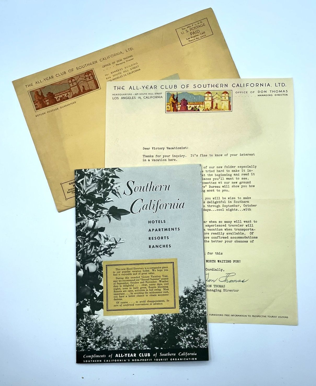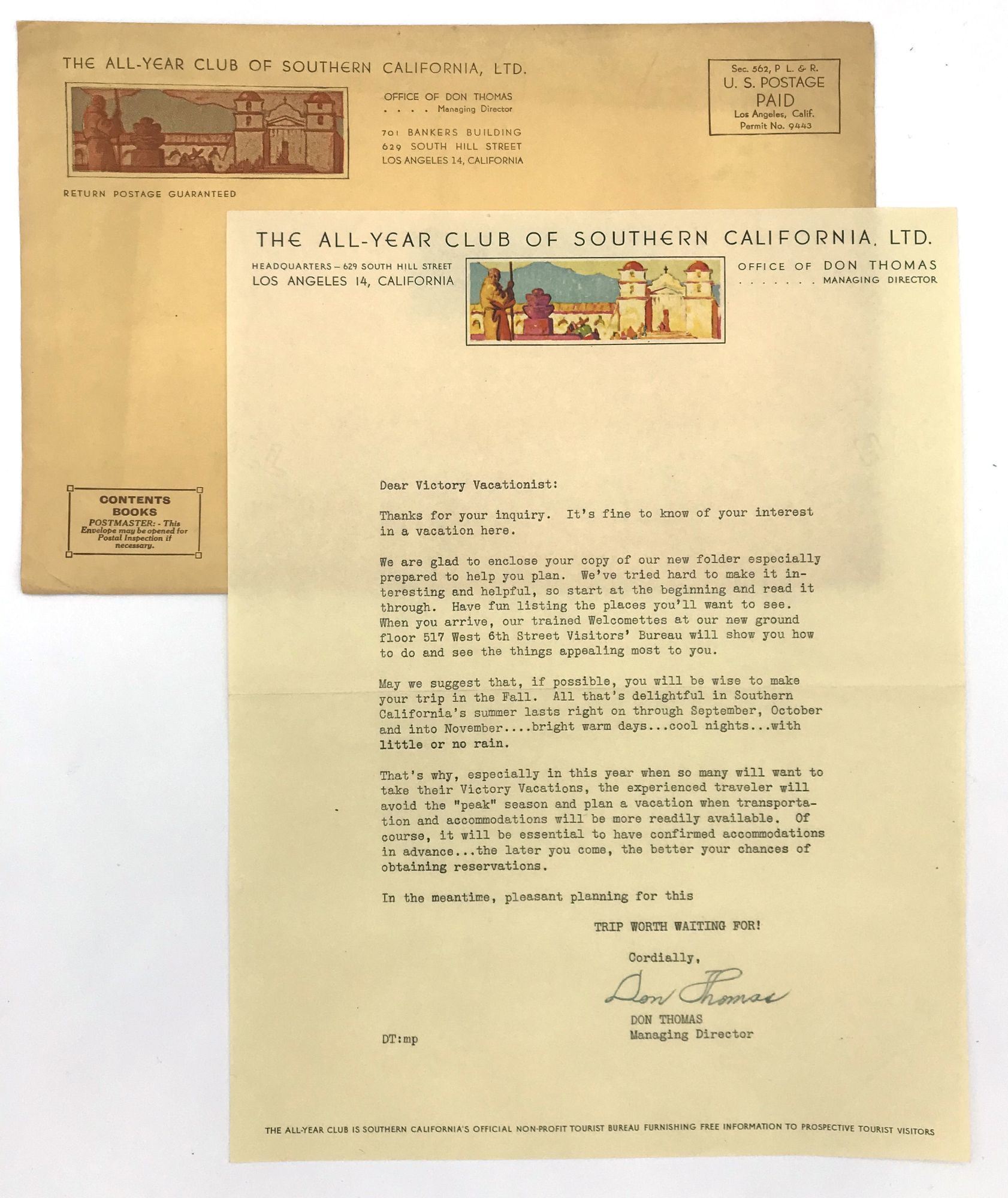 Los Angeles, California, 1945. Fine to very fine.. Typewritten letter (11" by 8.5") from Don Thomas, Managing Director of The All-Year Club of Southern California, on letterhead with original envelope responding to a prospective customer's interest in receiving promotional materials. He addresses the letter to "Victory Vacationist", highlighting the Club's push to market Los Angeles as a destination for young servicemen and their wives looking for fun and frivolity after WWII. The Club was started in the 1920s, and was tasked with "selling" Los Angeles as a tourist destination for young people. "Victory Vacationist" is urged to consider making the trip in the Fall, when there are "bright warm days" and "cool nights" with "little or no rain", and to make plans early.