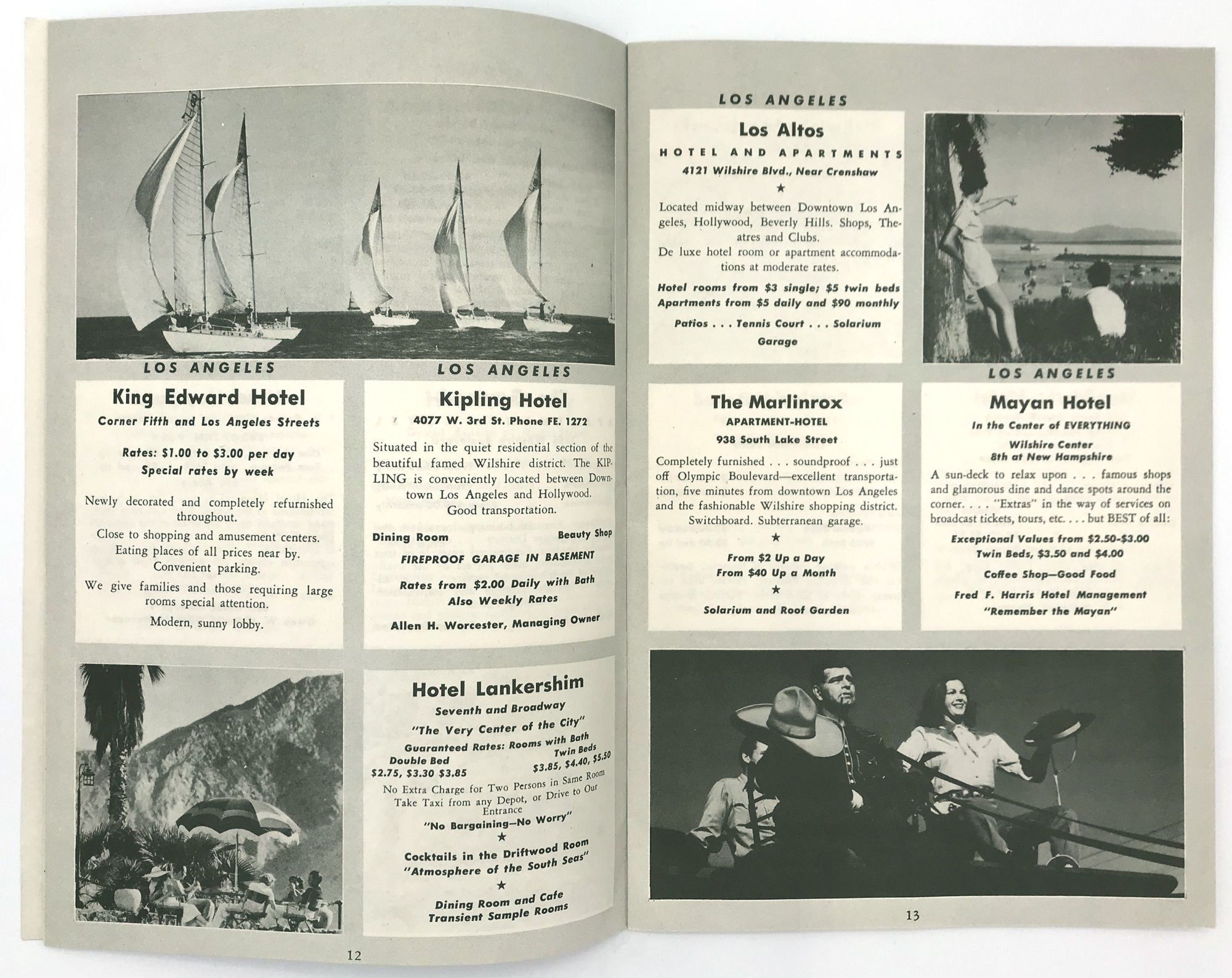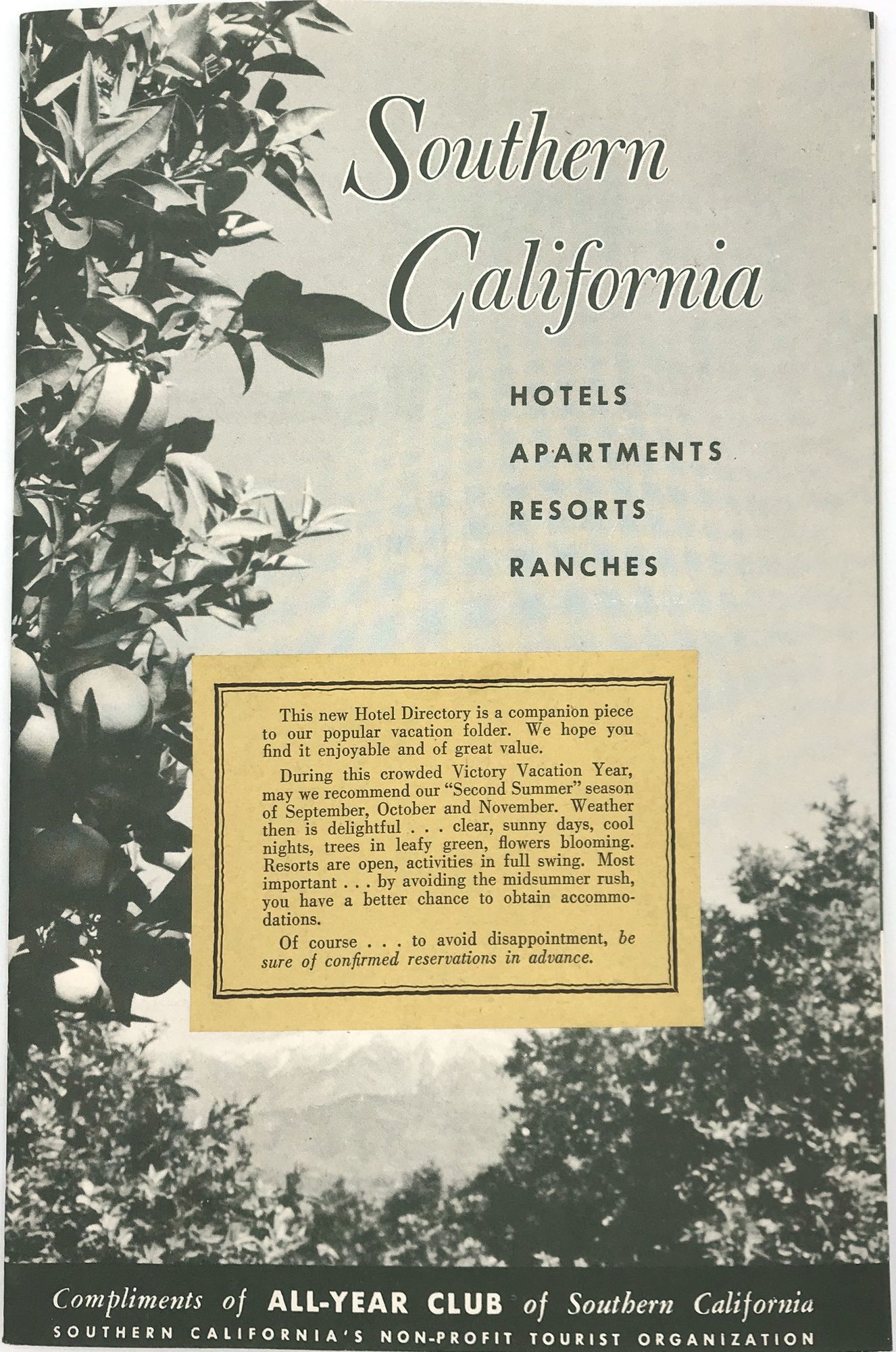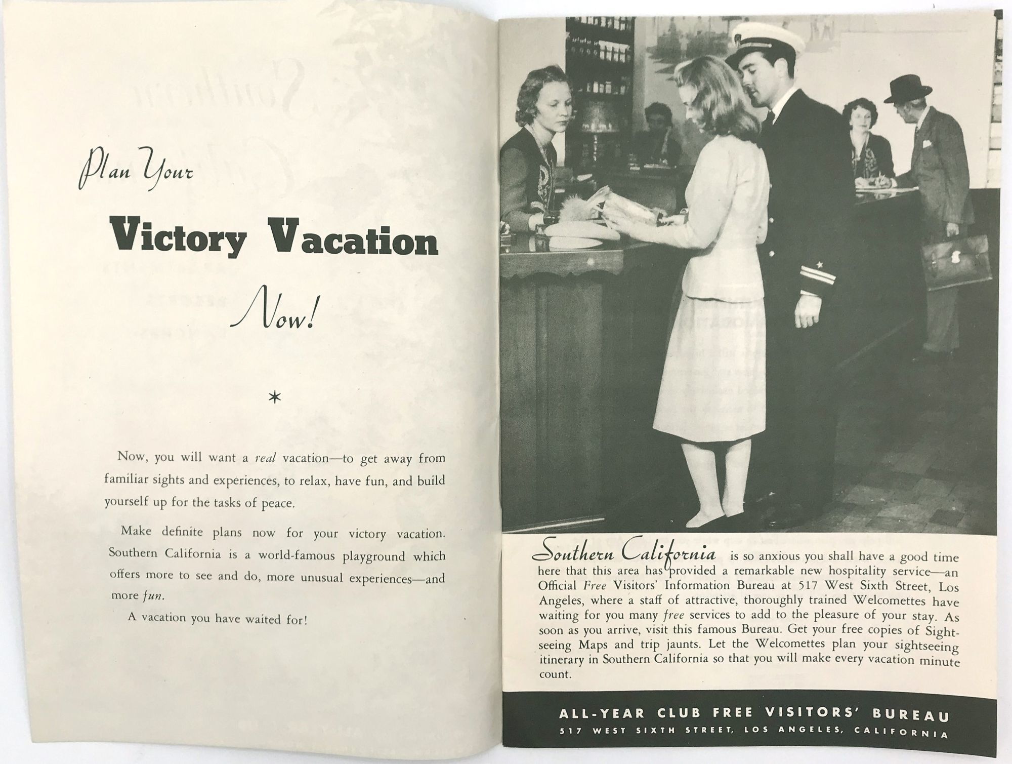 The Tourism brochure from 1945 advertising hotels and tourist attractions in Southern California during the "Victory Vacation Year" following WWII: "Plan your Victory Vacation Now!" (upper wrapper verso). Young couples--men still in their military garb--frolic throughout the brochure's photographs, engaging in activities such as surfing, sailing, alligator wrestling (yes, it's true, see p. 15), sightseeing, and horseback riding. Hotels, apartments, ranches and resorts are listed throughout the with prices and amenities. One full-page map (p. 6) and one illustrated map as a double-page spread (pp. 16-17). The All-Year Club of Southern California was started in the 1920s, and was tasked with "selling" Los Angeles as a tourist destination; it marketed the city as a hot spot for young people.
