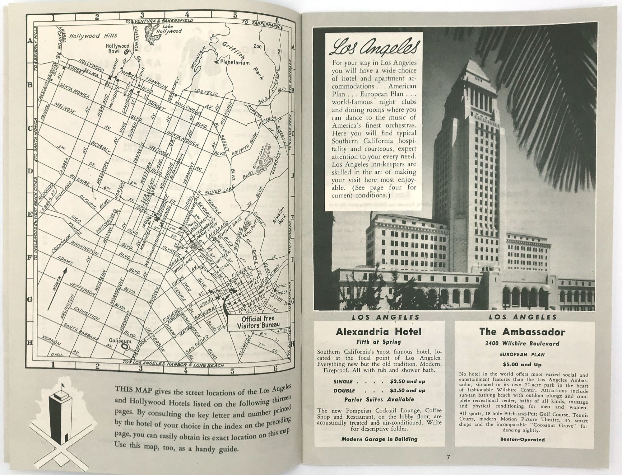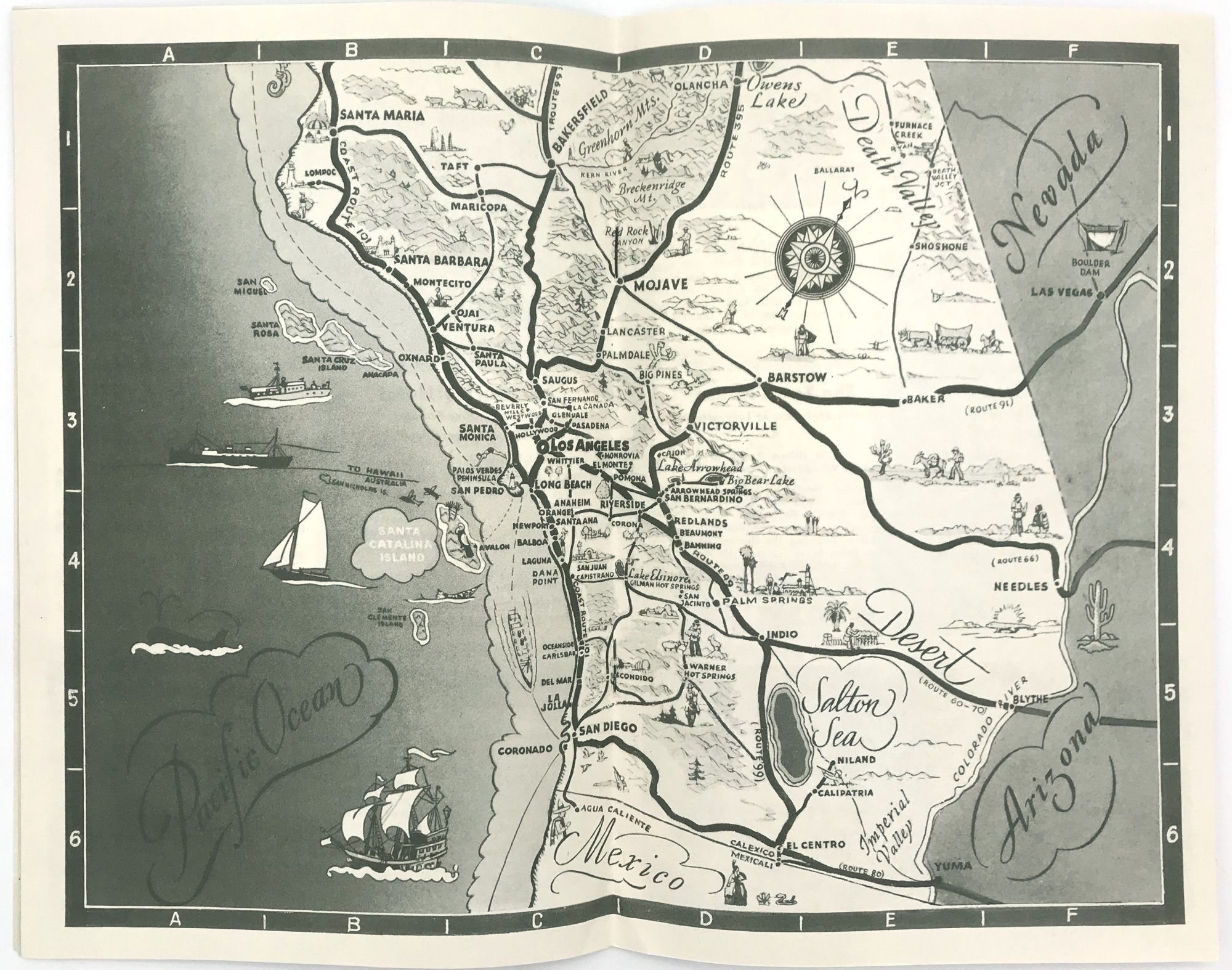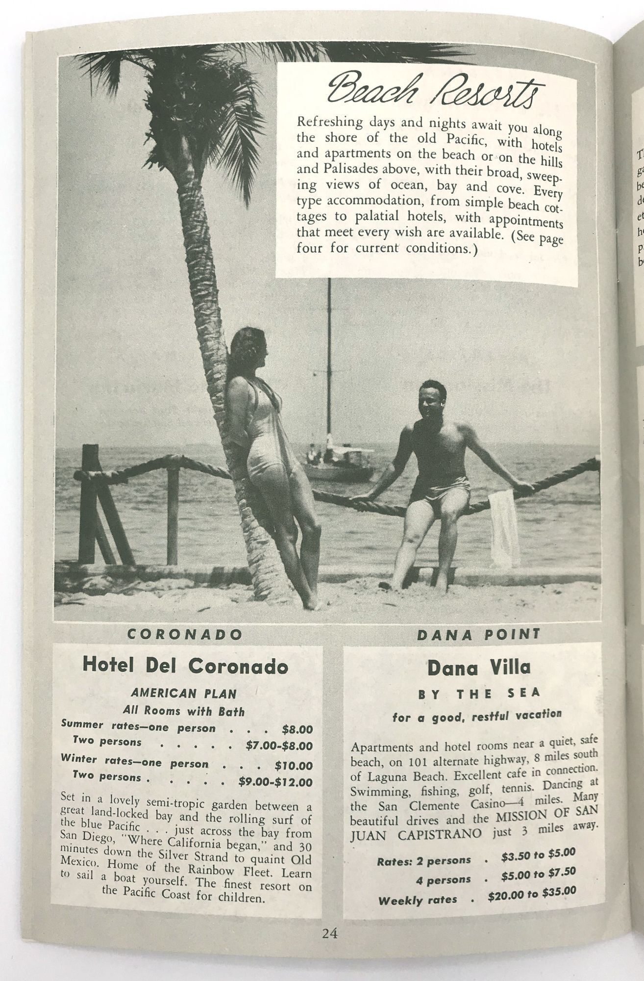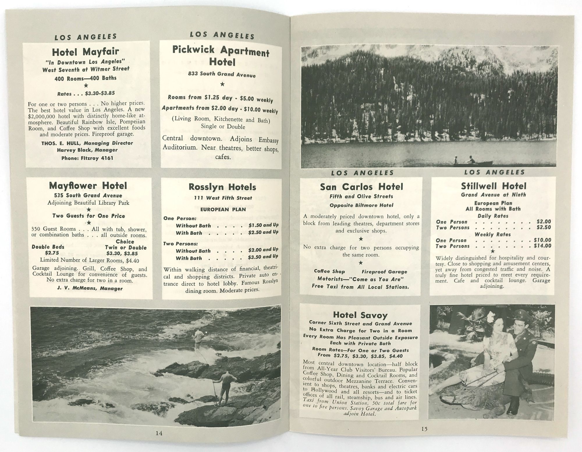 The Tourism brochure from 1945 advertising hotels and tourist attractions in Southern California during the "Victory Vacation Year" following WWII: "Plan your Victory Vacation Now!" (upper wrapper verso). Young couples--men still in their military garb--frolic throughout the brochure's photographs, engaging in activities such as surfing, sailing, alligator wrestling (yes, it's true, see p. 15), sightseeing, and horseback riding. Hotels, apartments, ranches and resorts are listed throughout the with prices and amenities. One full-page map (p. 6) and one illustrated map as a double-page spread (pp. 16-17). The All-Year Club of Southern California was started in the 1920s, and was tasked with "selling" Los Angeles as a tourist destination; it marketed the city as a hot spot for young people.