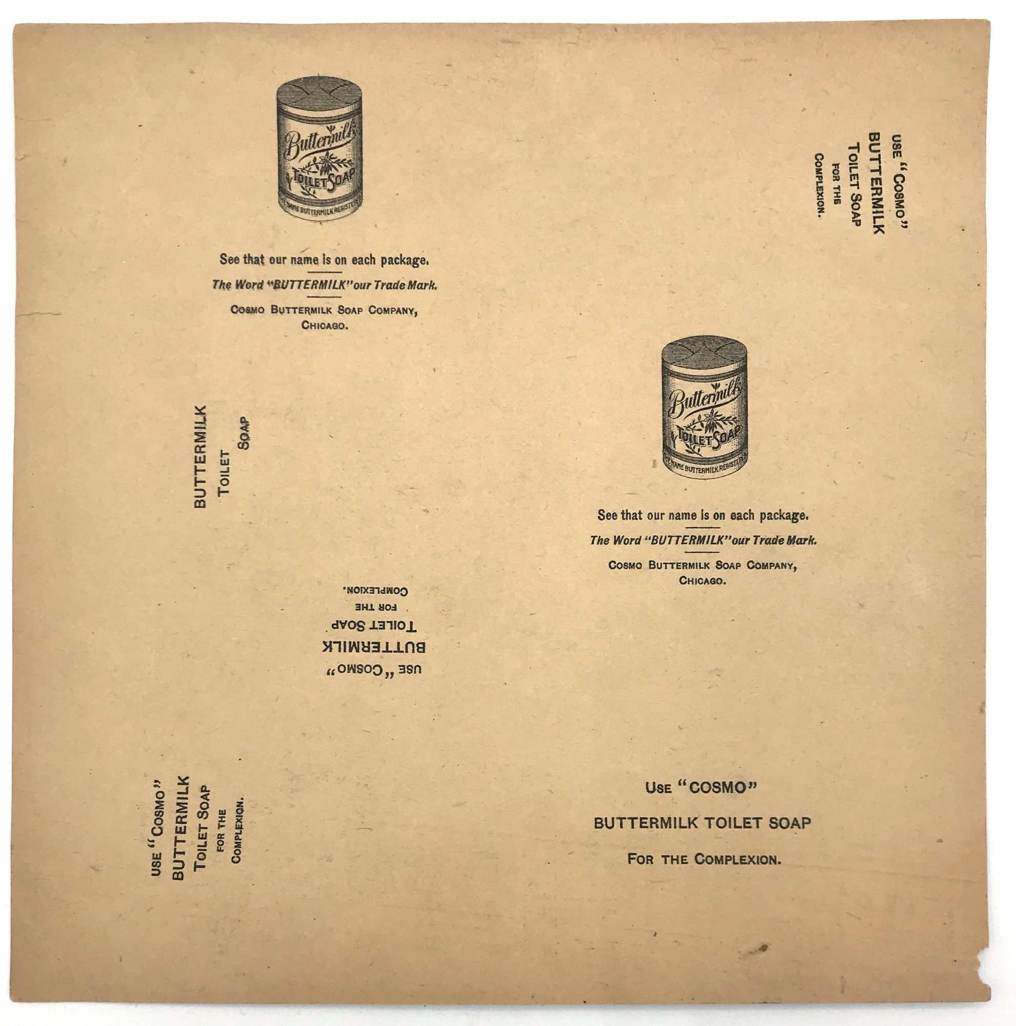 Philadelphia: Ketterlinus, 1895. Fine.. Uncut sheet (7" by 7"), chromolithograph with foldable furniture for a doll house dining room. Produced by Cosmo Buttermilk Soap Co., it was part of a promotion wherein the customer would send in proof of purchase in exchange for one such dollhouse sets. Each piece promotes a Buttermilk Soap product on the reverse.