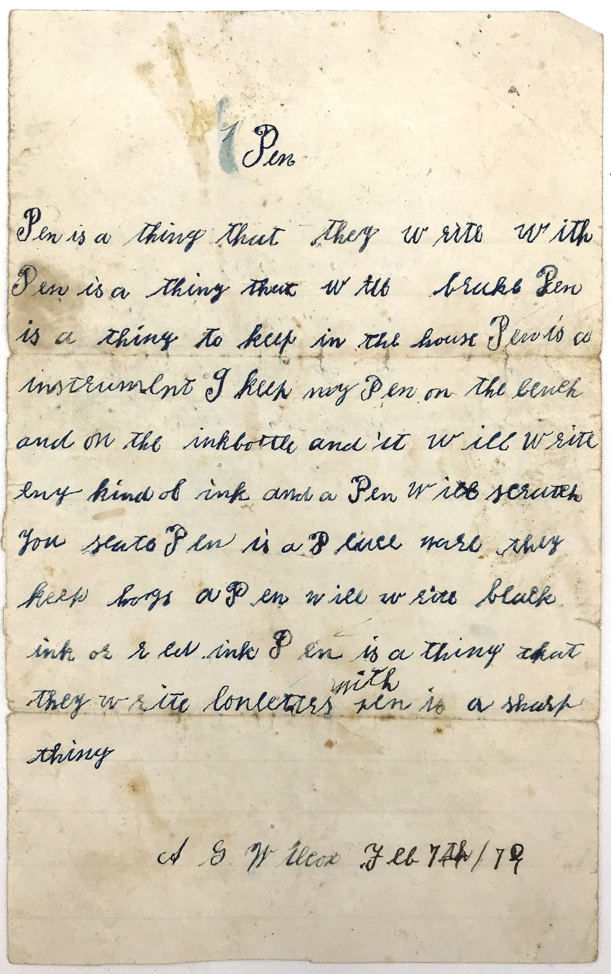 [West Virginia?], 1914. Very good to fine; some light toning and dust soiling, creased where previously folded.. A charming original manuscript poem in blue ink titled "Pen", signed by A.G. Wilcox: "Pen is a thing that they write with Pen is a thing that will brake[sic] Pen is a thing to keep in the house..." Concludes with "Pen is a thing that they write loveletter [sic] with. Pen is a sharp thing"